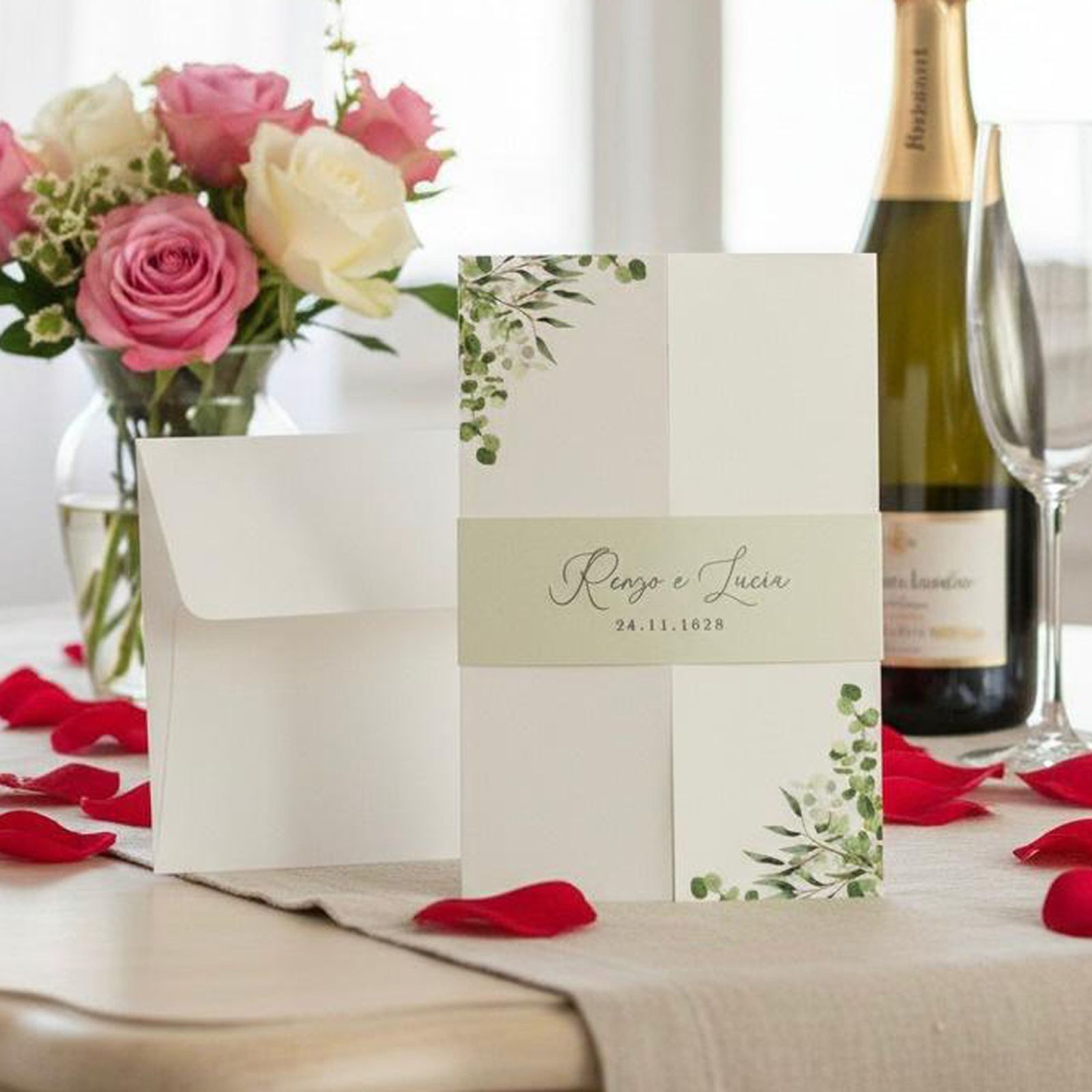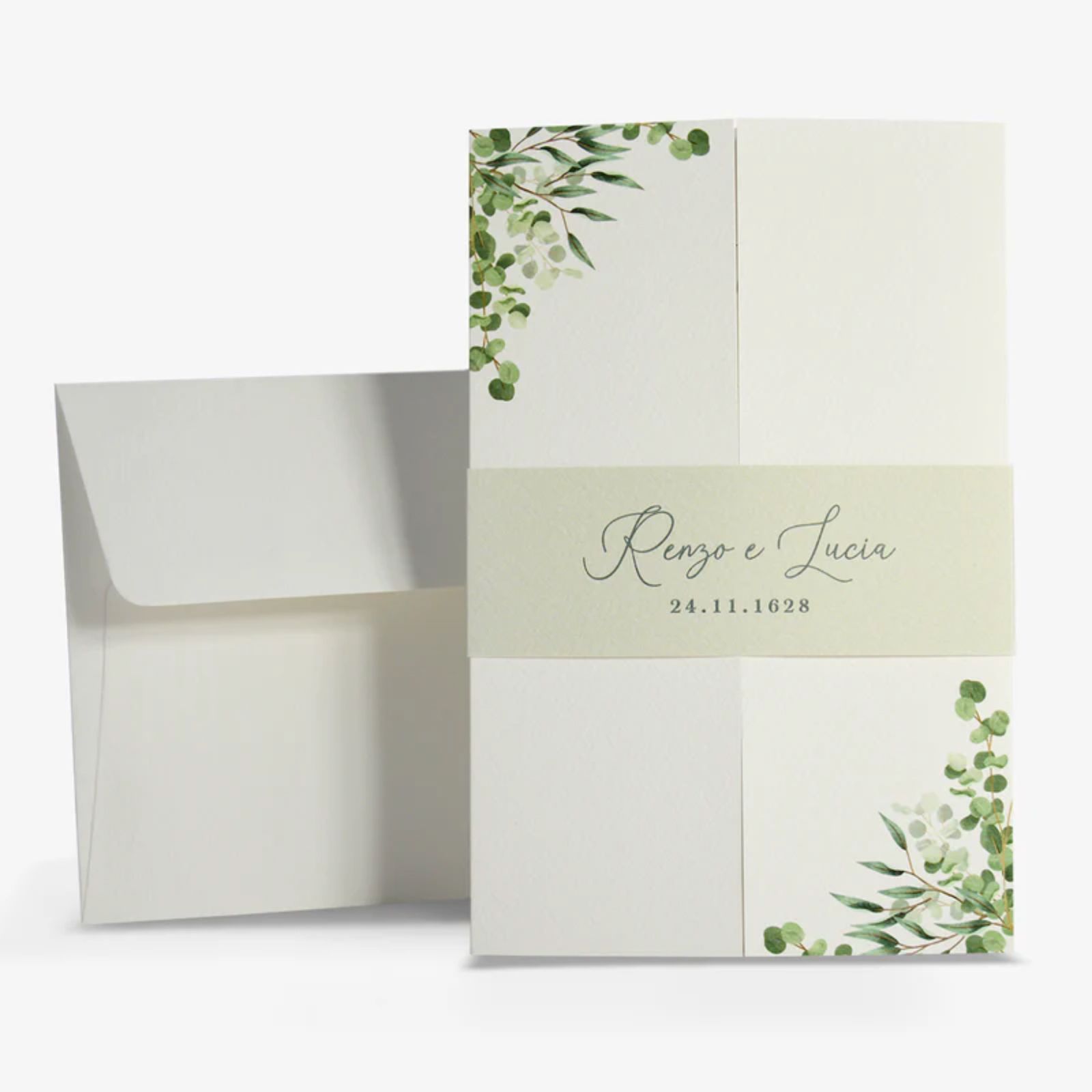 Realizzata in cartoncino di alta qualità con una delicata finitura martellata panna, questa partecipazione presenta una stampa di foglie acquerello nei toni del verde, che evoca freschezza e natura. L'apertura a finestra offre un tocco di originalità, mentre la chiusura con fascia personalizzata in verde, su cui verranno impressi i nomi degli sposi e la data del matrimonio, aggiunge un elemento di esclusività al vostro invito personalizzato.