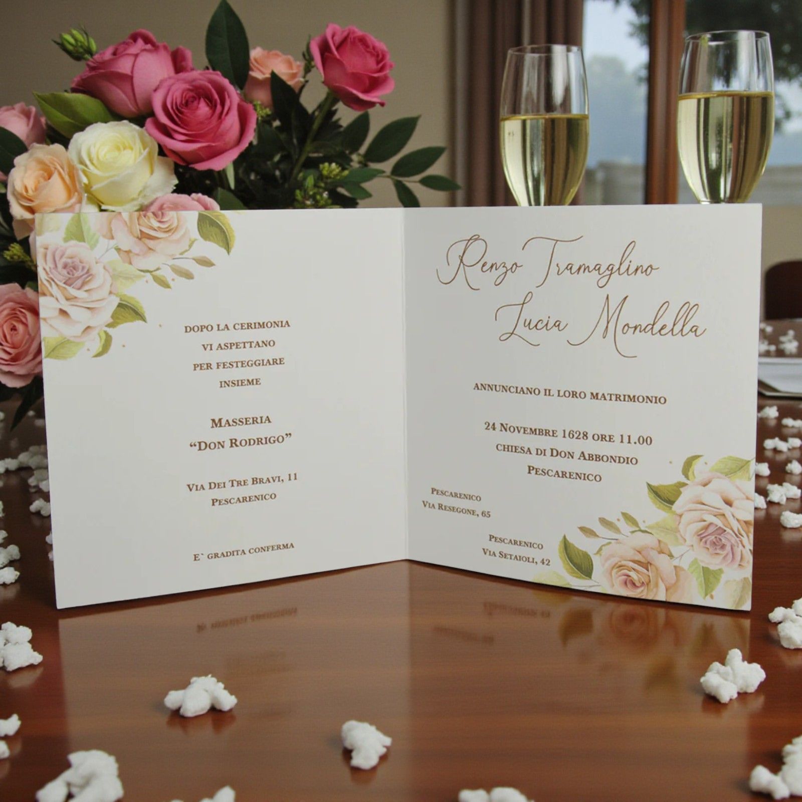 La nostra partecipazione è realizzata in raffinato cartoncino martellato panna, che conferisce una sensazione di autenticità e qualità. La combinazione di colori tenui, come il rosa, l'oro e il verde, è perfetta per ogni matrimonio, creando un'atmosfera romantica e accogliente. L'invito è progettato con un formato libro: all'interno la parte destra ospita l'invito per la chiesa, mentre la parte sinistra può essere personalizzata per l'invito al ristorante, al taglio torta, o lasciata vuota, a seconda delle vostre esigenze.