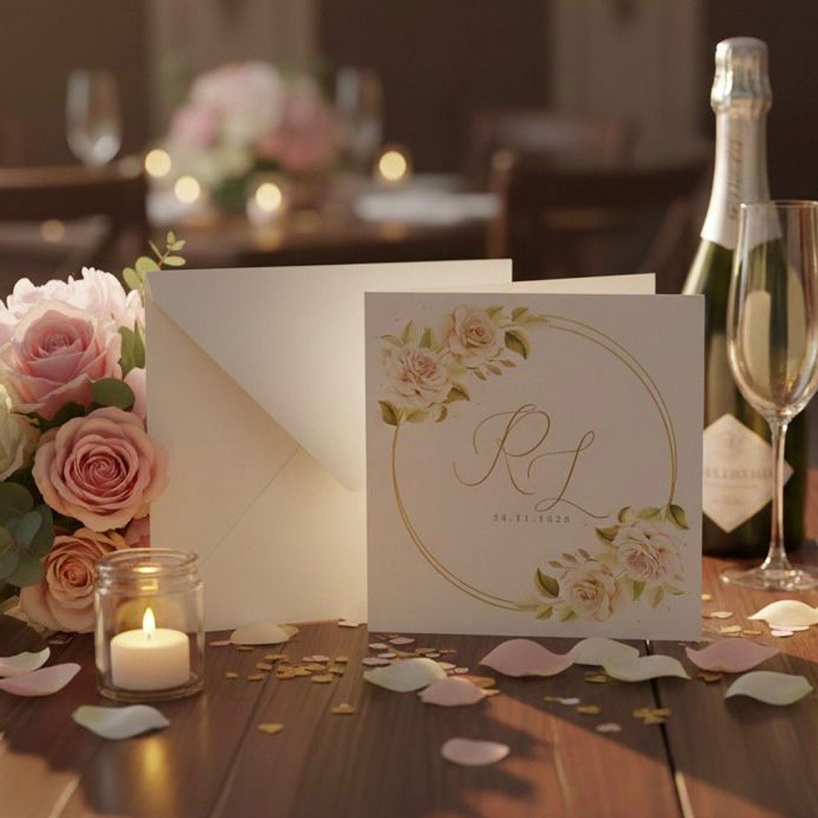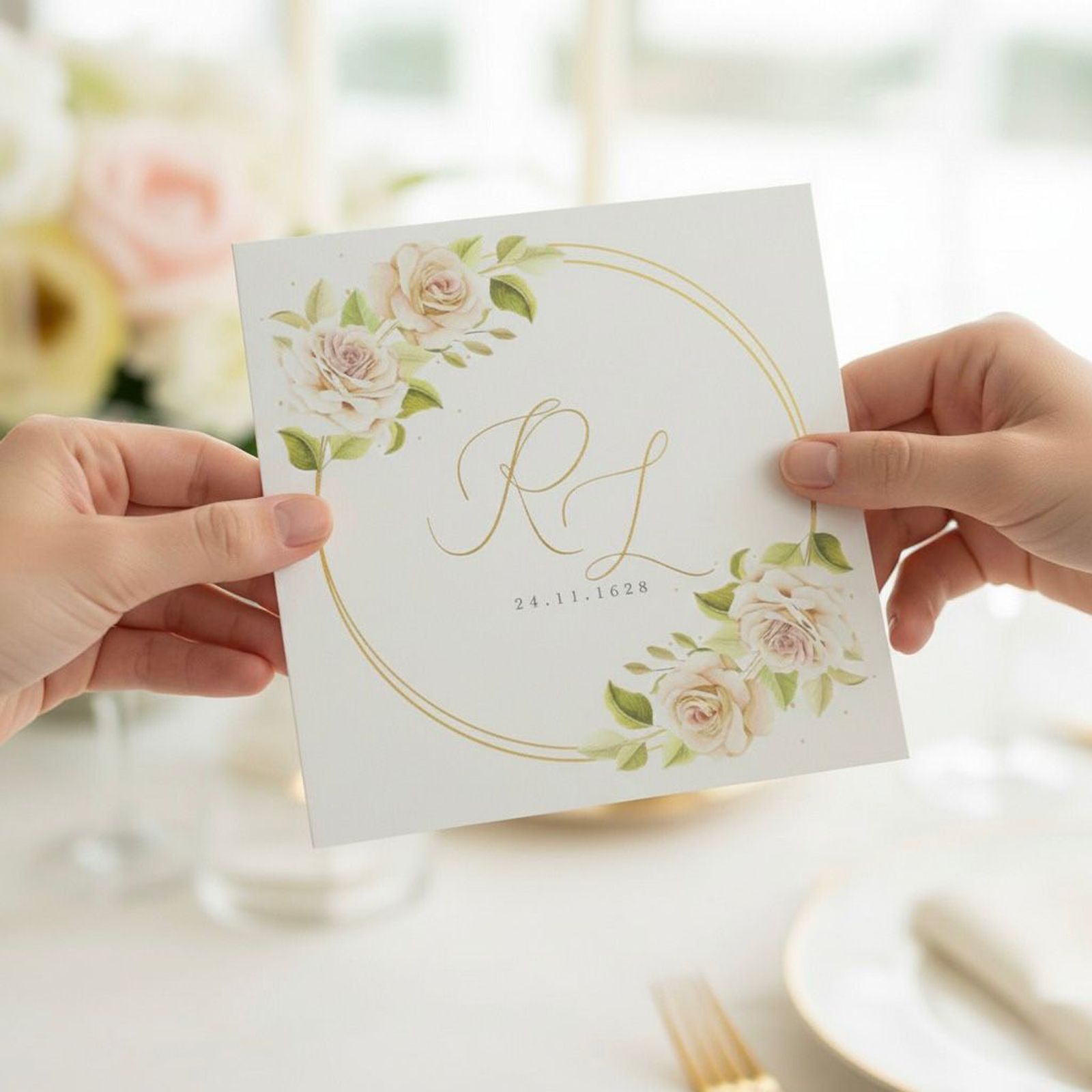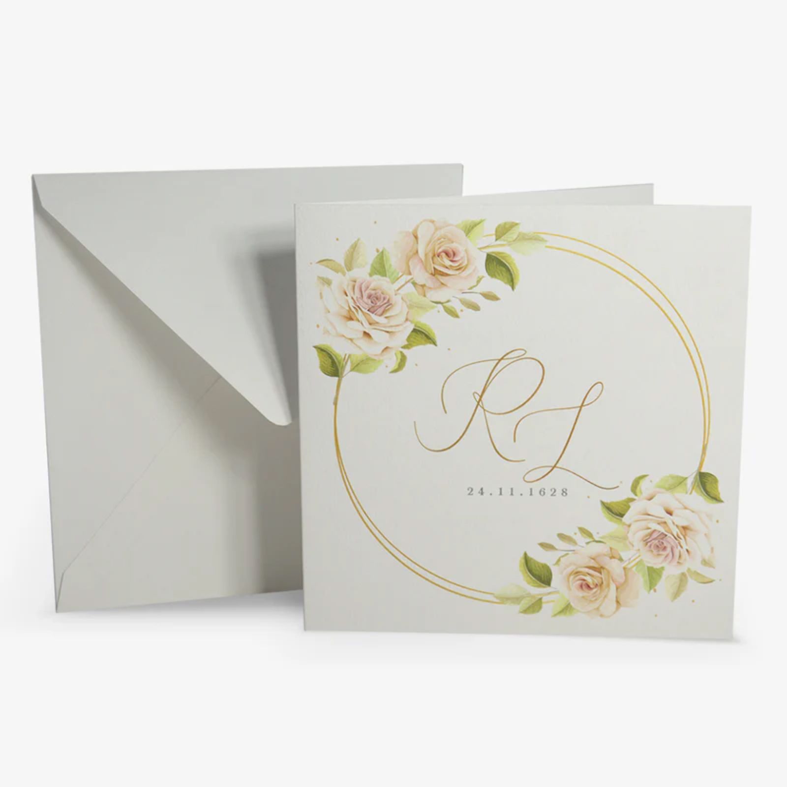 Rendi il tuo giorno speciale ancora più indimenticabile con il nostro elegante invito di matrimonio quadrato, impreziosito da un raffinato motivo floreale. Ogni partecipazione è una celebrazione dell'amore, un abbraccio cartaceo che invita amici e parenti a condividere momenti unici con gli sposi. Le iniziali degli sposi e la data del matrimonio stampate con cura sul fronte donano un tocco personale, rendendo ogni invito non solo un documento, ma un ricordo prezioso, decorato con fiori rosa e un cerchio dorato.