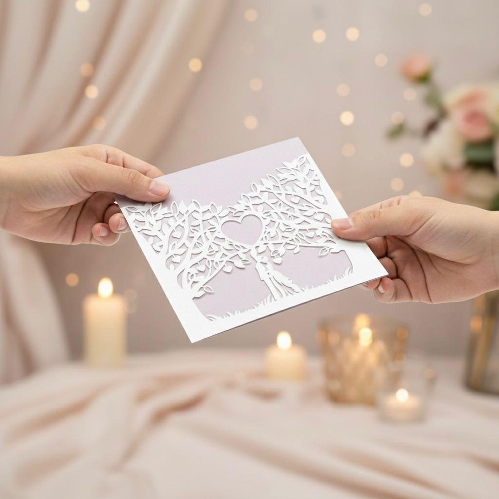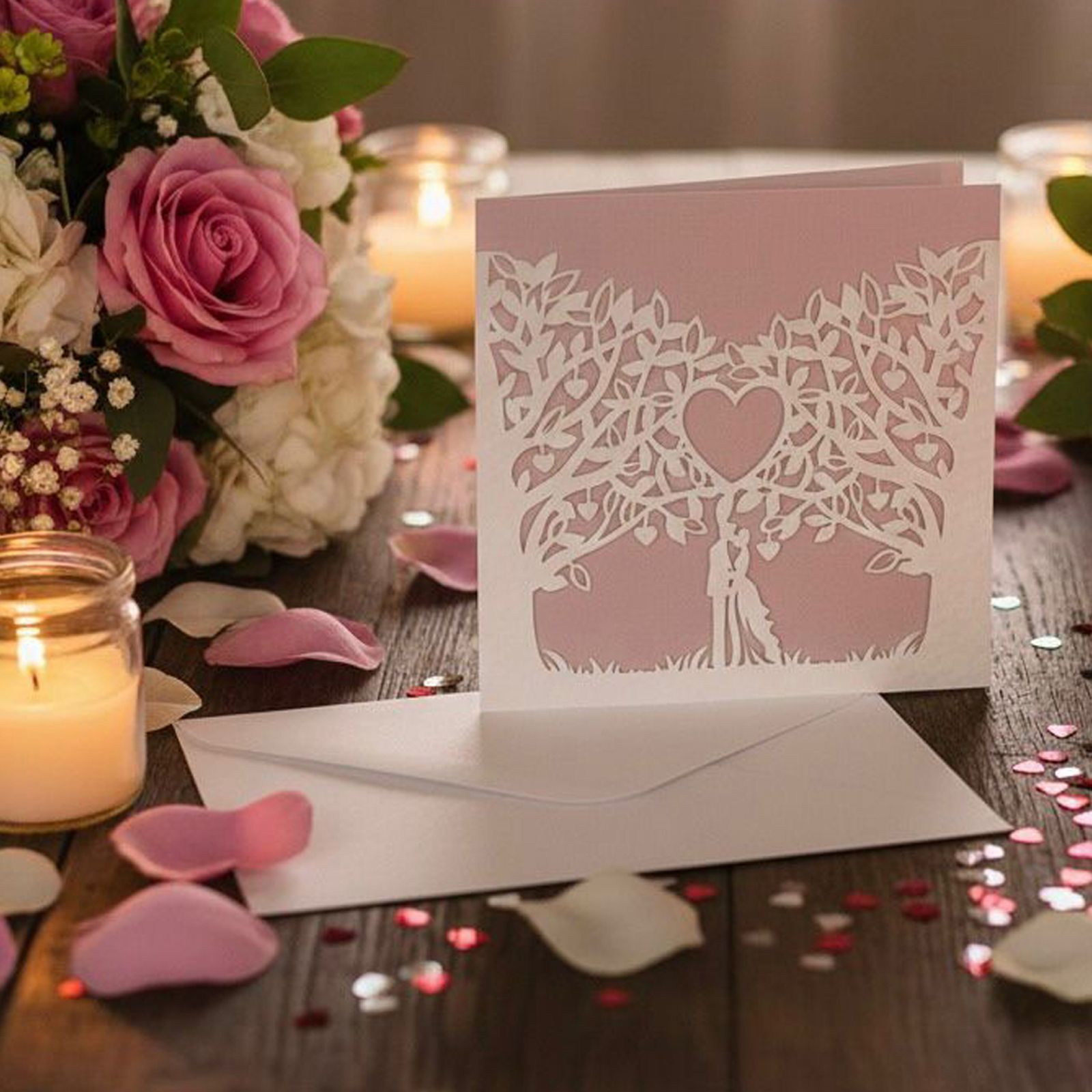 Scopri il nostro invito di matrimonio, un elemento essenziale per ogni celebrazione d'amore. Questo invito personalizzato presenta un design unico con due sposi e alberi che si intrecciano in un cuore, simbolo di unione e vita condivisa. Ogni invito è un messaggero che racconta l'inizio di un viaggio insieme, rendendo il tuo giorno speciale ancora più memorabile.
