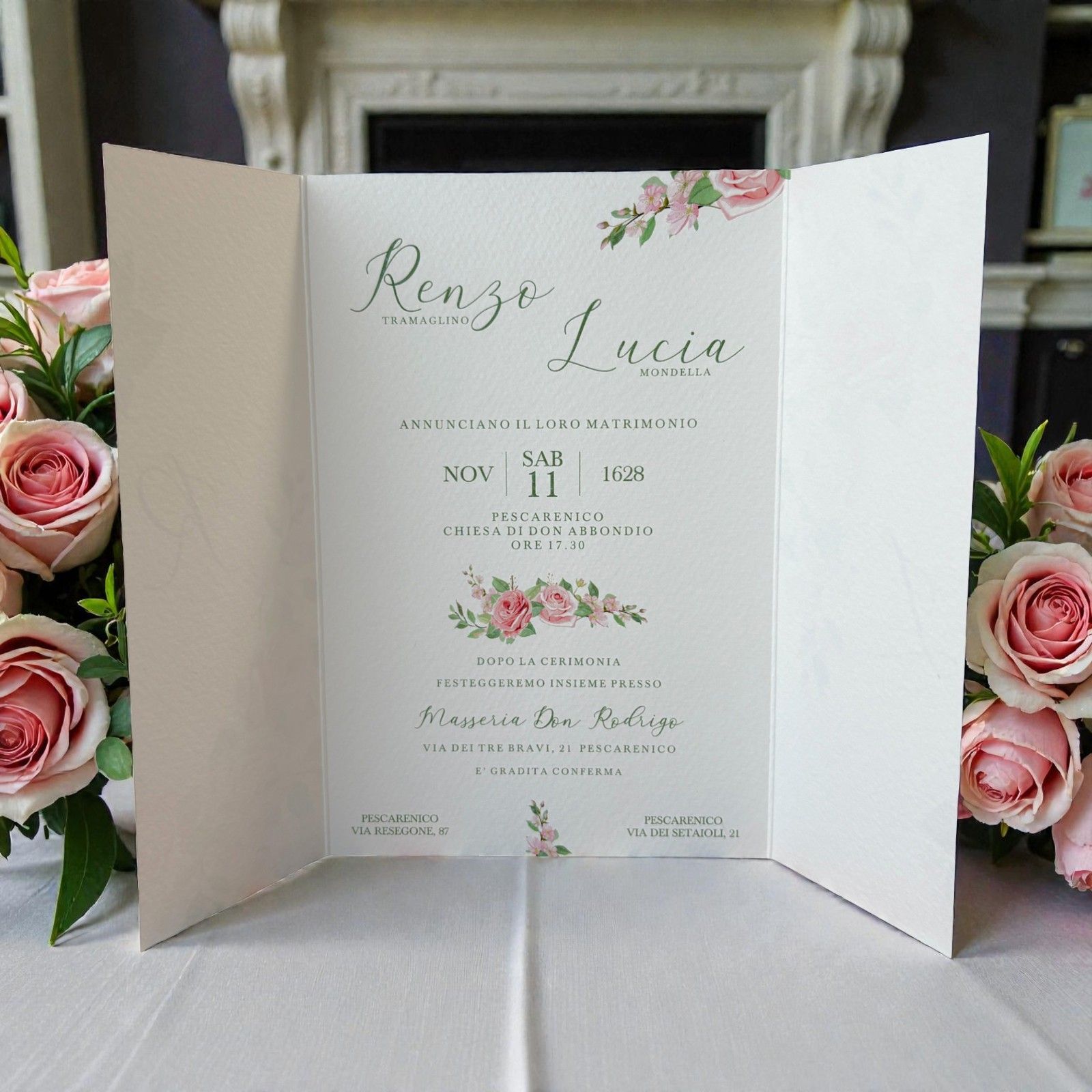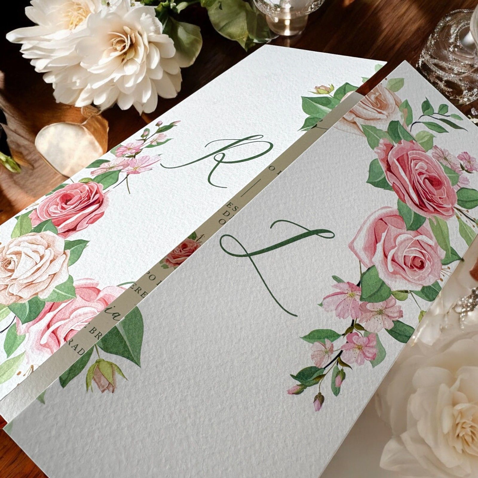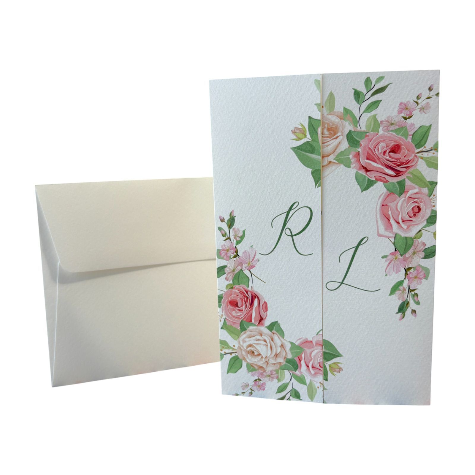 Realizzato in pregiato cartoncino color panna, questo invito di matrimonio presenta un'apertura centrale decorata con le iniziali degli sposi in un elegante verde e delle rose rosa. All'interno, il testo dell'invito è arricchito da ulteriori elementi floreali, posto nella parte centrale, rendendo ogni partecipazione un'opera d'arte personalizzata. Busta panna e stampa inclusi.