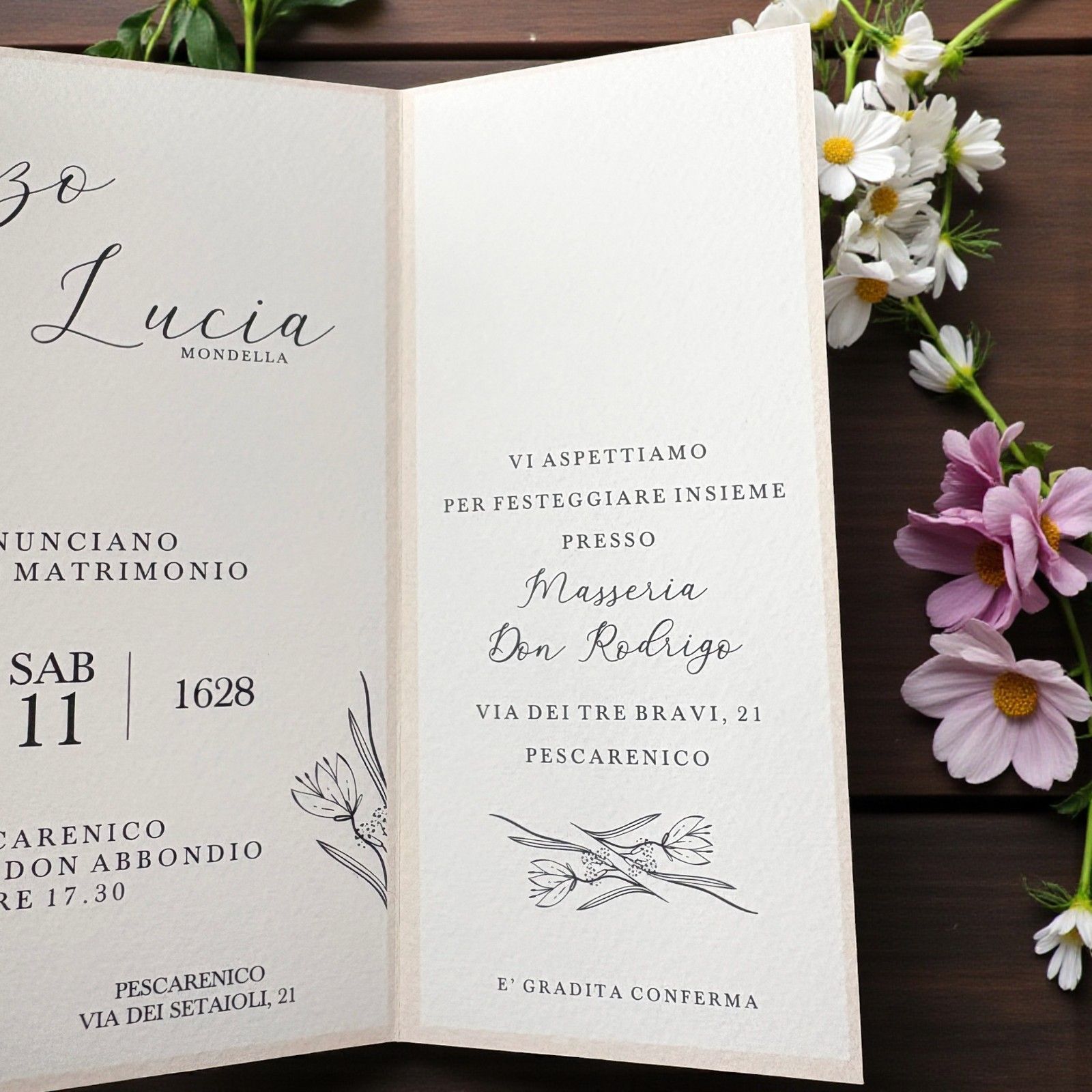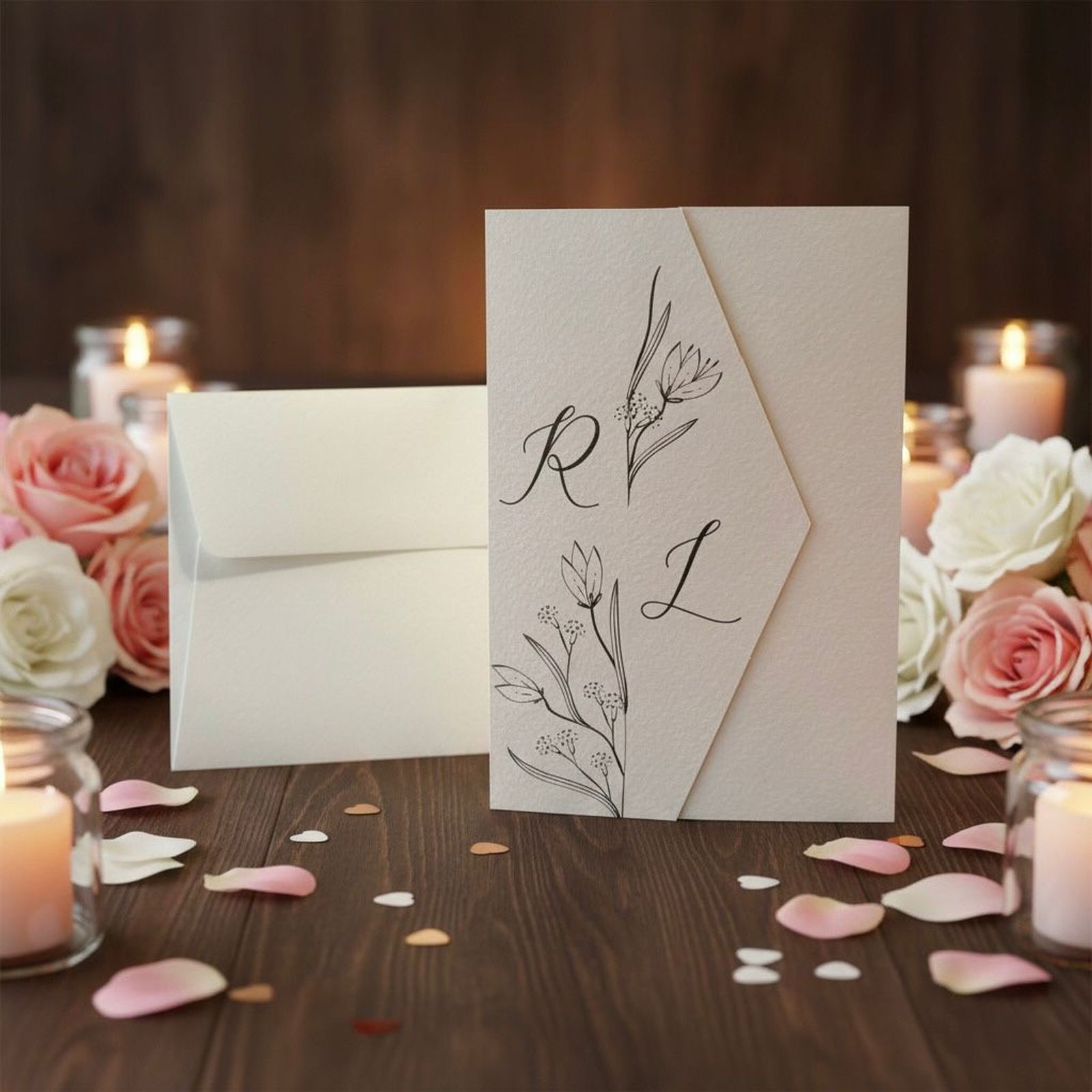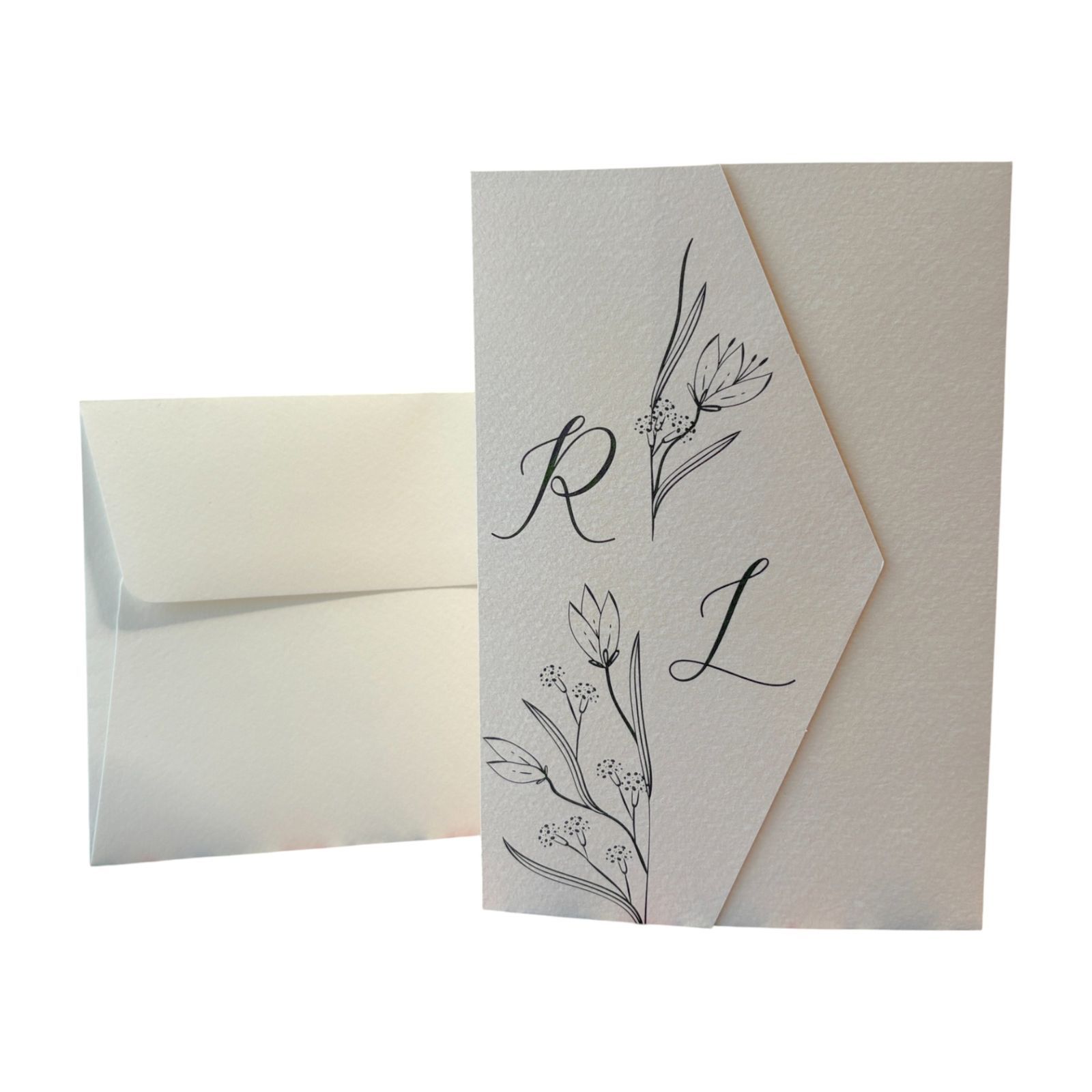 Scopri la nostra partecipazione di matrimonio a busta avorio, un perfetto connubio di eleganza e sobrietà. Con un design delicato di fiori stilizzati e le iniziali degli sposi stampate sulla copertina, questo invito sarà il primo passo per annunciare il giorno più bello della vostra vita. Ogni dettaglio è pensato per riflettere l'amore e la gioia di questo momento speciale, rendendo l'invito un simbolo del legame eterno che state per celebrare.
