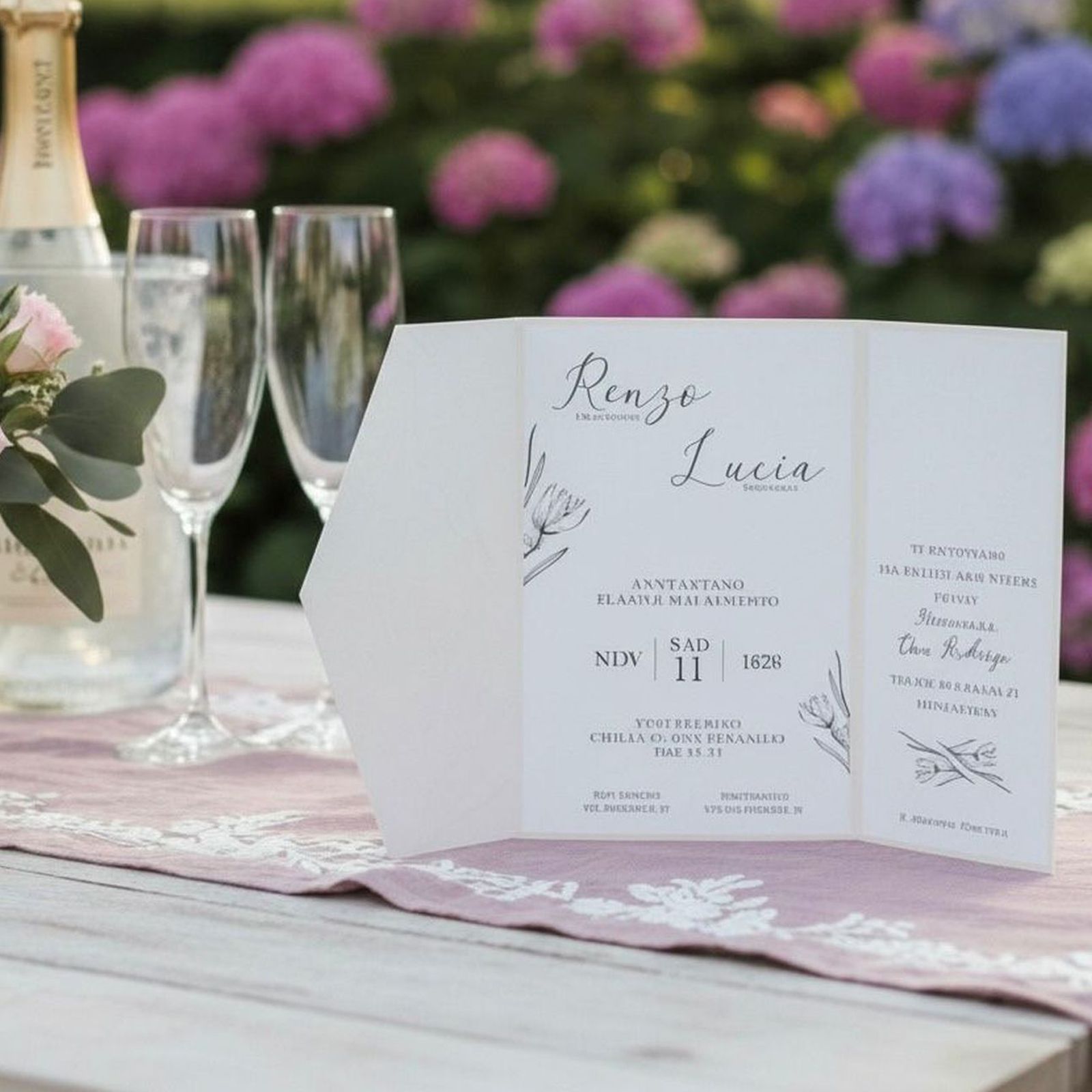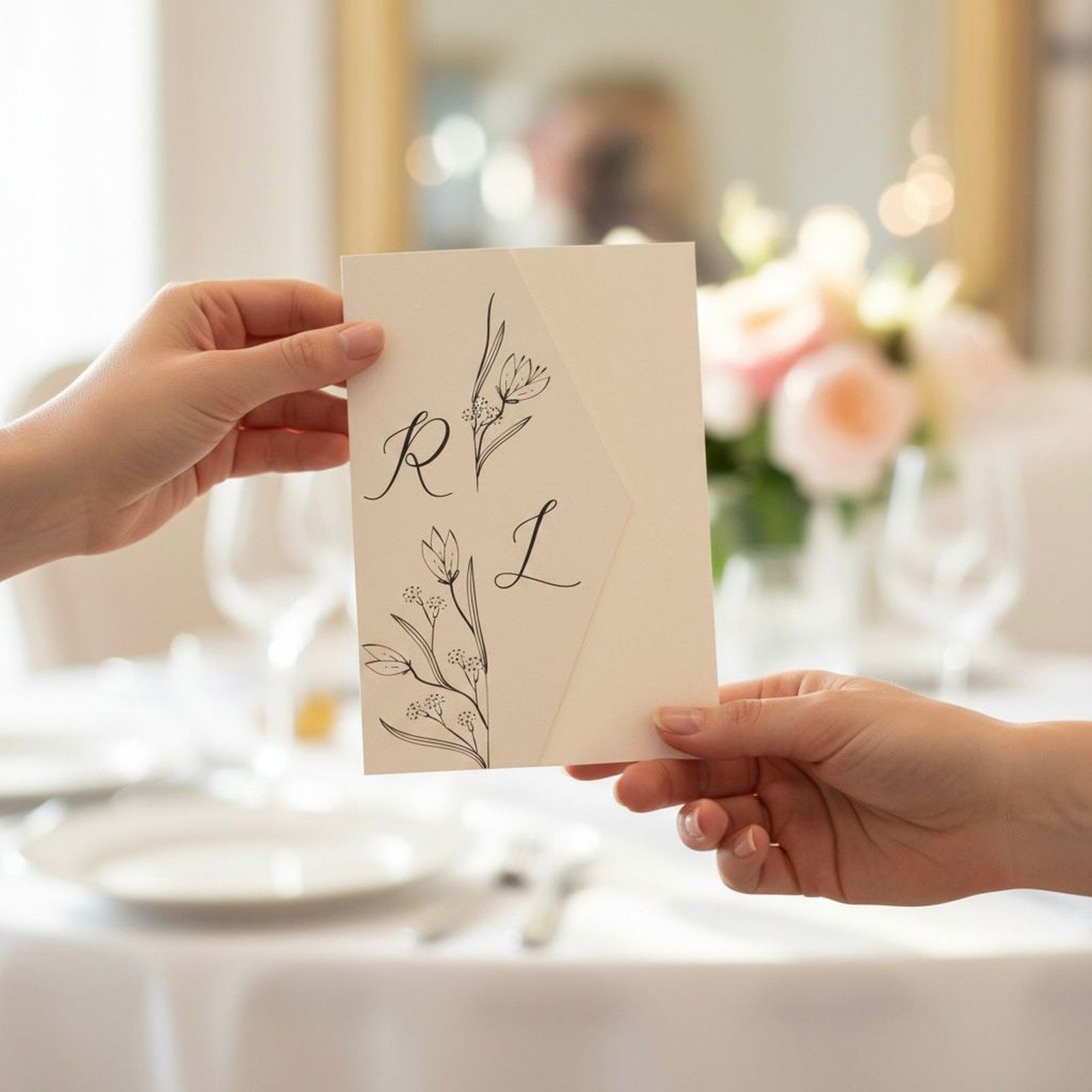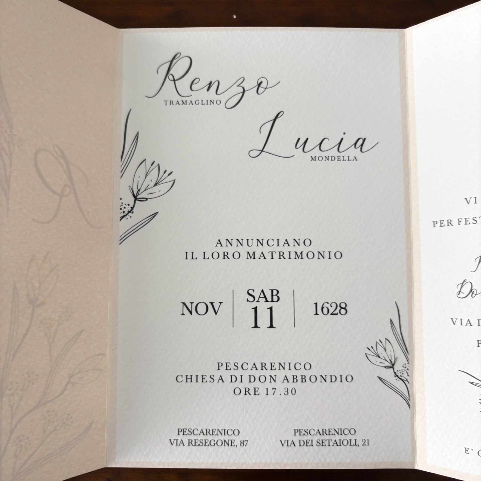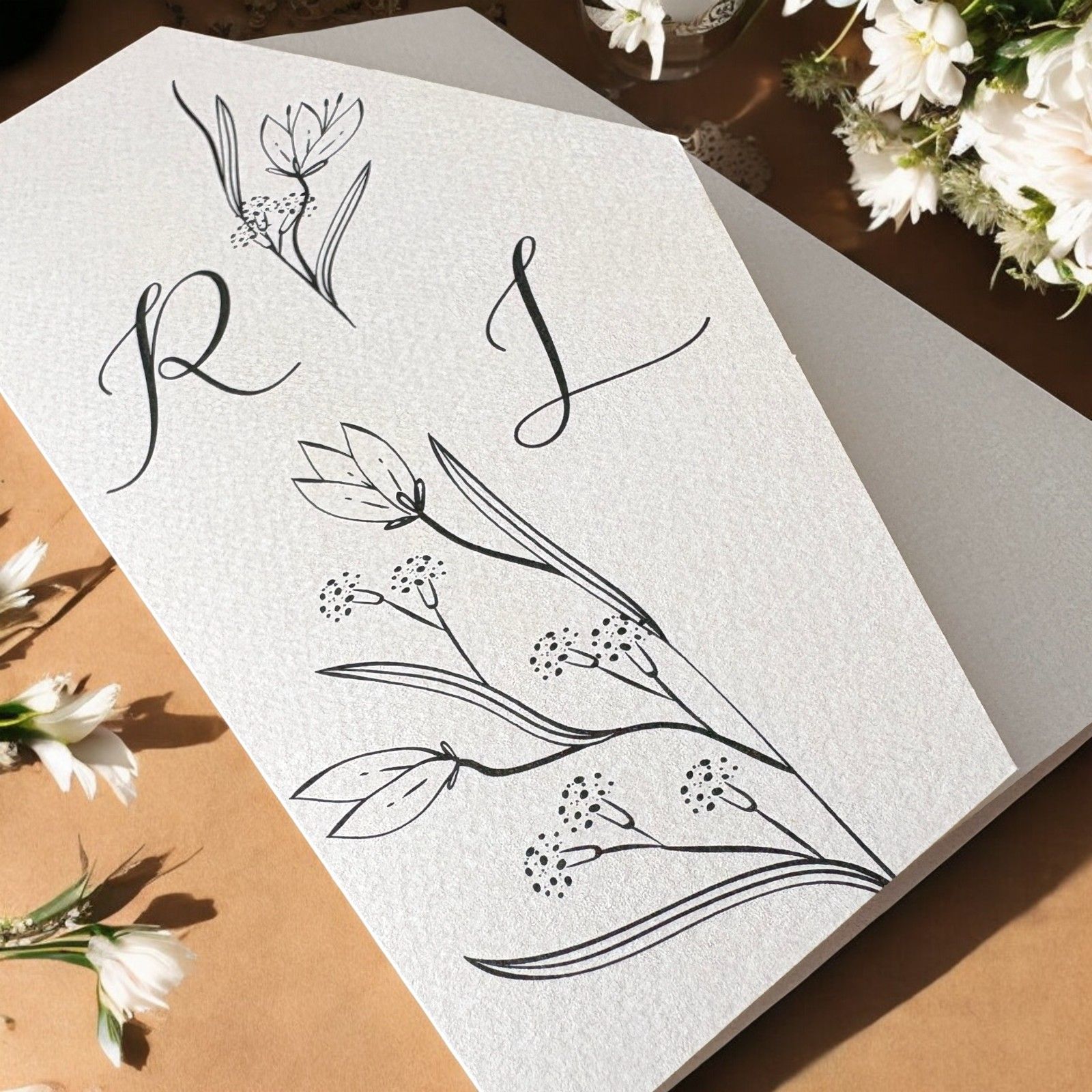 Scopri la nostra partecipazione di matrimonio a busta avorio, un perfetto connubio di eleganza e sobrietà. Con un design delicato di fiori stilizzati e le iniziali degli sposi stampate sulla copertina, questo invito sarà il primo passo per annunciare il giorno più bello della vostra vita. Ogni dettaglio è pensato per riflettere l'amore e la gioia di questo momento speciale, rendendo l'invito un simbolo del legame eterno che state per celebrare.