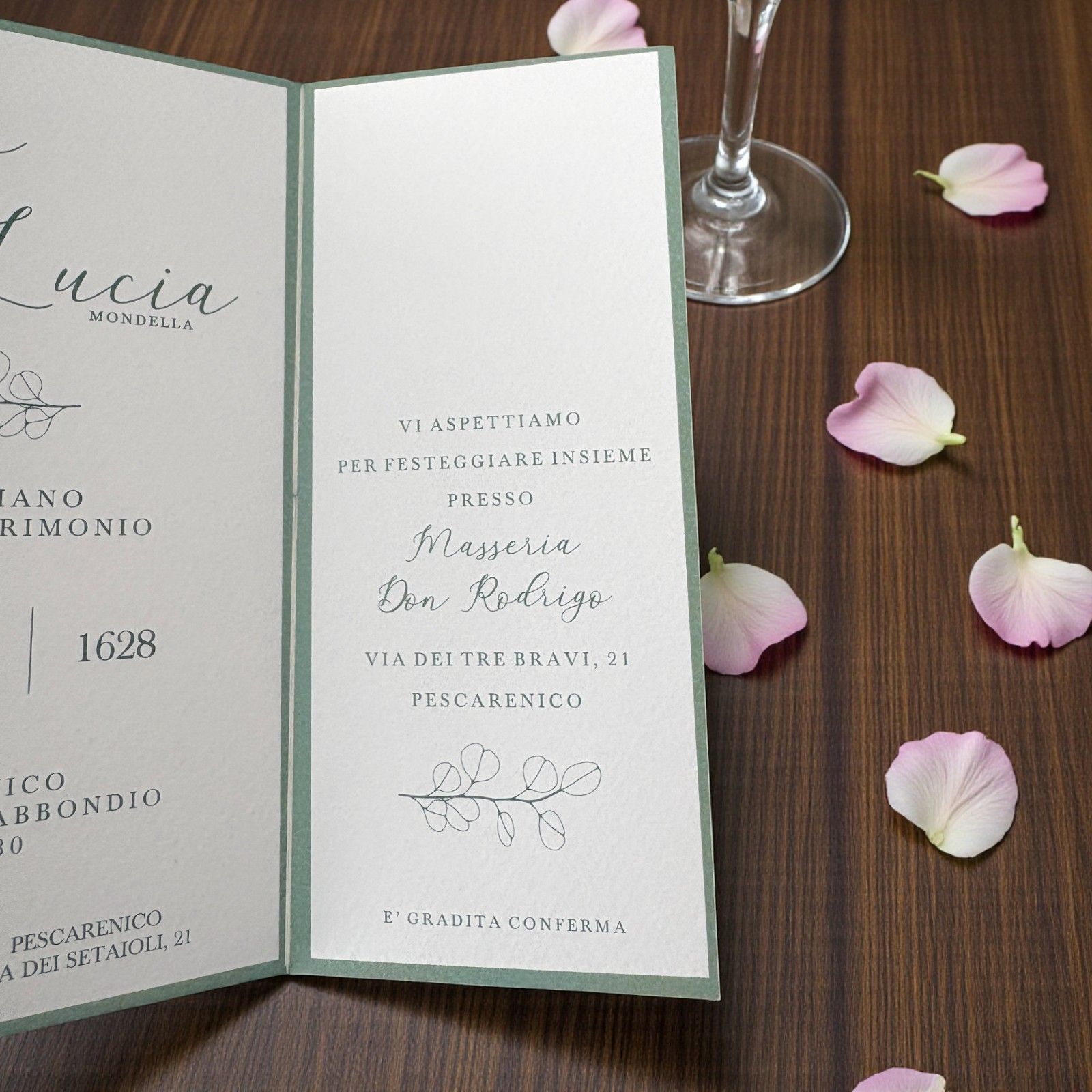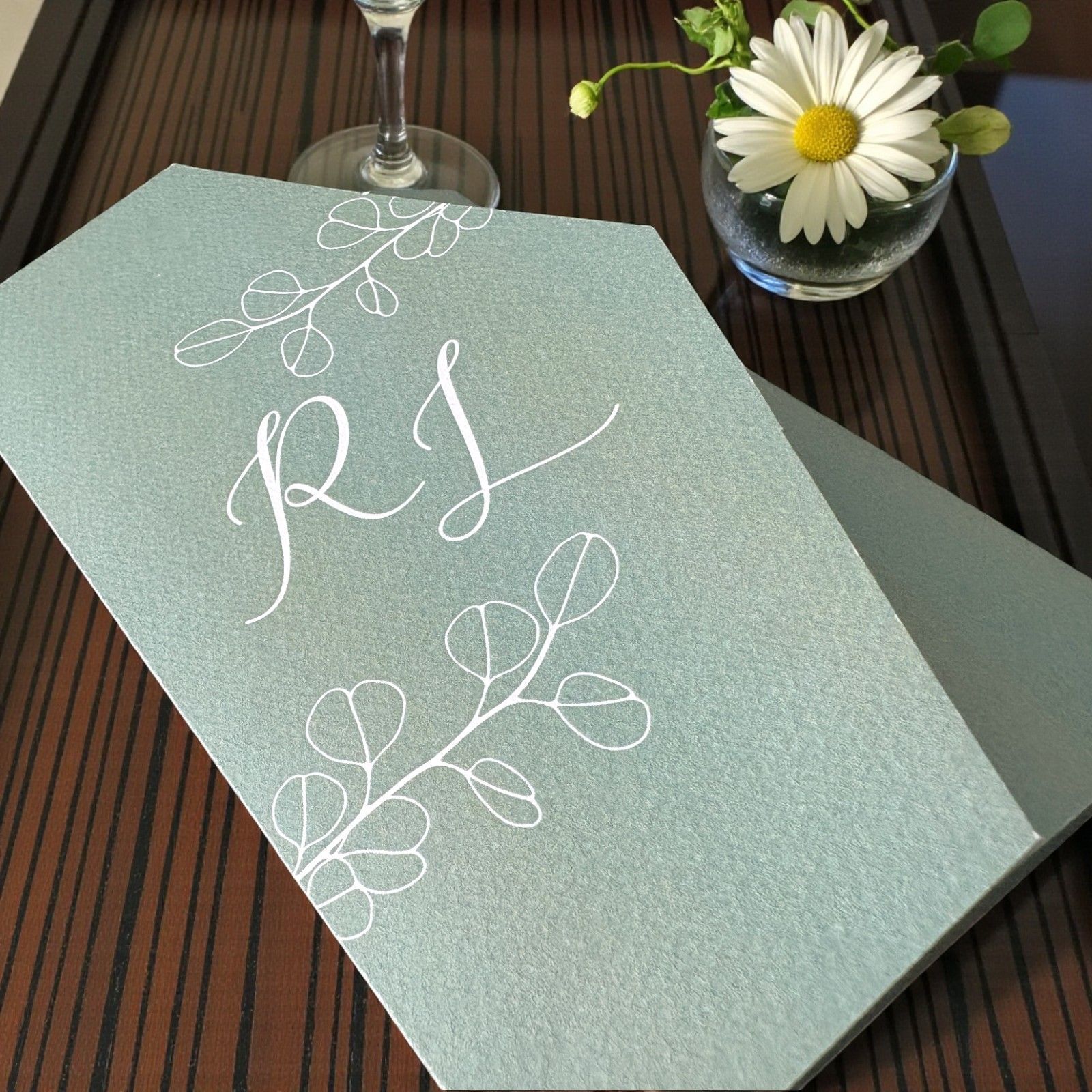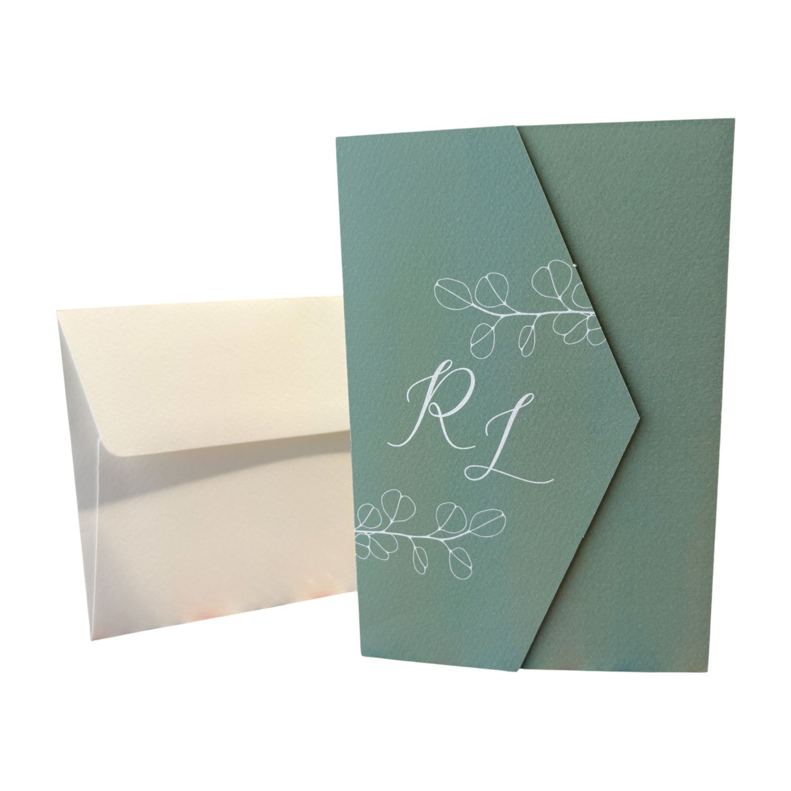 Realizzata in cartoncino di alta qualità, la partecipazione a forma di busta presenta le iniziali degli sposi e foglie elegantemente stampate sulla copertina. All'interno, troverai una presentazione curata dell'invito per la chiesa nella parte centrale, mentre a destra si trova l'invito al ristorante o l'invito al taglio torta, oppure puoi lasciarlo vuoto se vuoi solo l'invito per la chiesa, il tutto su uno sfondo bianco con delicati dettagli in verde salvia. Busta panna e stampa inclusi.