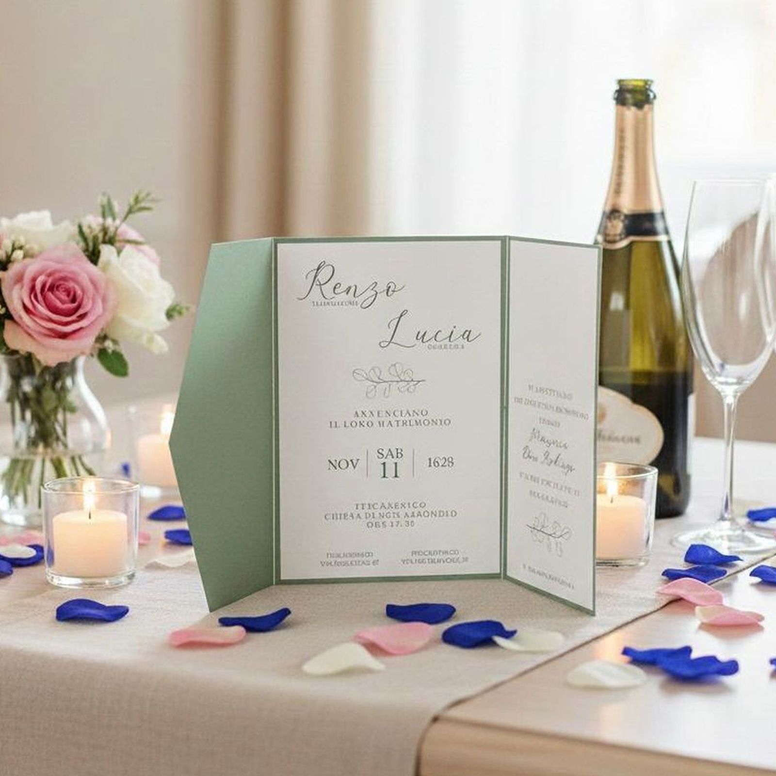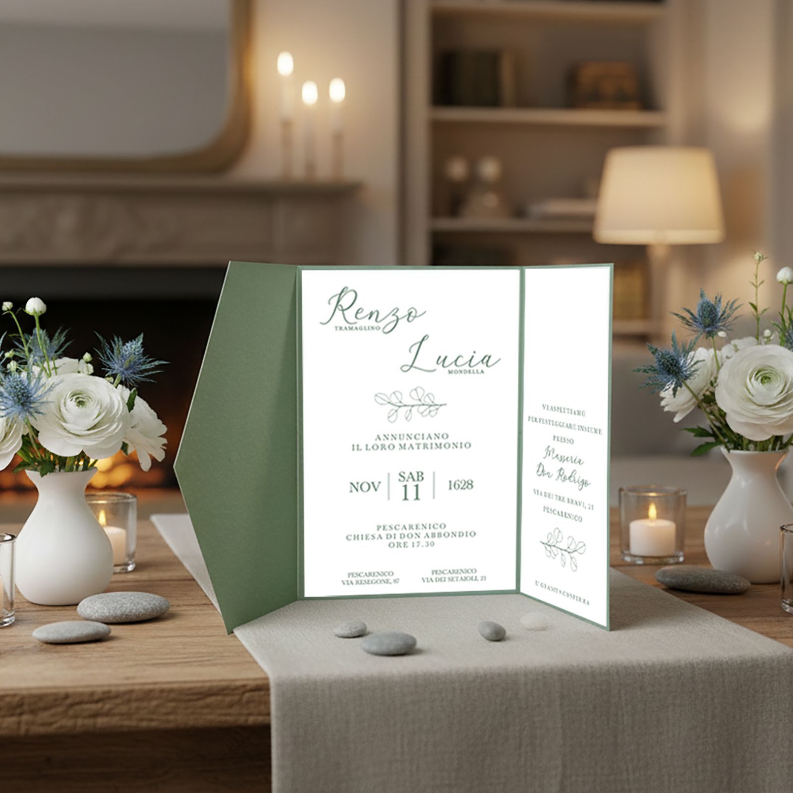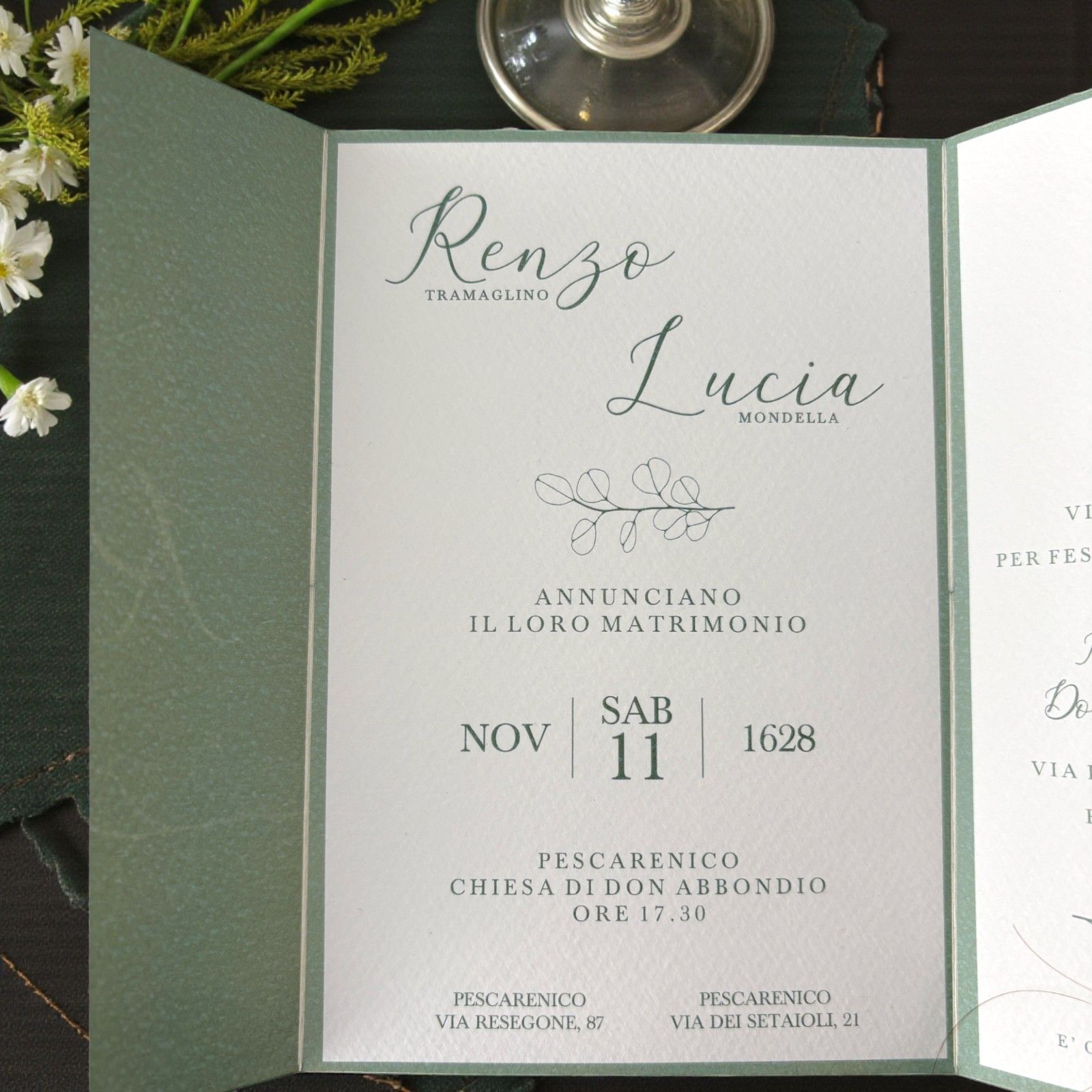 Realizzata in cartoncino di alta qualità, la partecipazione a forma di busta presenta le iniziali degli sposi e foglie elegantemente stampate sulla copertina. All'interno, troverai una presentazione curata dell'invito per la chiesa nella parte centrale, mentre a destra si trova l'invito al ristorante o l'invito al taglio torta, oppure puoi lasciarlo vuoto se vuoi solo l'invito per la chiesa, il tutto su uno sfondo bianco con delicati dettagli in verde salvia. Busta panna e stampa inclusi.