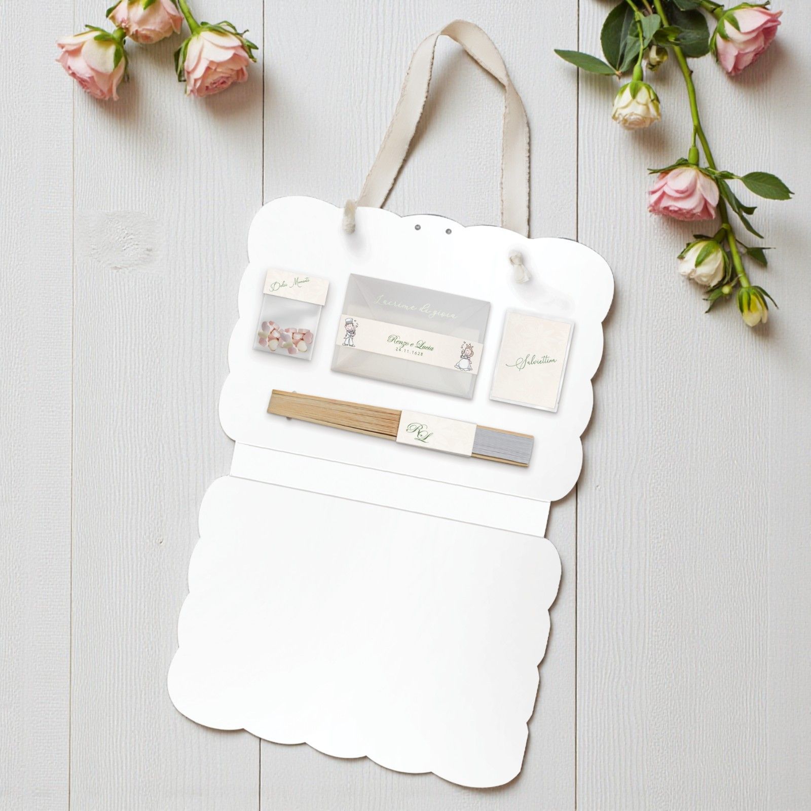 Realizzata in cartoncino di alta qualità e disponibile in un elegante colore avorio, questa wedding bag è l'ideale per accogliere i piccoli doni per i tuoi ospiti. All'interno, troverai una bustina per le caramelle, una bustina “Lacrime di gioia” per i fazzolettini, una salviettina e un ventaglio, rendendo ogni momento ancora più speciale.