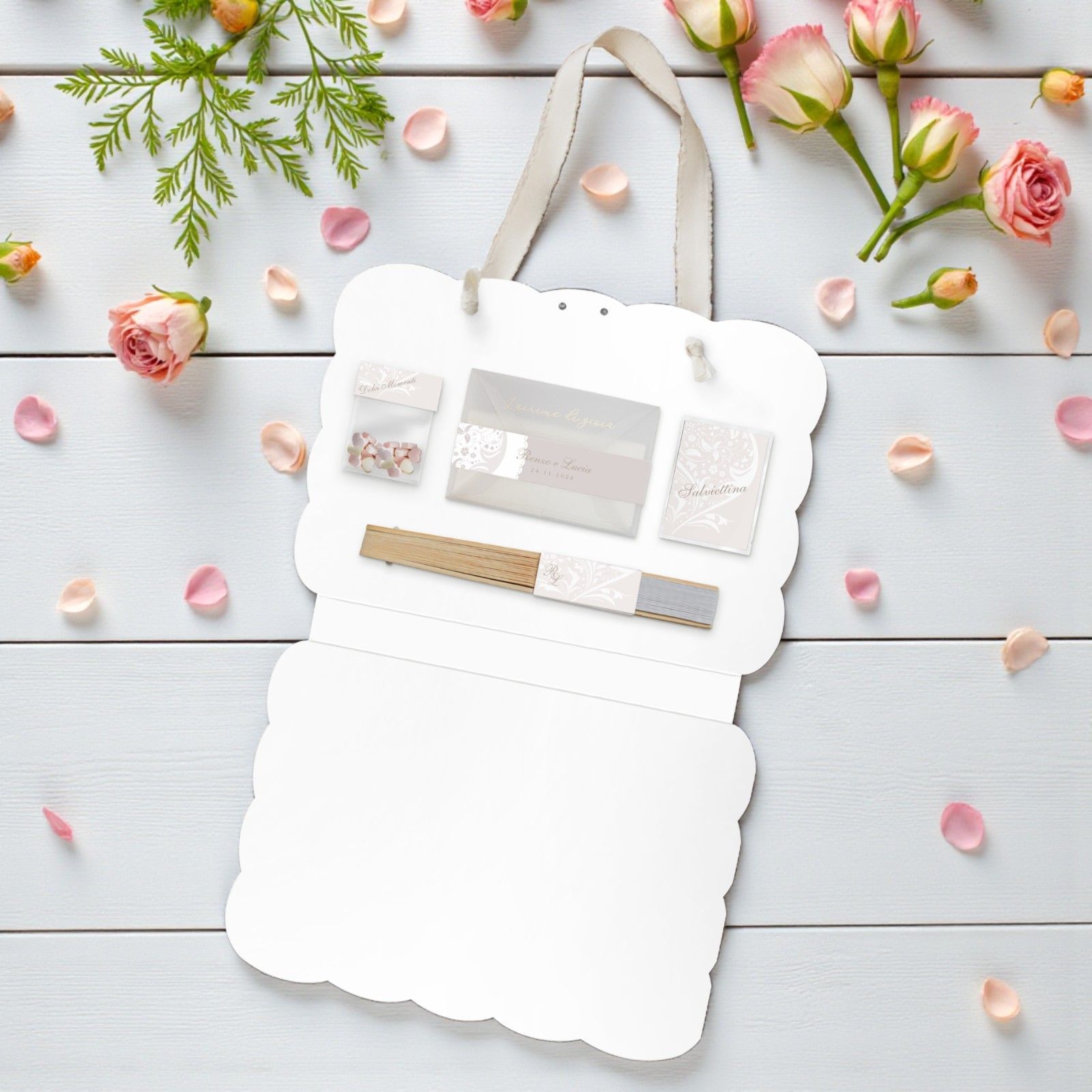La wedding bag è un elemento essenziale per ogni cerimonia, sia essa in chiesa o in un rito civile. All'interno, troverai tutto il necessario per rendere il giorno ancora più speciale: una bustina per le caramelle, una bustina "Lacrime di gioia" per il fazzolettino, una salviettina e un ventaglio.