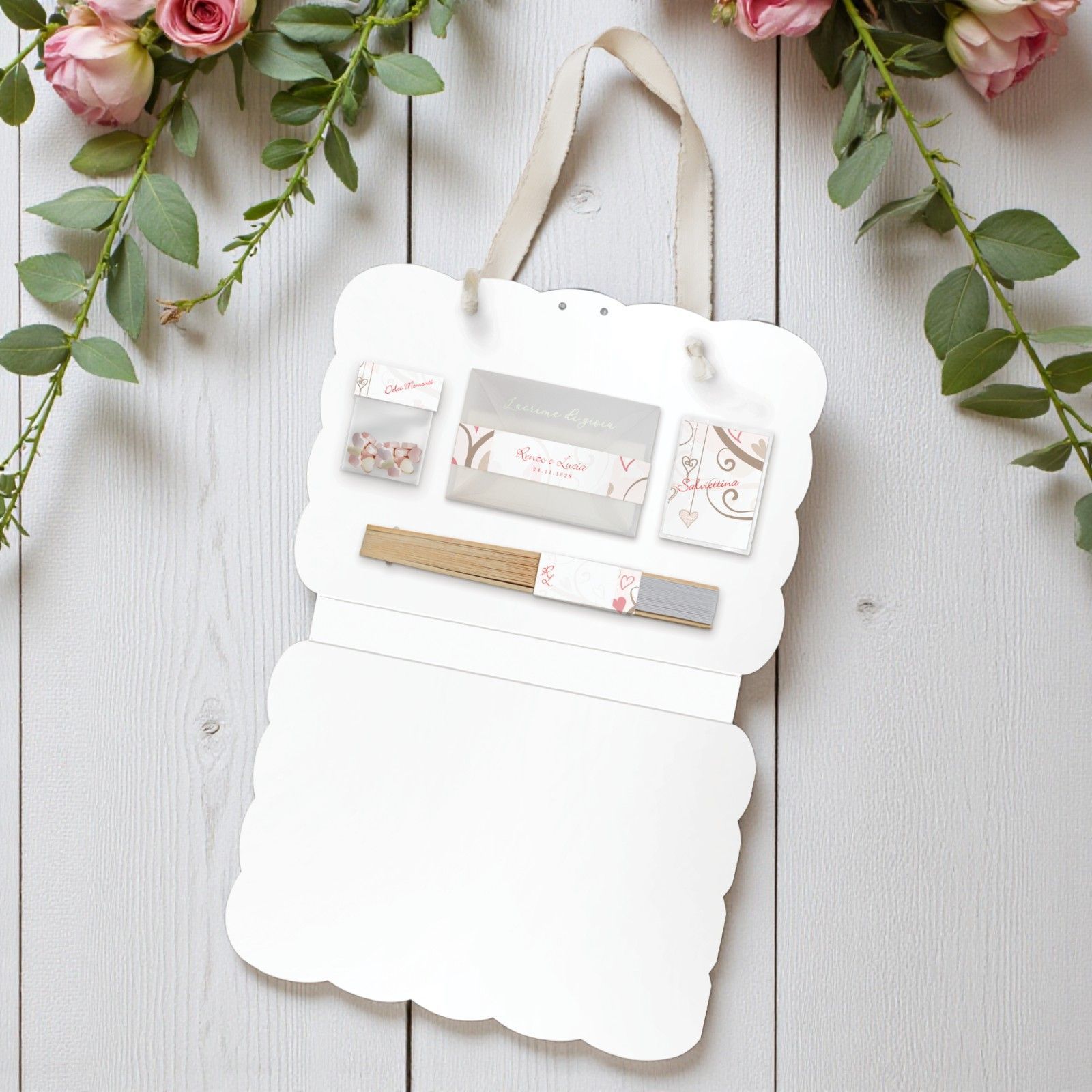 N.B. Le caramelle e il fazzolettino non sono inclusi, e il modello del ventaglio potrebbe variare a seconda della disponibilità del momento.