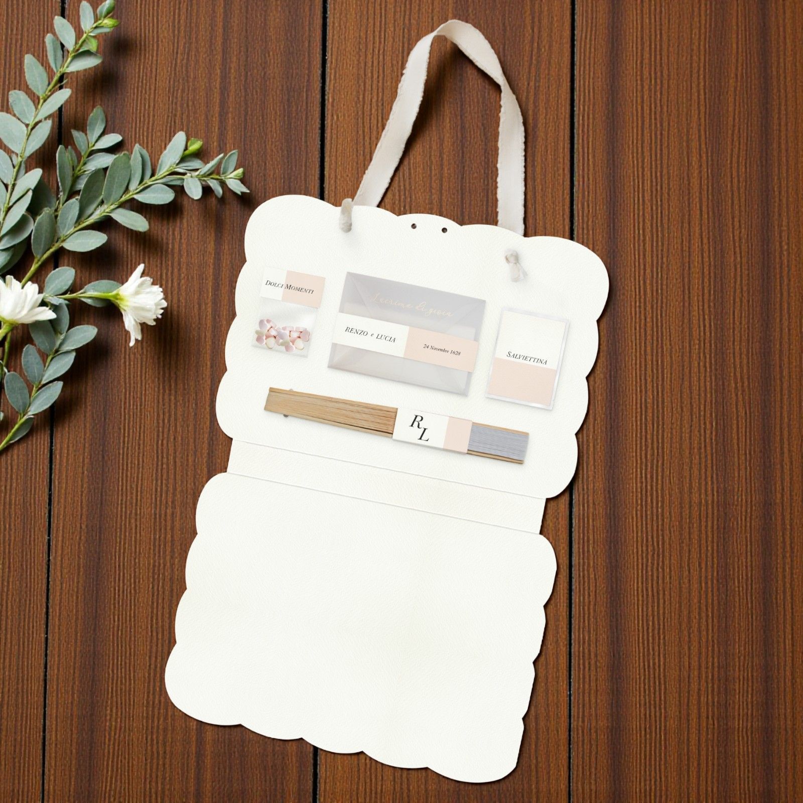 In omaggio, riceverai il nastrino in organza bianco per i manici e la chiusura della bag, che verrà inviato separatamente.