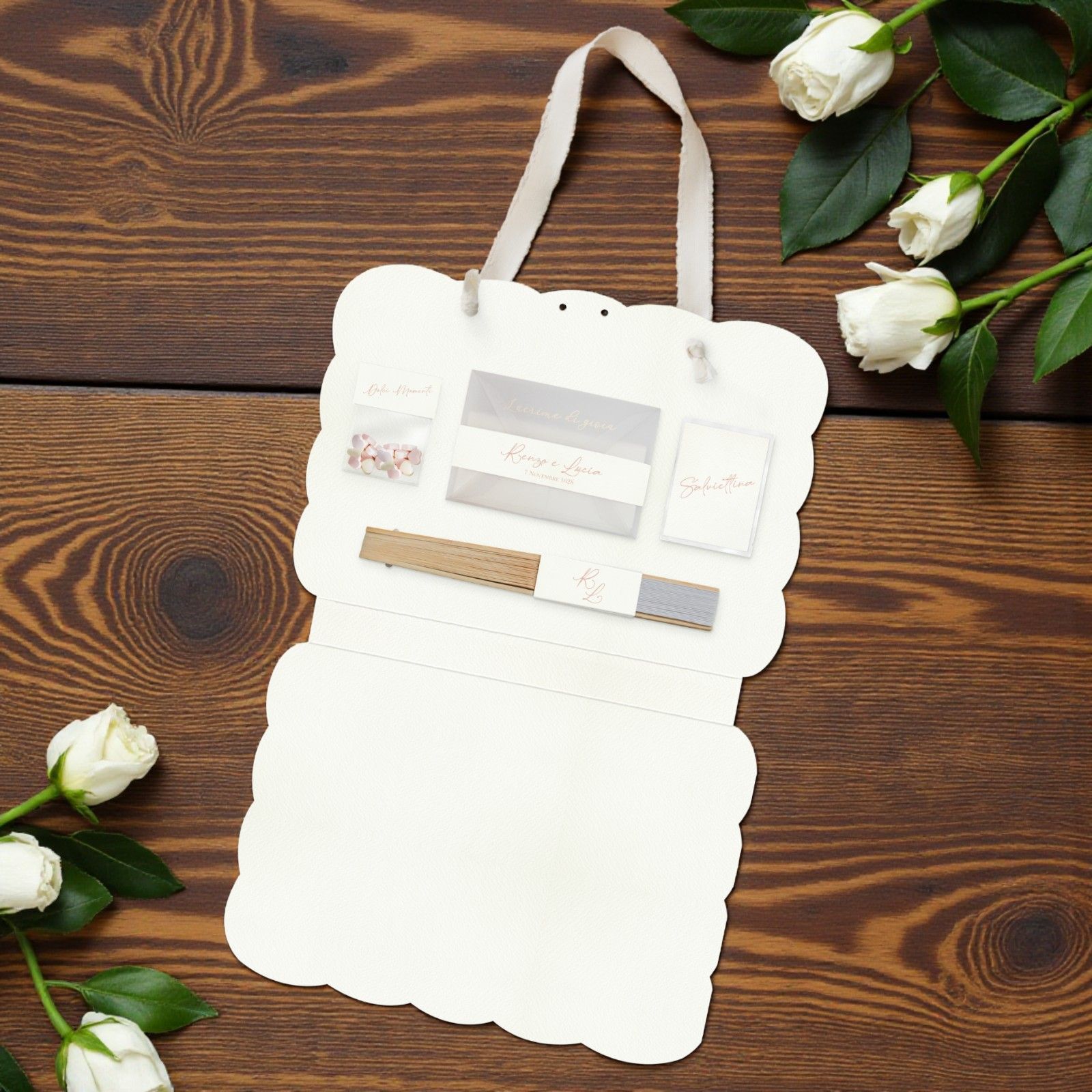 All'interno della wedding bag troverai tutto il necessario per sorprendere gli invitati: una bustina per le caramelle, una bustina "Lacrime di gioia" per il fazzolettino, una salviettina e un ventaglio. Questi dettagli non solo arricchiscono l'esperienza, ma aggiungono un tocco di eleganza al tuo rito civile o alla tua cerimonia in chiesa.
