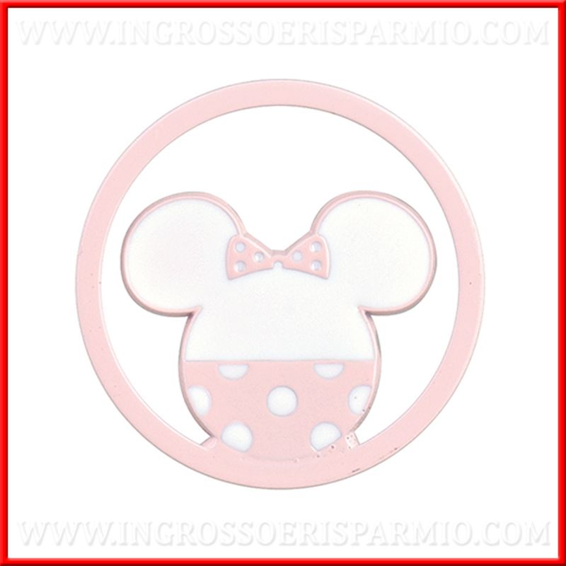 Decorazioni in metallo, di forma rotonda con al centre la faccia di Minnie (solo sagoma), di colore rosa chiaro e bianco.