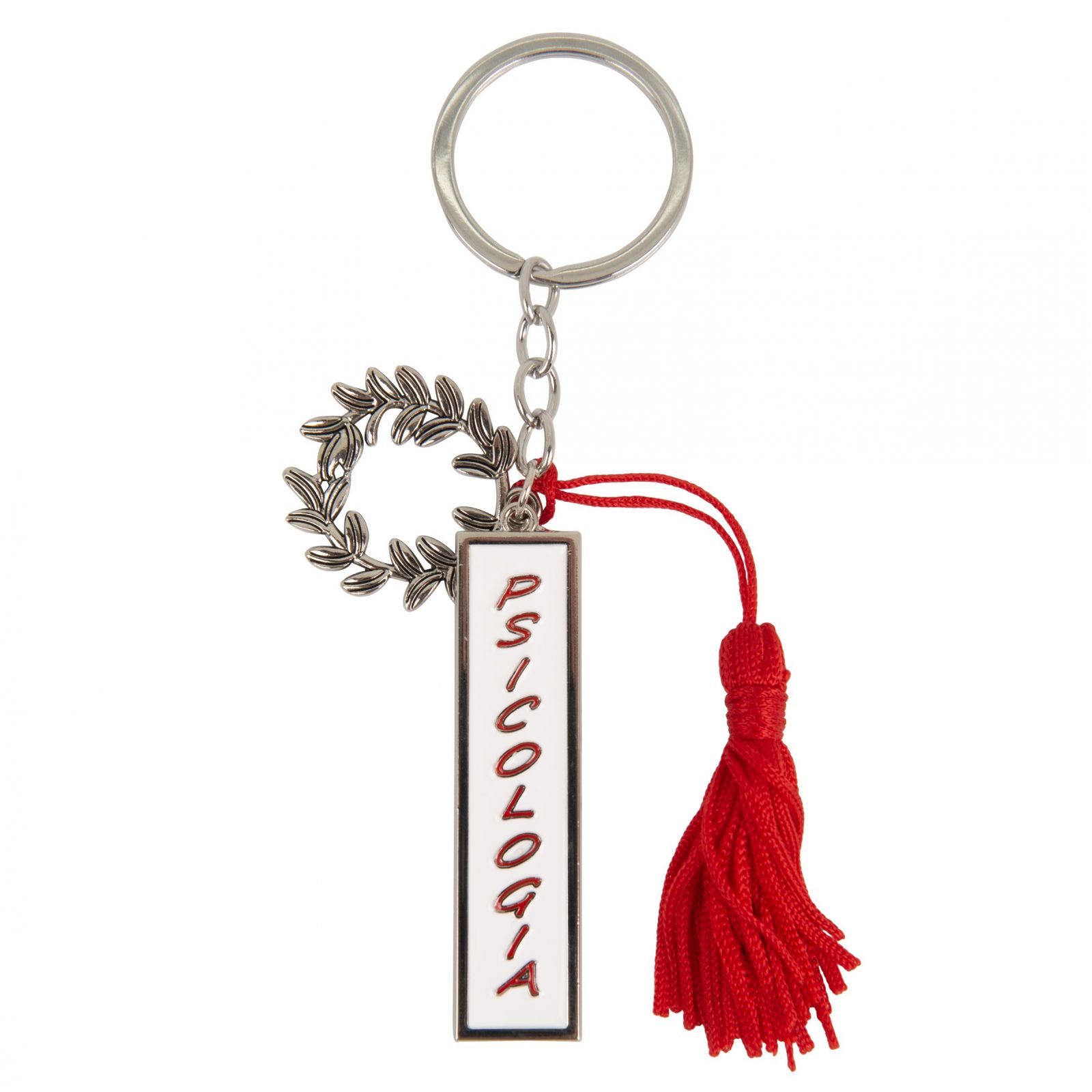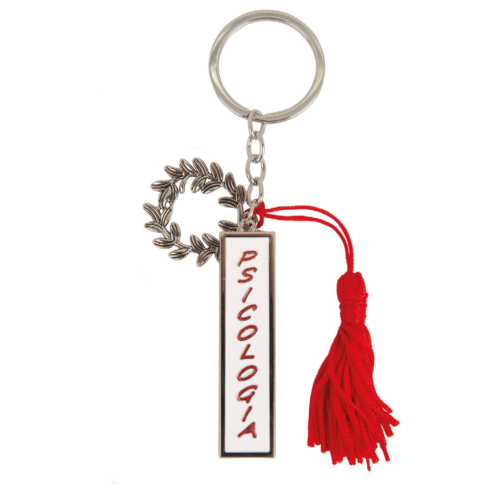 Questo elegante portachiavi con ciondolo è perfetto per essere regalato agli invitati alla cerimonia di laurea. Realizzato in metallo zama, il portachiavi è caratterizzato da una corona alloro e una nappina rossa, oltre a un ciondolo con la scritta Psicologia.
