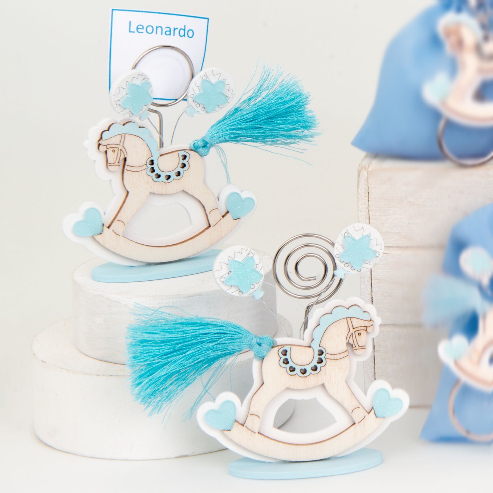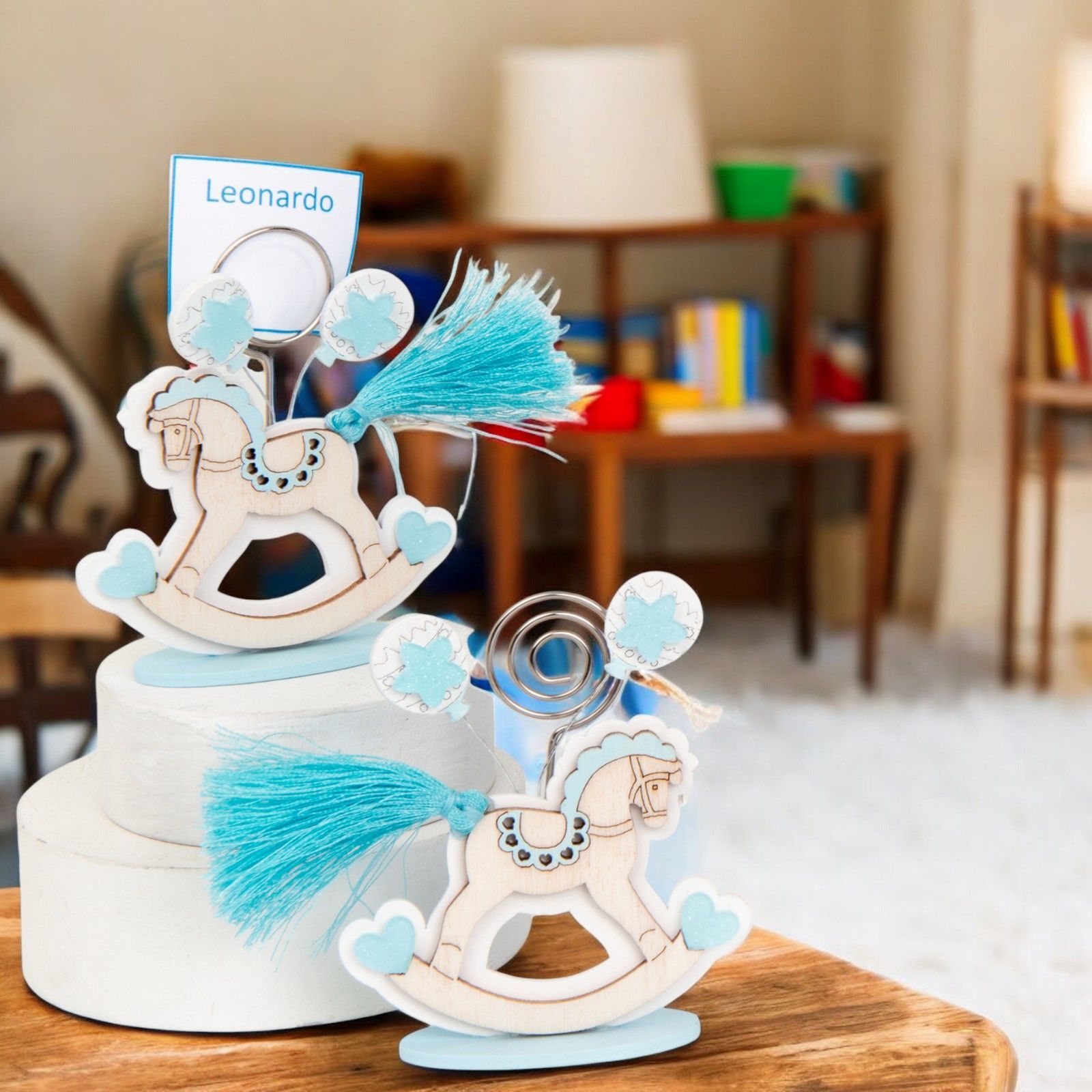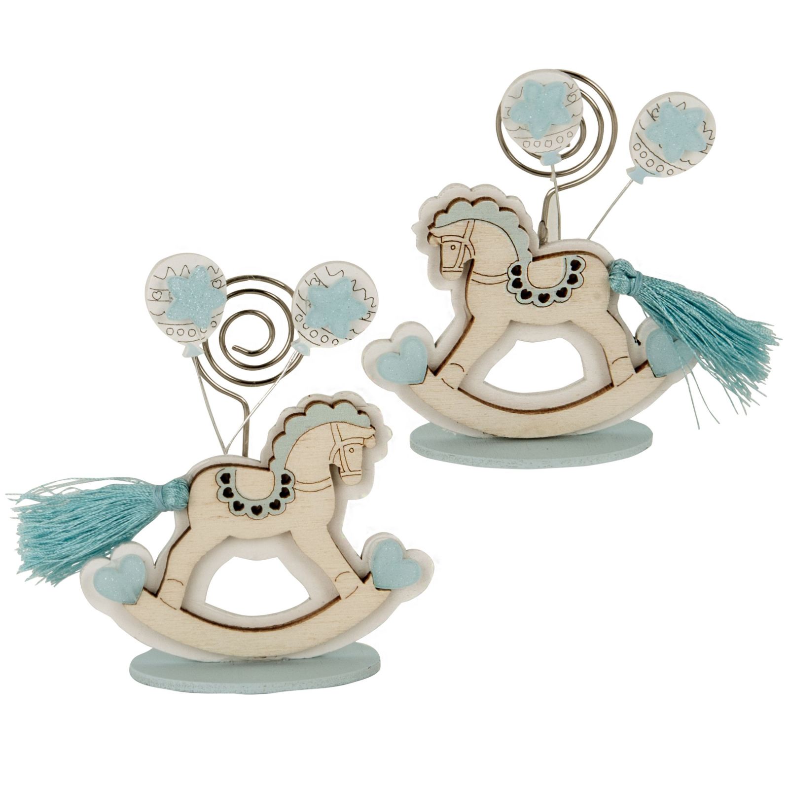 Questo grazioso memoclip con cavallo a dondolo con coda a nappina è l'ideale per celebrare eventi come la nascita o il battesimo. Realizzato in legno, ha dimensioni di circa 8 cm e presenta un delicato colore legno e celeste, perfetto per un bimbo o un maschietto.