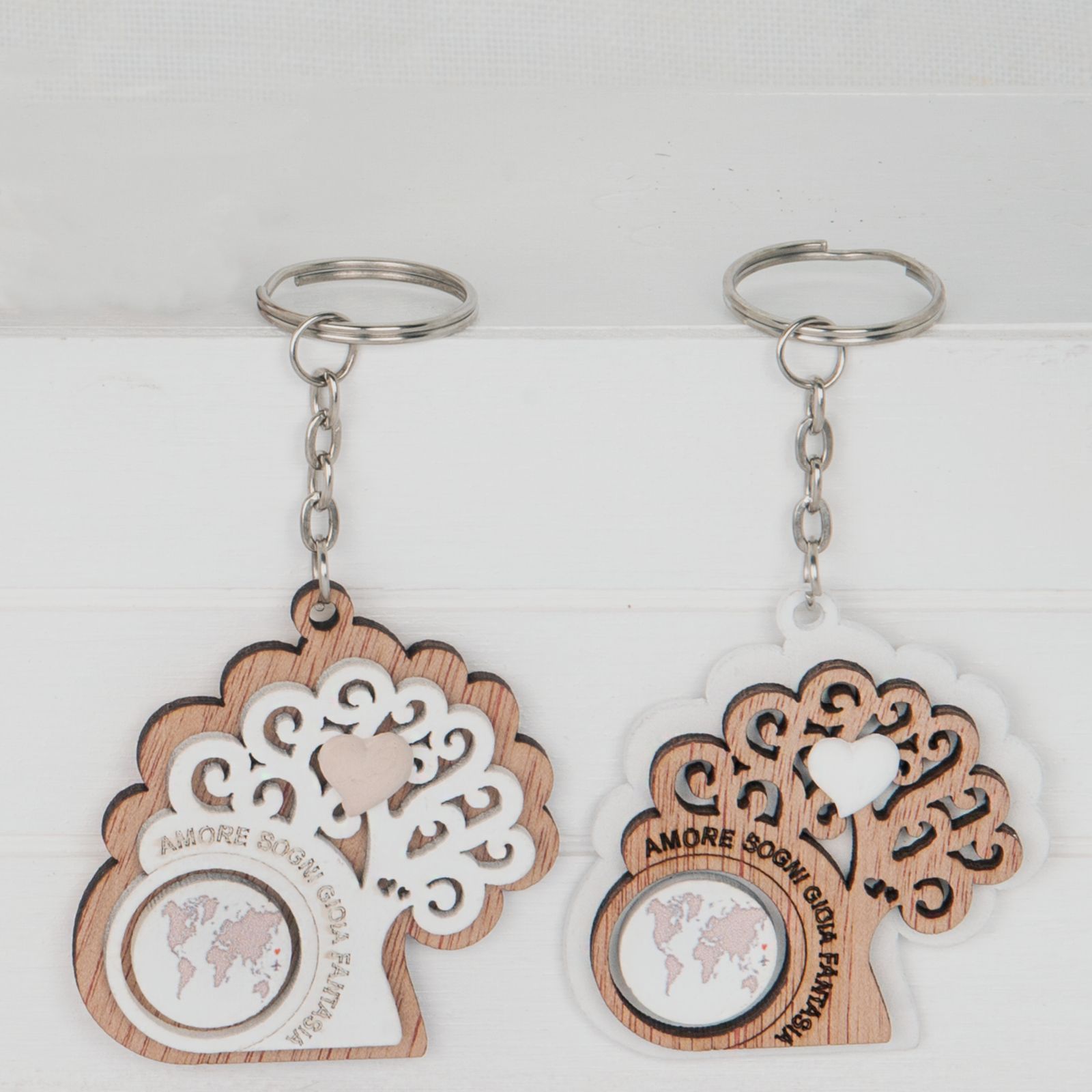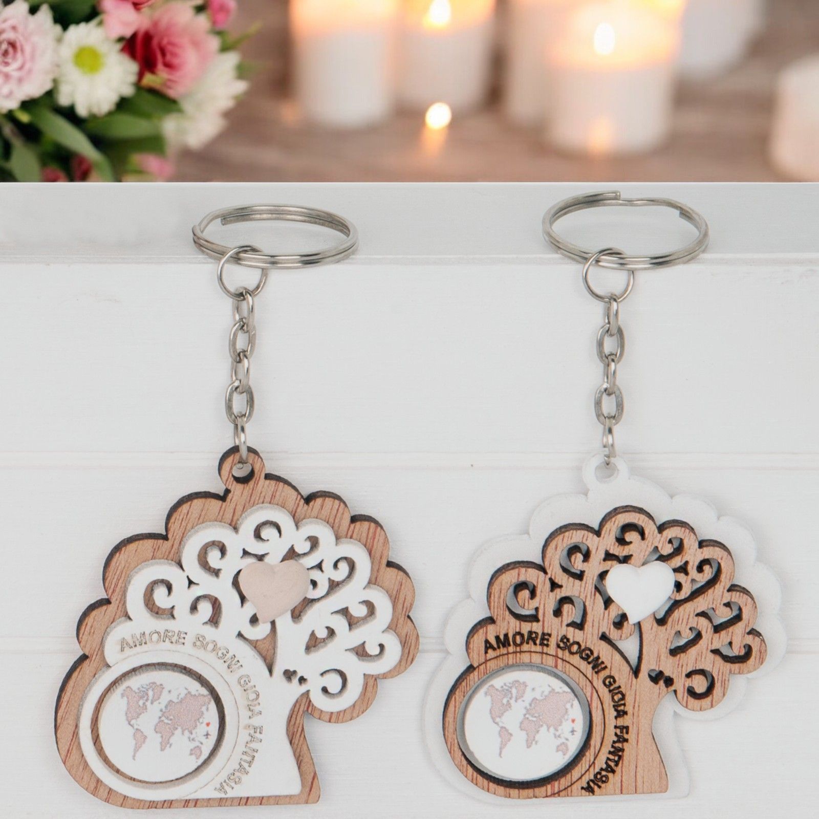 Questo porta chiavi con albero della vita, mappamondo e parole significative è un regalo unico e speciale da regalare ai tuoi invitati durante eventi come matrimoni, nozze d'argento, nozze d'oro, comunioni, cresime e eventi a tema albero o viaggio. Le parole amore, sogni, gioia e fantasia incise su questo porta chiavi rendono il regalo ancora più significativo e memorabile.