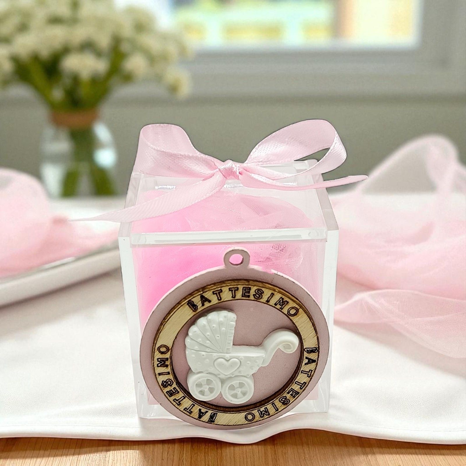 Questa bomboniera è un modo speciale per ringraziare i tuoi invitati, combinando semplicità e originalità. Il medaglione rosa, delicato e femminile, simboleggia la gioia e l’innocenza di una piccola bimba nel giorno del suo battesimo.