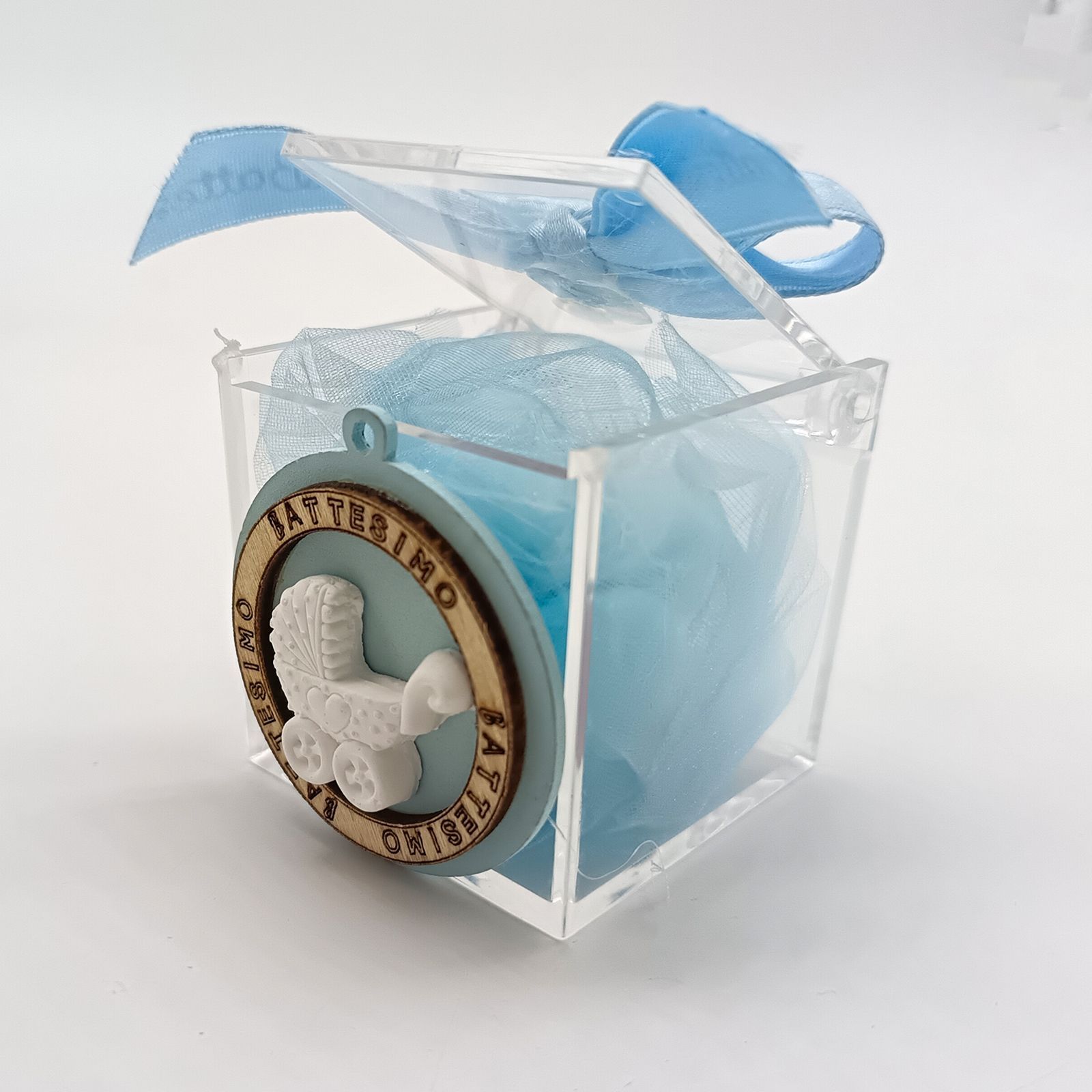 Rendi unico il battesimo del tuo bimbo con questa scatolina per confetti in plexiglass, arricchita da un medaglione tondo in legno con gessetto a forma di carrozzina e la scritta battesimo. Un dettaglio elegante e discreto che cattura l’attenzione con semplicità.