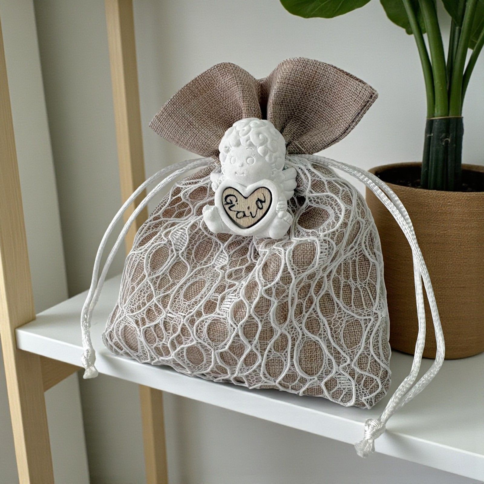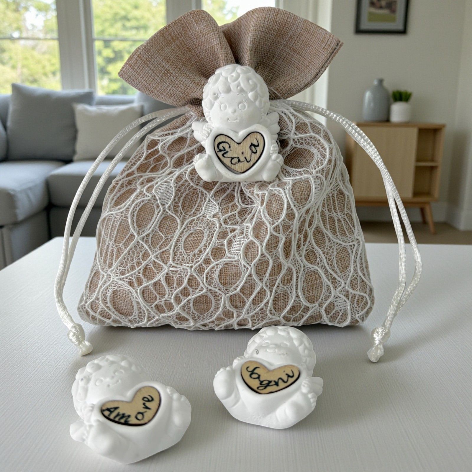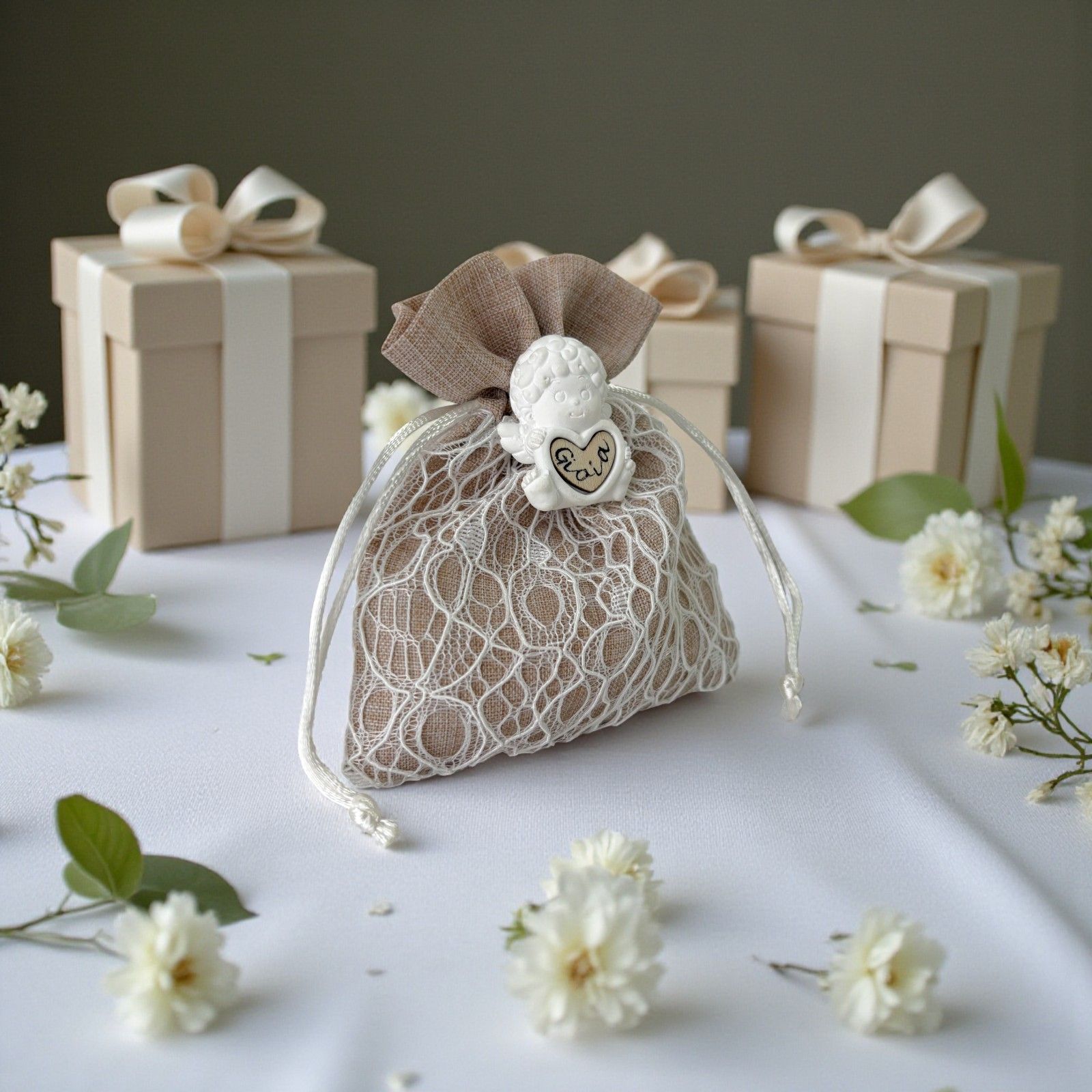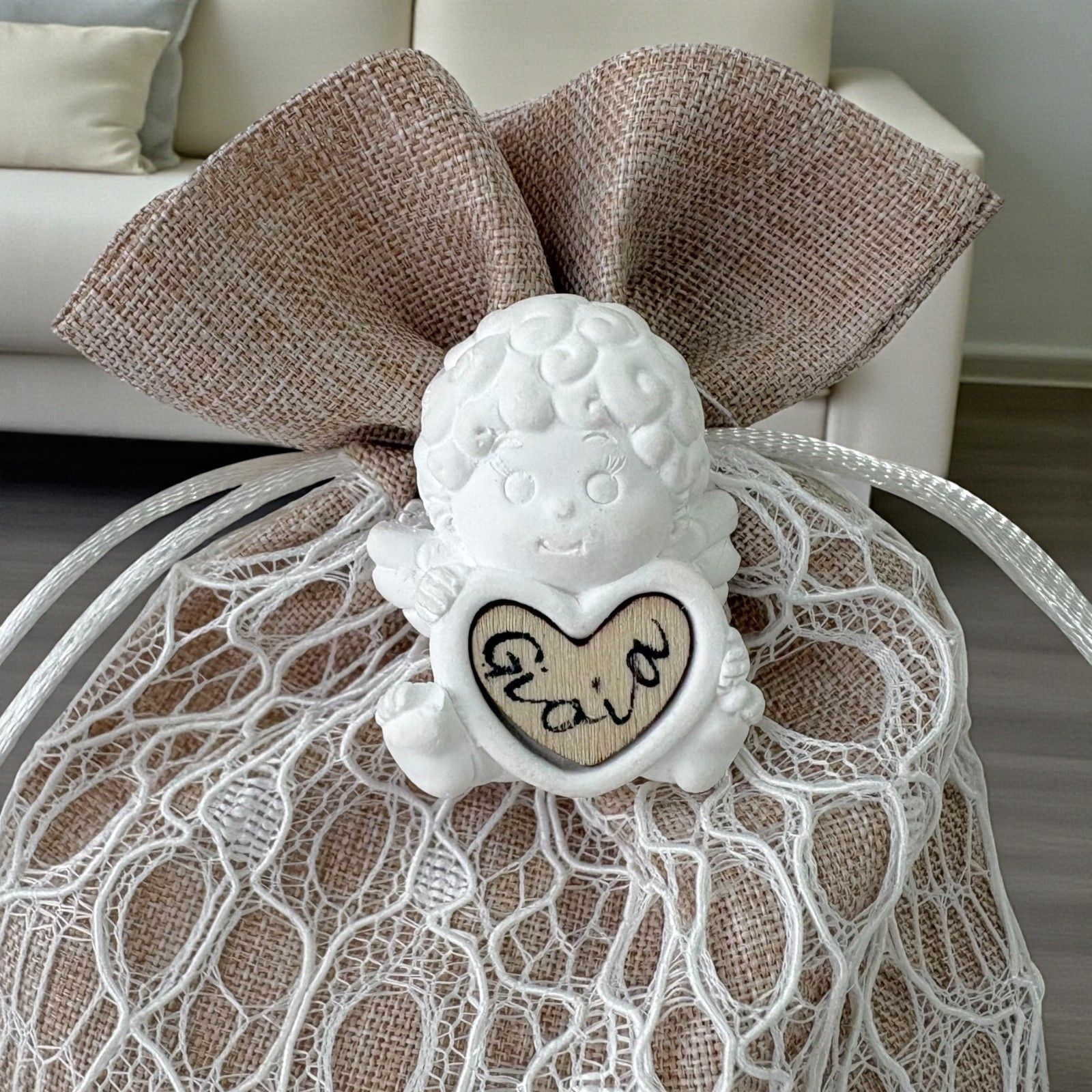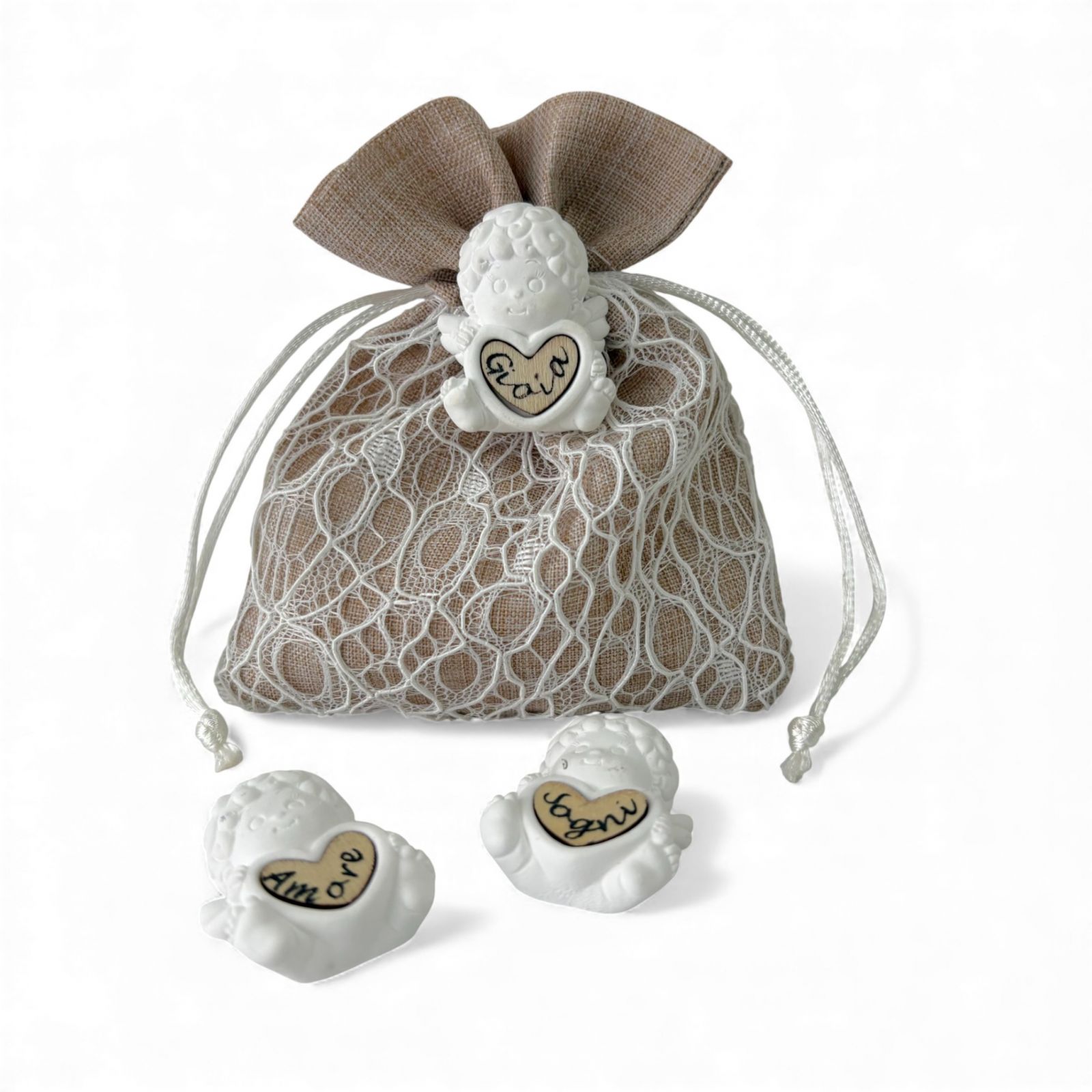 Il sacchetto porta confetti valorizza l'angioletto in gesso creando un dono armonioso e significativo. Questo abbinamento unico rende ogni bomboniera un gesto di cura e attenzione verso gli ospiti.