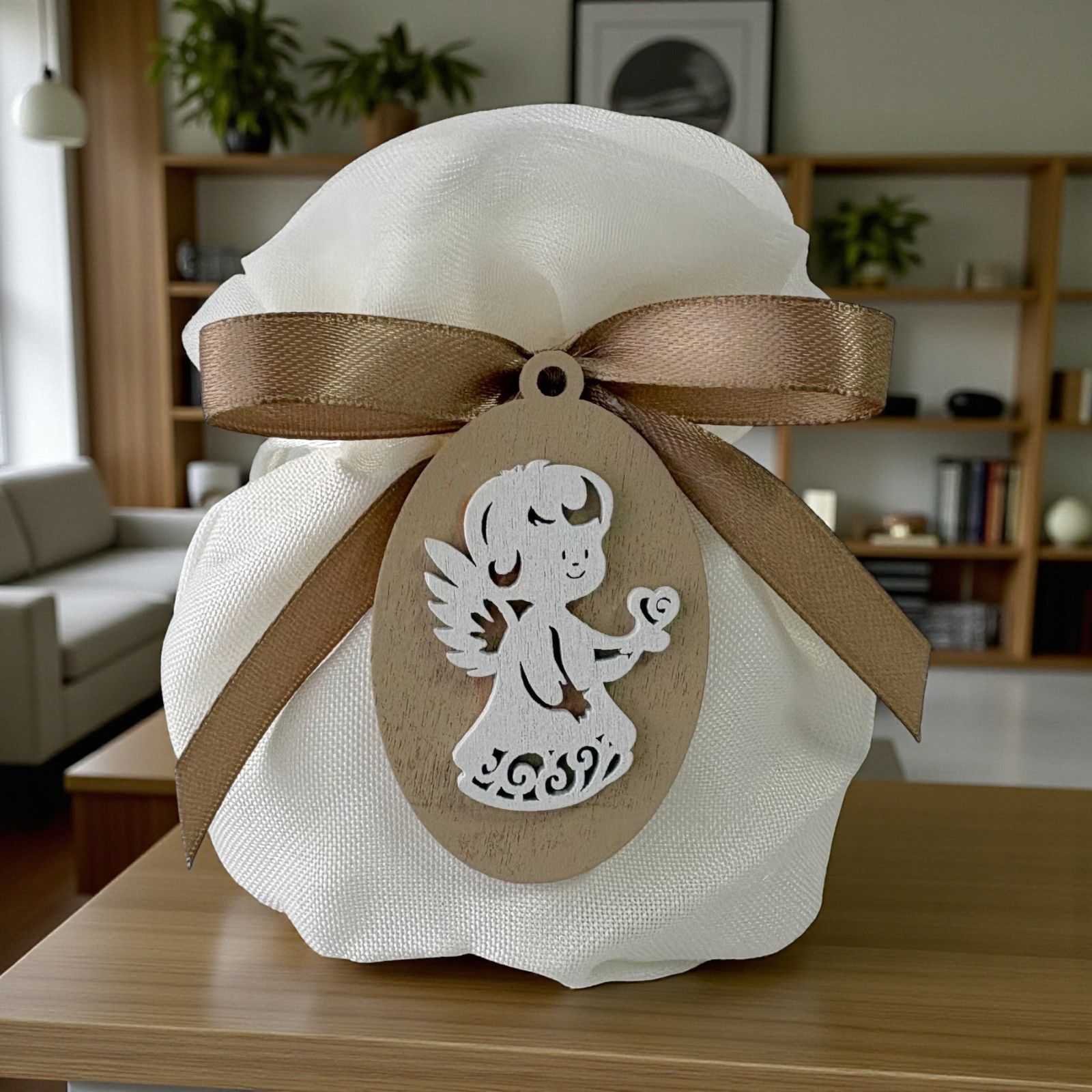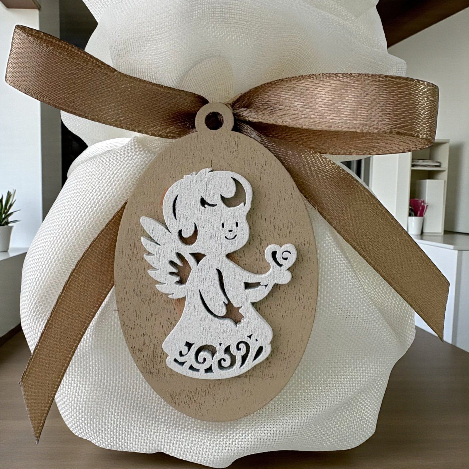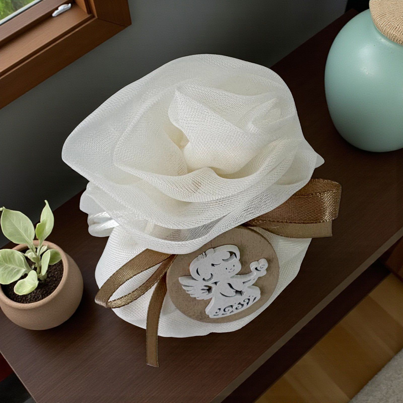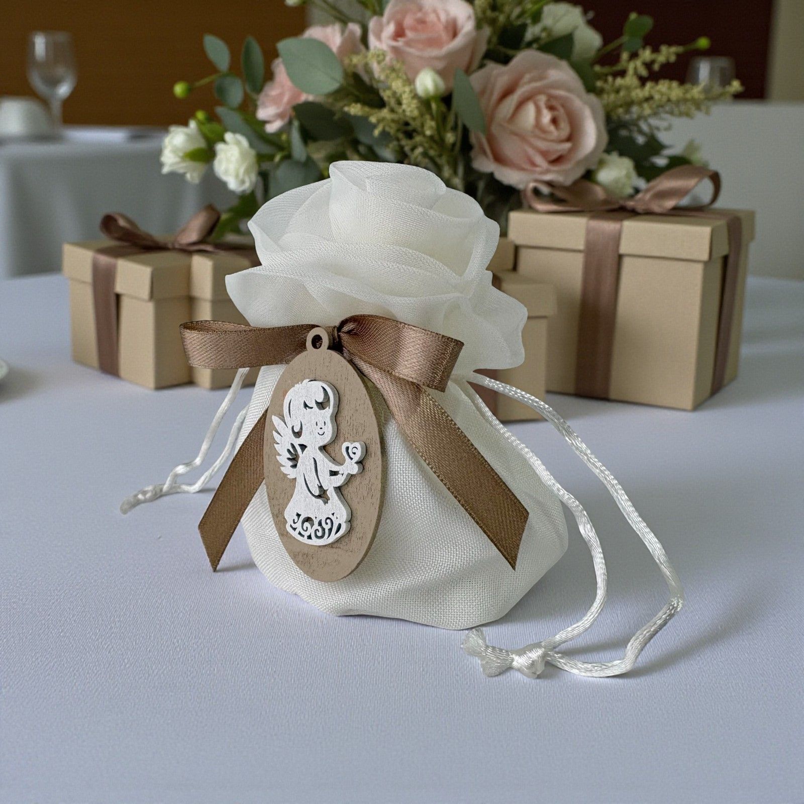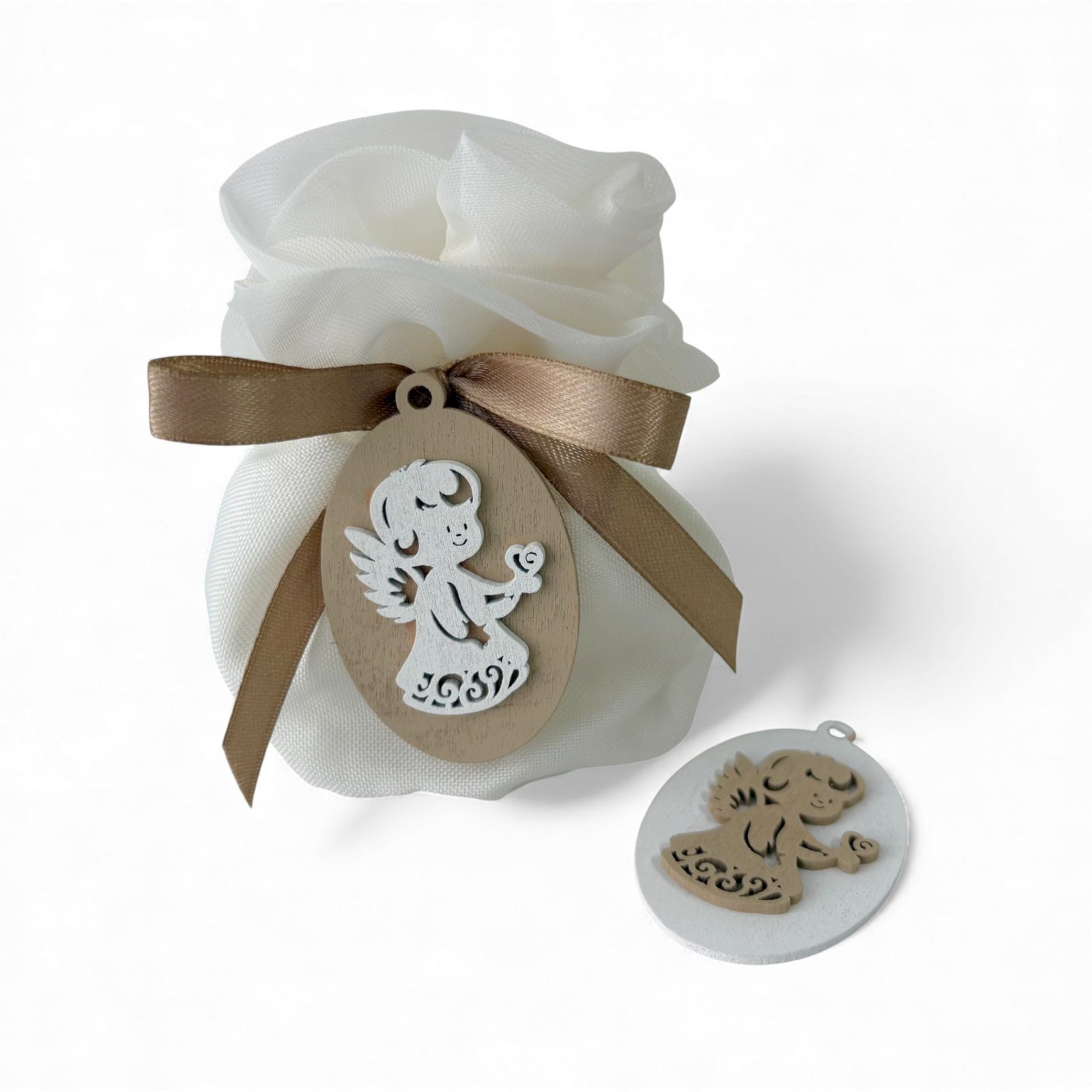 Ogni bomboniera racconta una storia, un momento speciale da condividere con le persone care. Il nostro sacchettino portaconfetti, chiuso con un delicato fiore a forma di rosa, rappresenta l'essenza di celebrazioni come battesimi e comunioni. La tenera applicazione di un angioletto con cuore su una mano simboleggia la protezione e l'amore, rendendo ogni occasione ancora più memorabile.