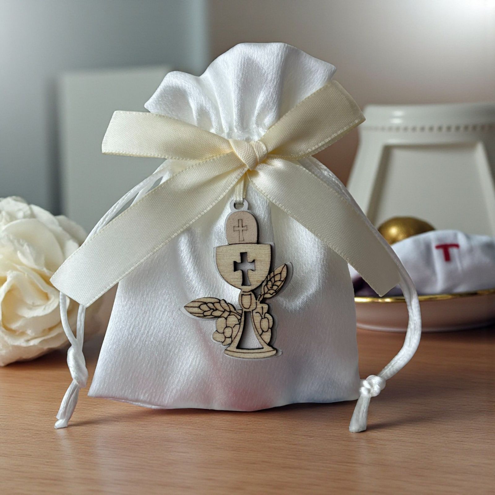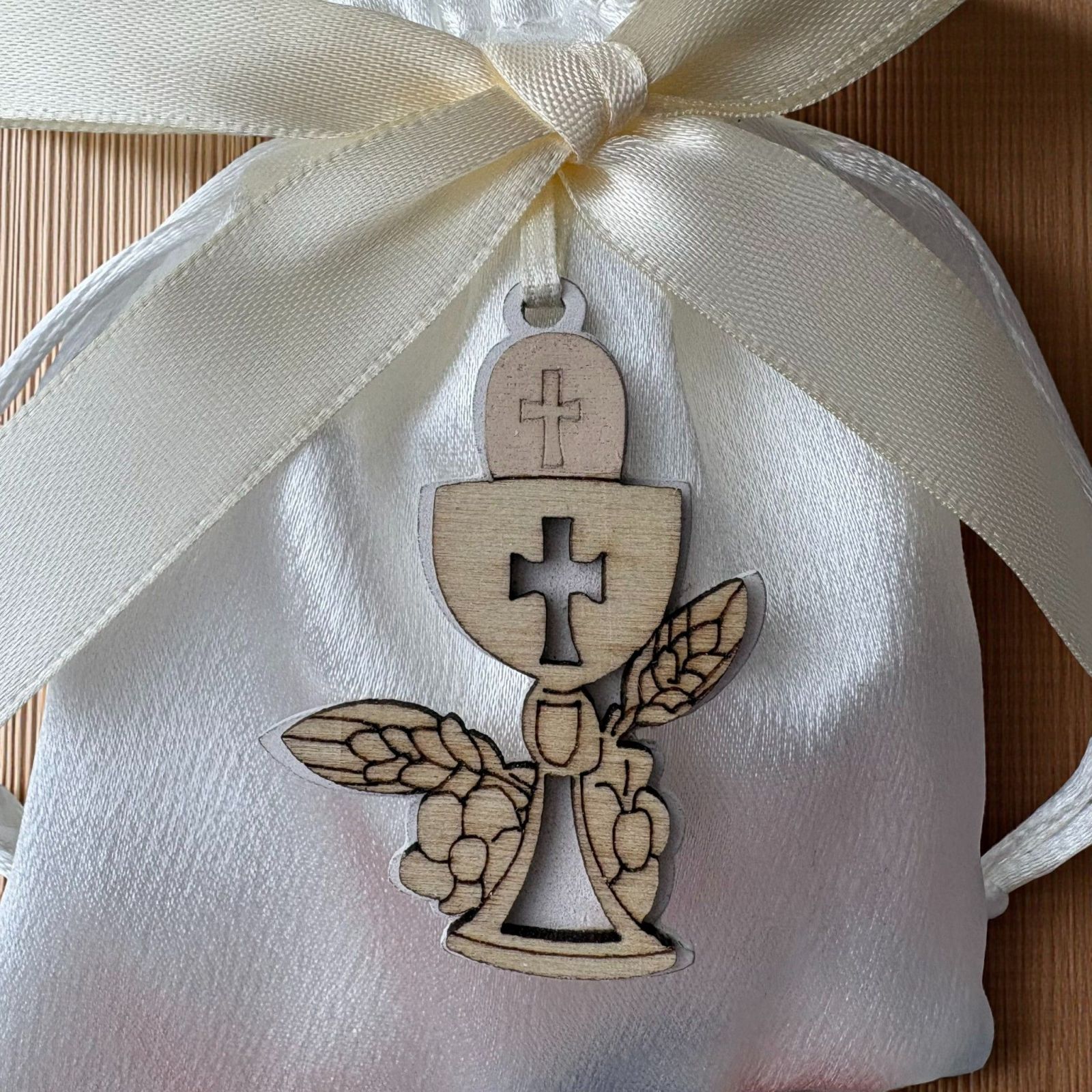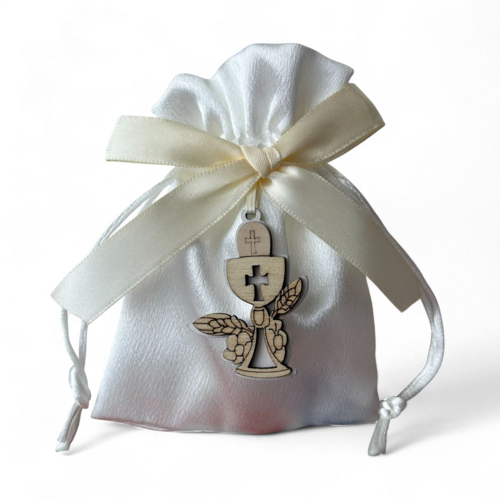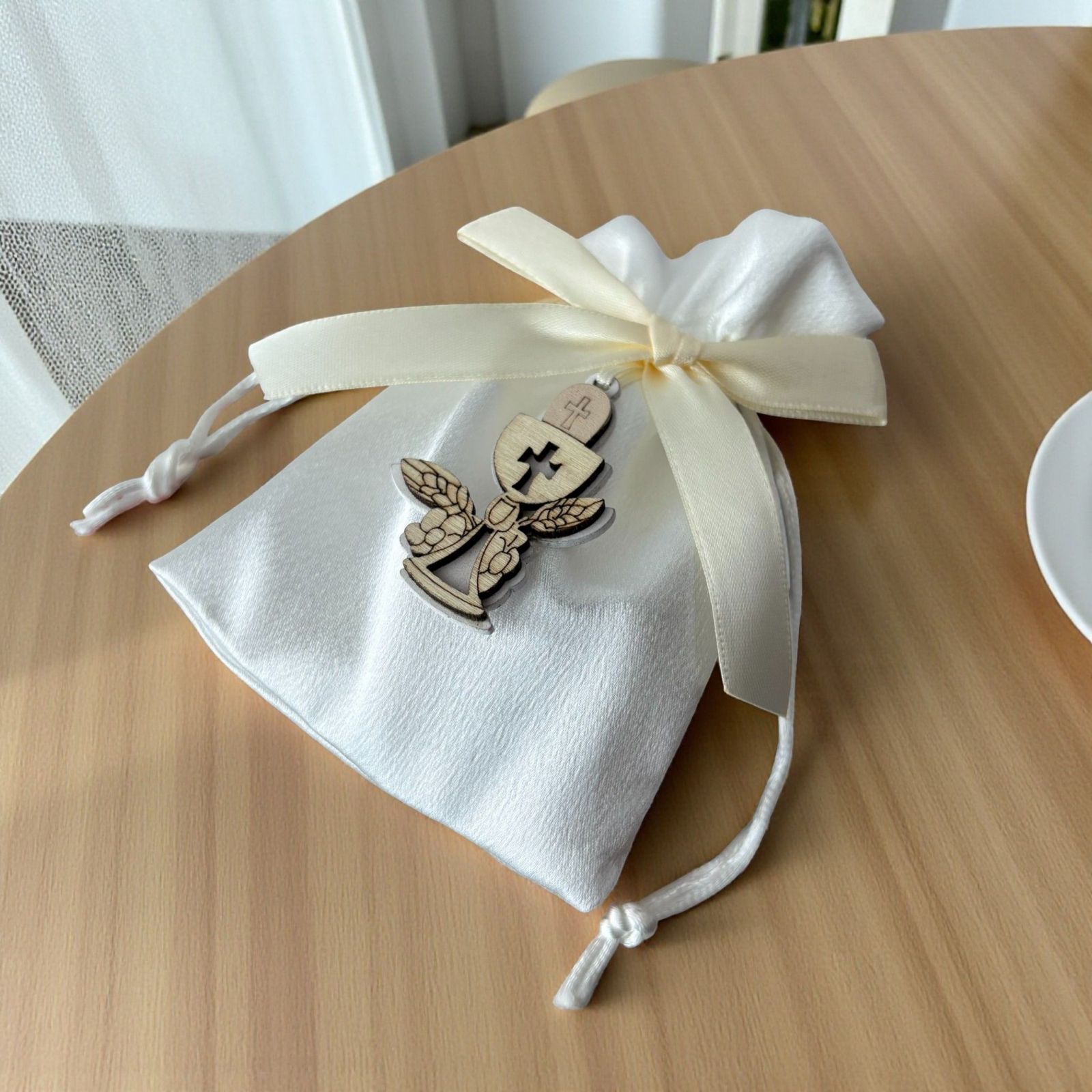 Realizzato in tessuto di alta qualità e rifinito con un delizioso fiocco color panna, questo sacchettino è adornato da un'applicazione in legno a forma di calice e ostia. Un omaggio alla sacralità della prima comunione, questi portaconfetti non sono solo un elegante segnaposto, ma anche un gesto affettuoso che i tuoi cari porteranno a casa, ricordando la bellezza di questo giorno.