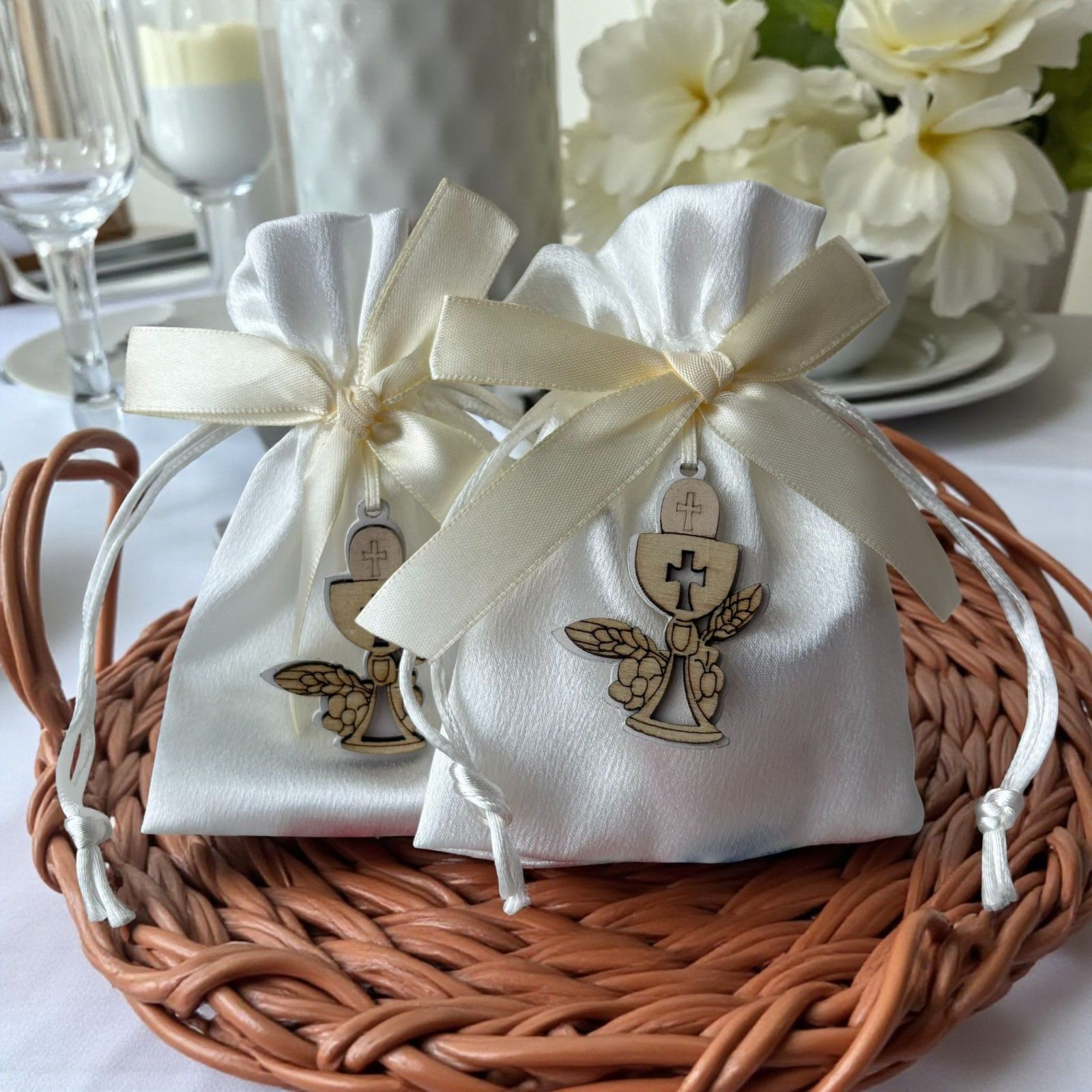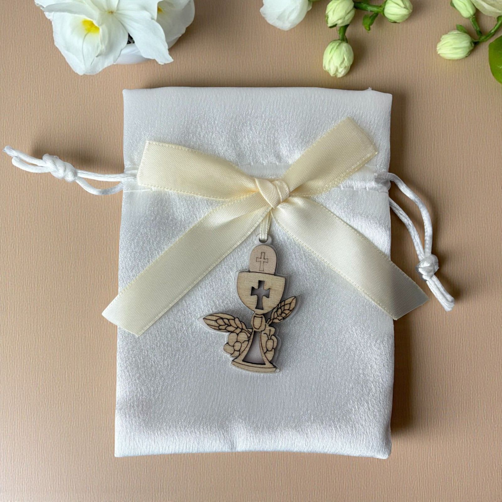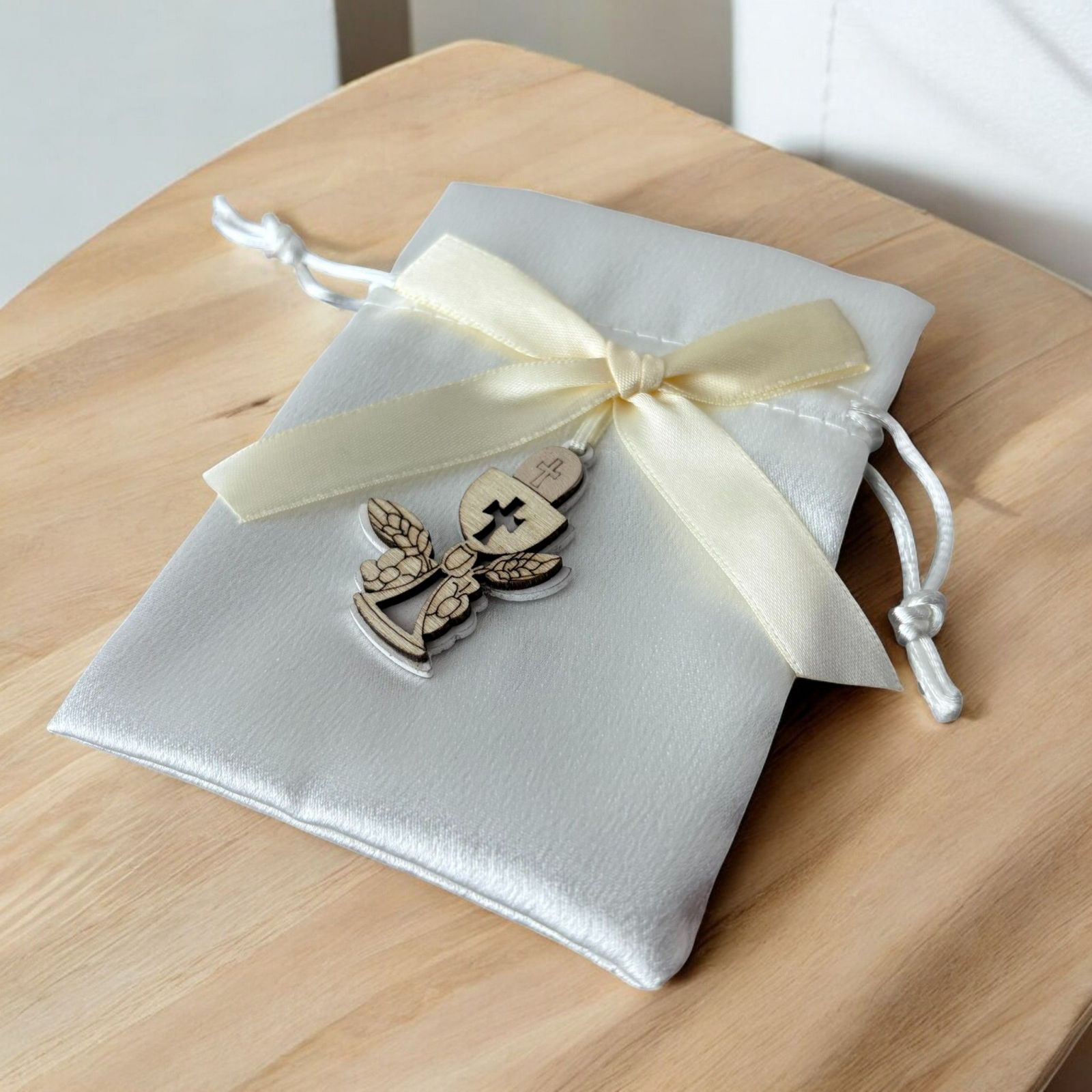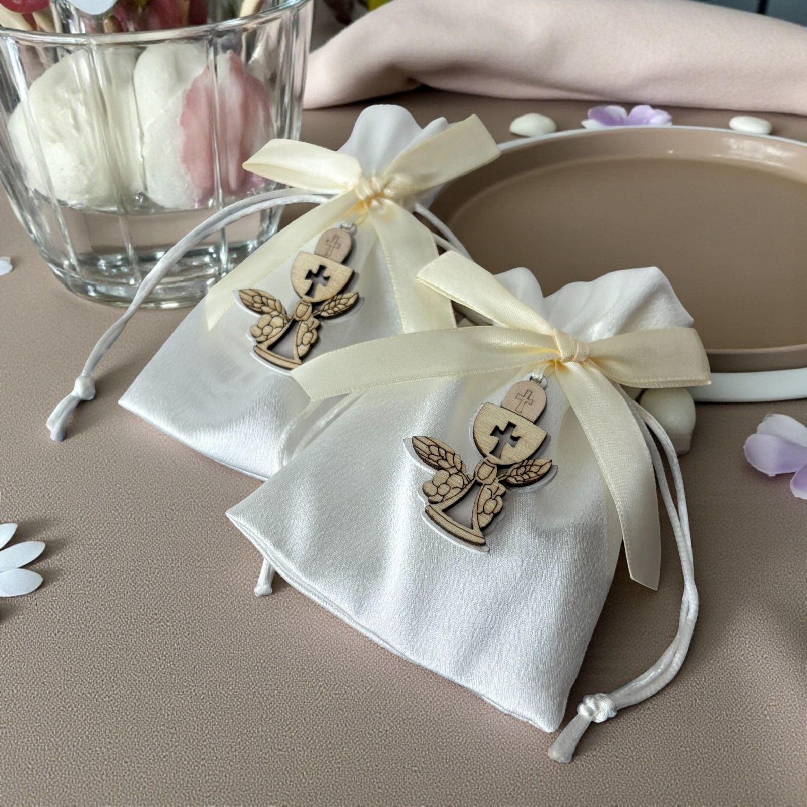 Realizzato in tessuto di alta qualità e rifinito con un delizioso fiocco color panna, questo sacchettino è adornato da un'applicazione in legno a forma di calice e ostia. Un omaggio alla sacralità della prima comunione, questi portaconfetti non sono solo un elegante segnaposto, ma anche un gesto affettuoso che i tuoi cari porteranno a casa, ricordando la bellezza di questo giorno.