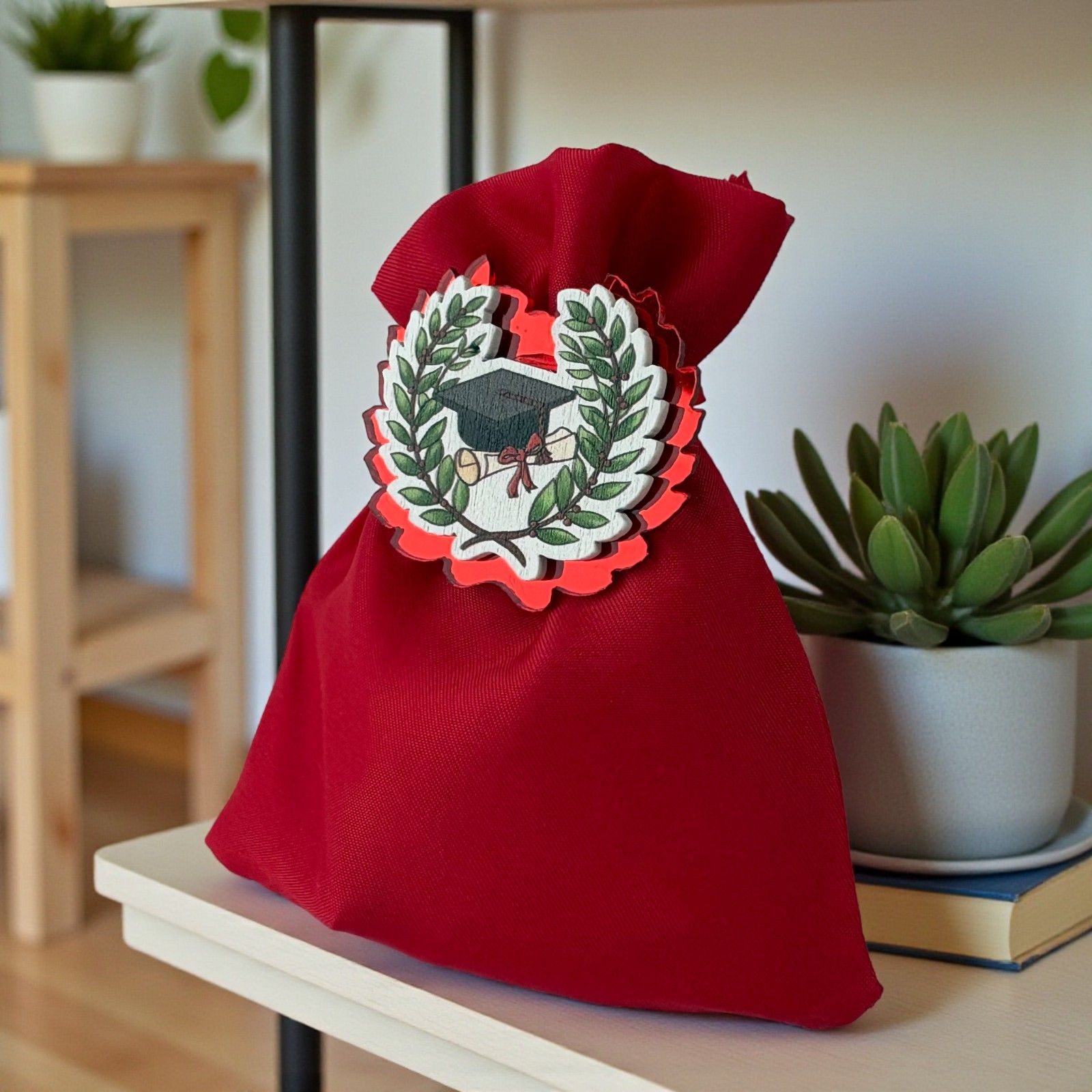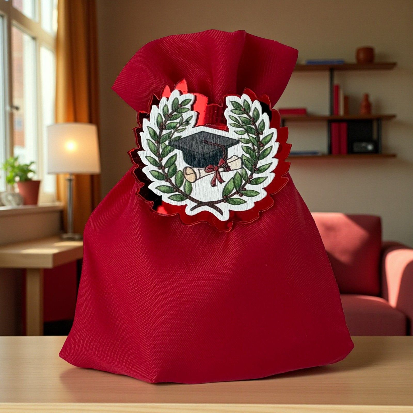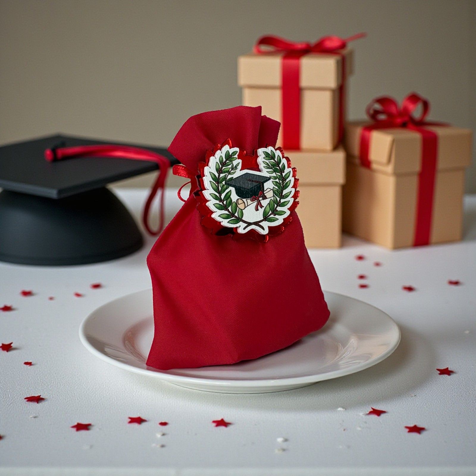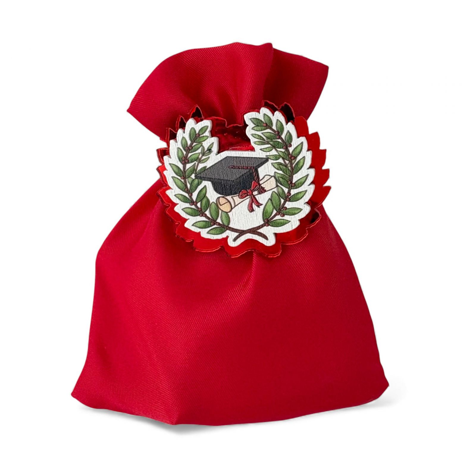 Celebrare con stile gli ospiti con questo elegante sacchetto rosso in cotone impreziosito da una calamita in plexiglass e legno: la delicata corona d'alloro reca al centro il tocco e la pergamena su uno sfondo bianco, rendendo questa bomboniera laurea un ricordo raffinato e ricco di significato.