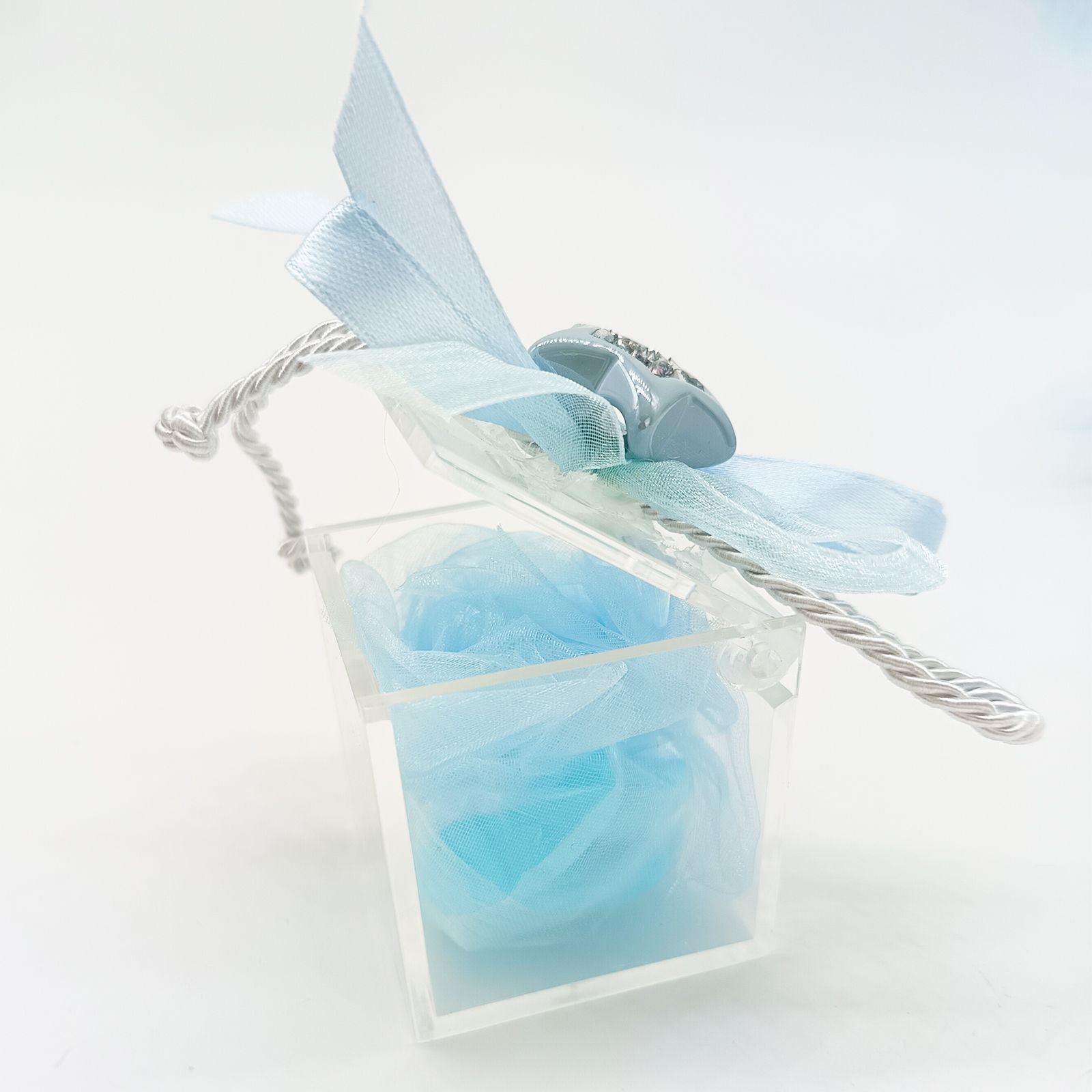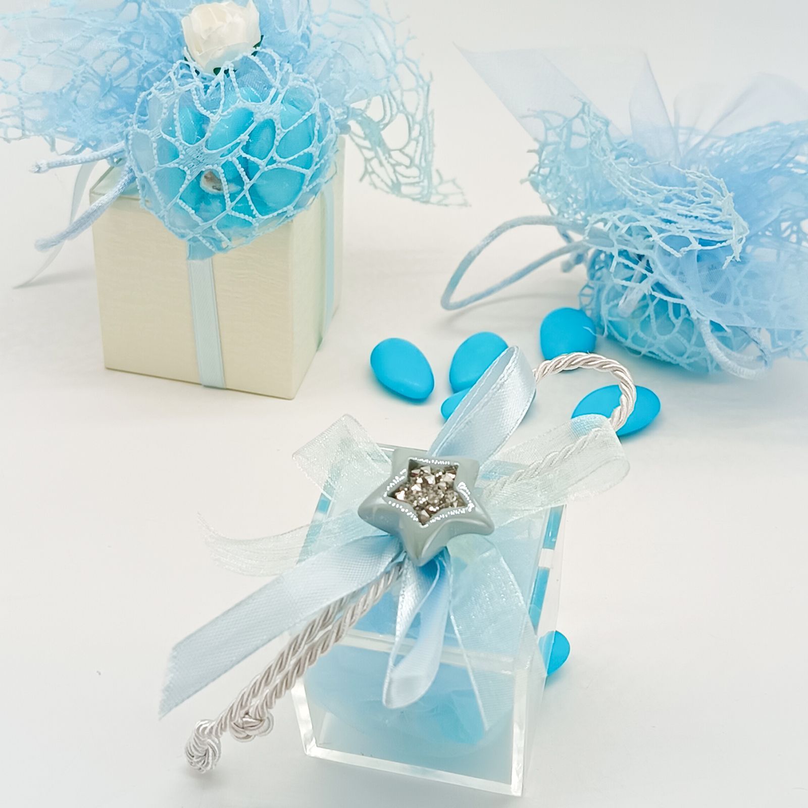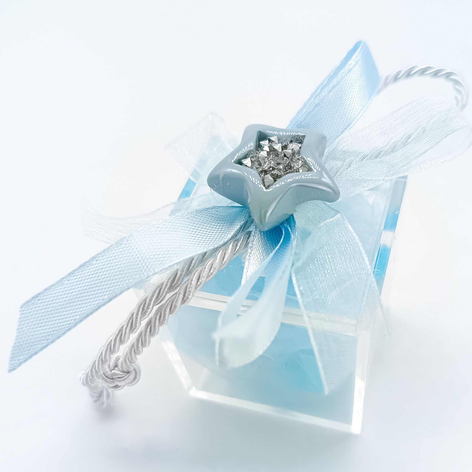 Rendi speciale ogni occasione con questa scatolina confetti trasparente in plexiglass, perfetta per la nascita o il battesimo di un dolce maschietto. Il portaconfetti è impreziosito da un appendino con una stellina celeste in resina e stoffa, alta circa 14 cm, decorata con un nastrino celeste e un cordoncino coordinato.