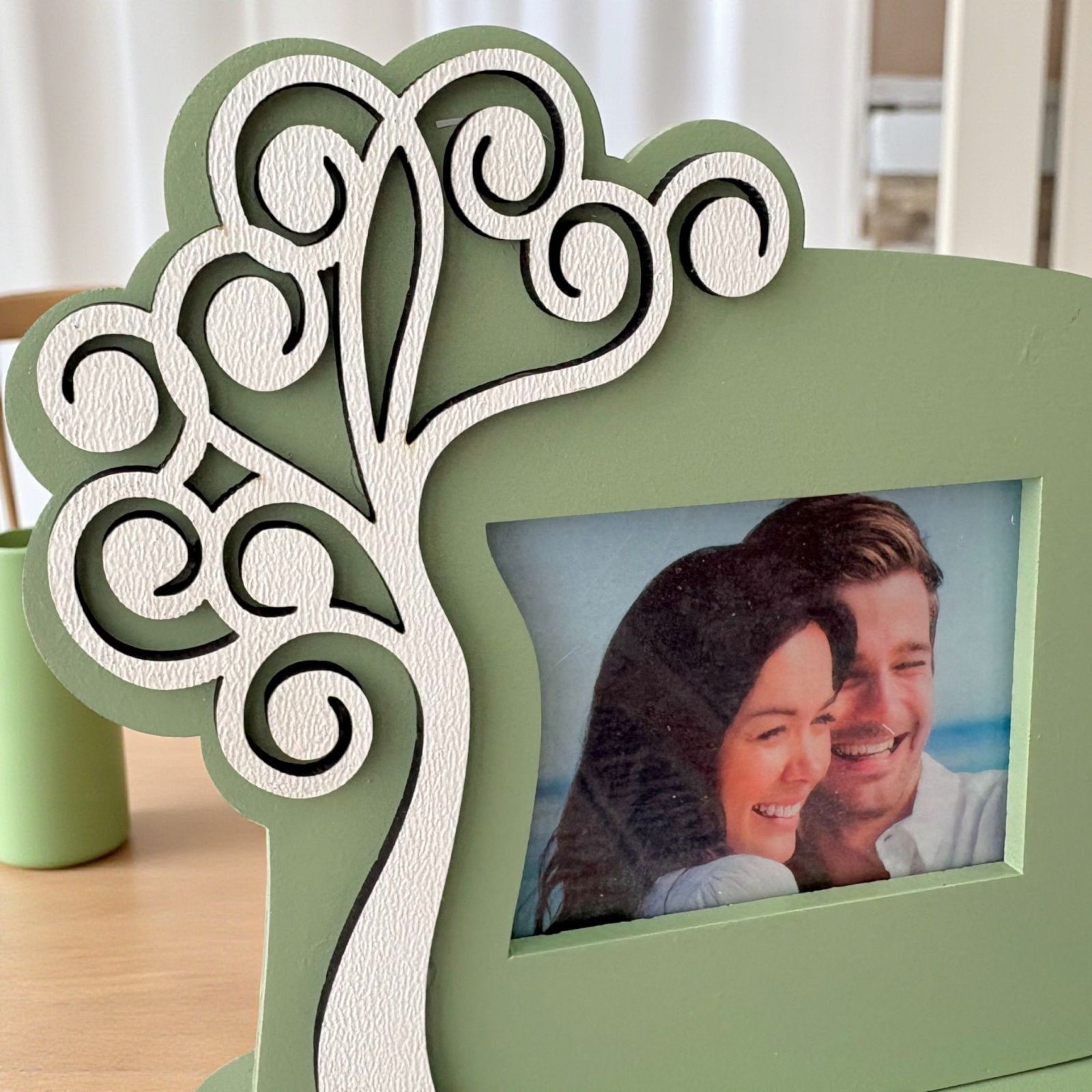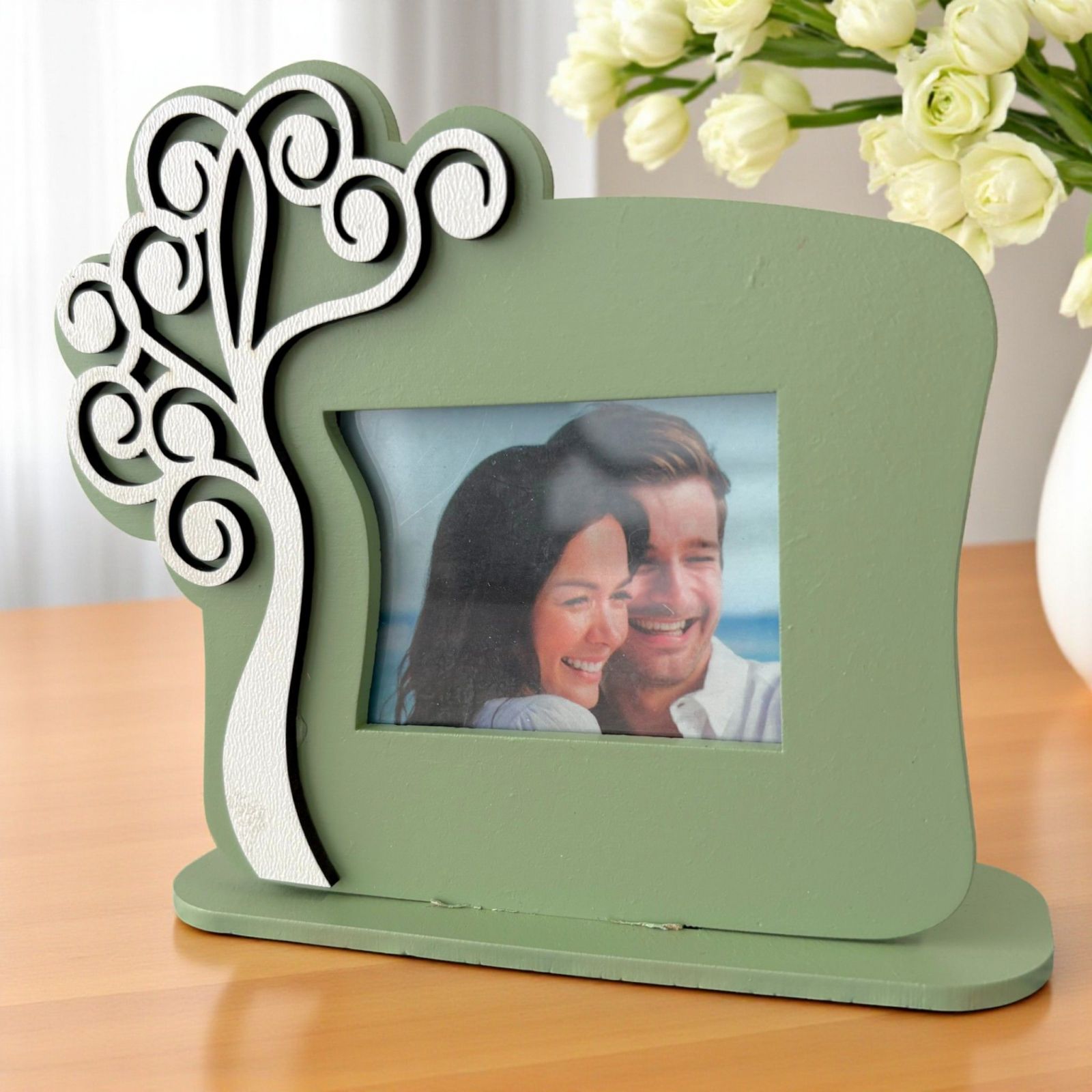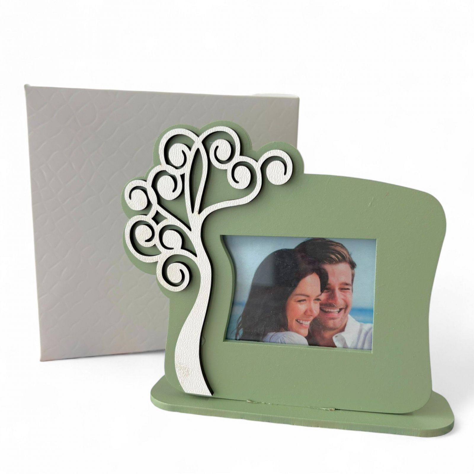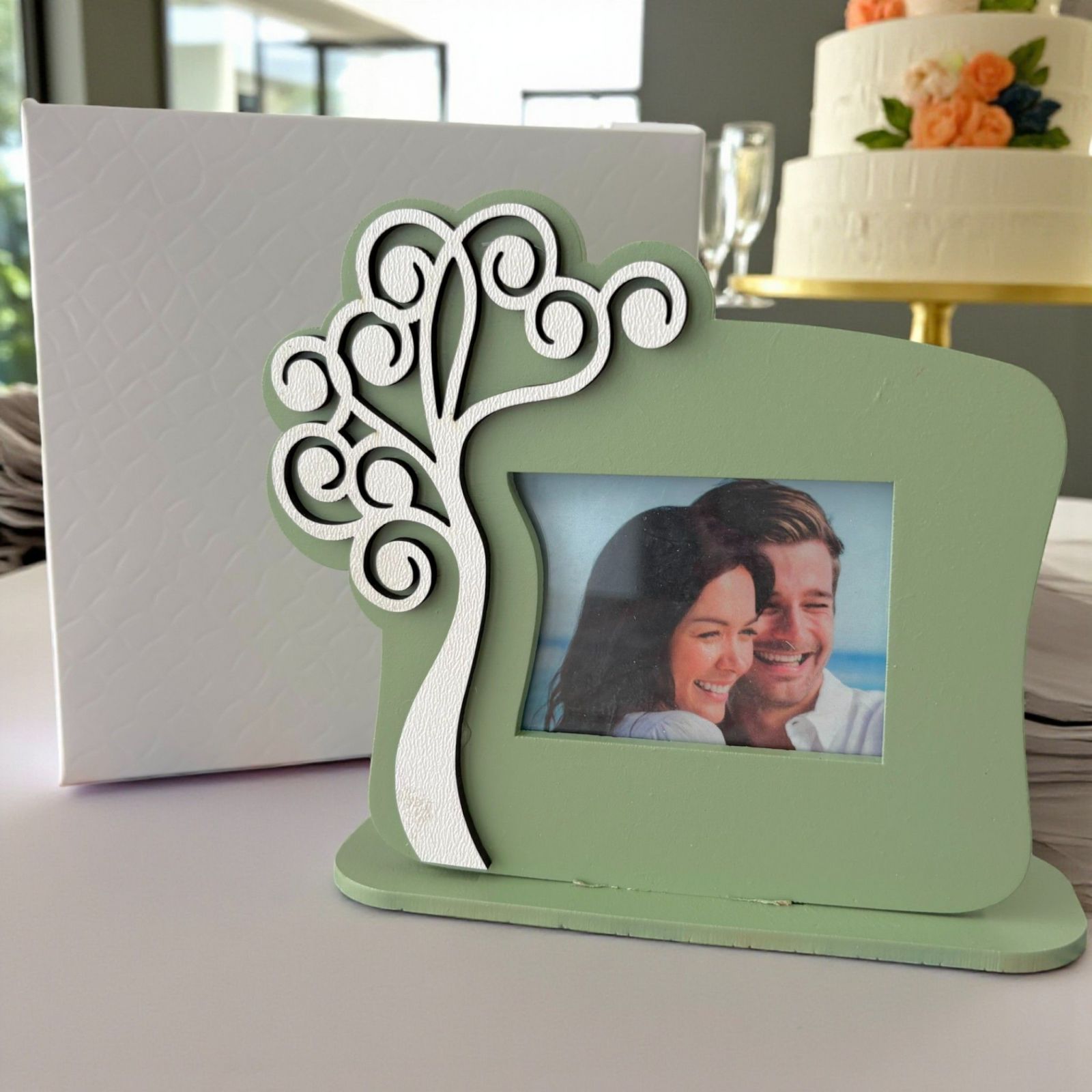 Realizzata in legno di alta qualità, la cornice si tinge di un delicato verde salvia, mentre l’albero bianco stilizzato rappresenta la crescita e la prosperità. Questo elegante design rende le nostre bomboniere matrimonio originali non solo belle da vedere, ma anche pratiche e significative. Ogni cornice viene consegnata con una scatola regalo in omaggio, per un tocco extra di cura e raffinatezza.