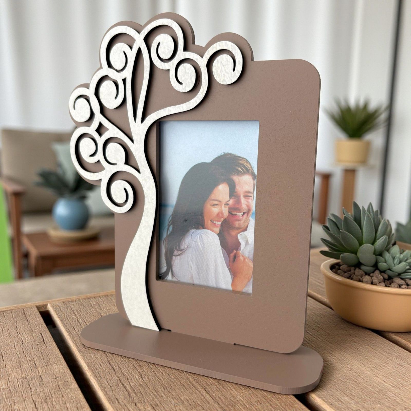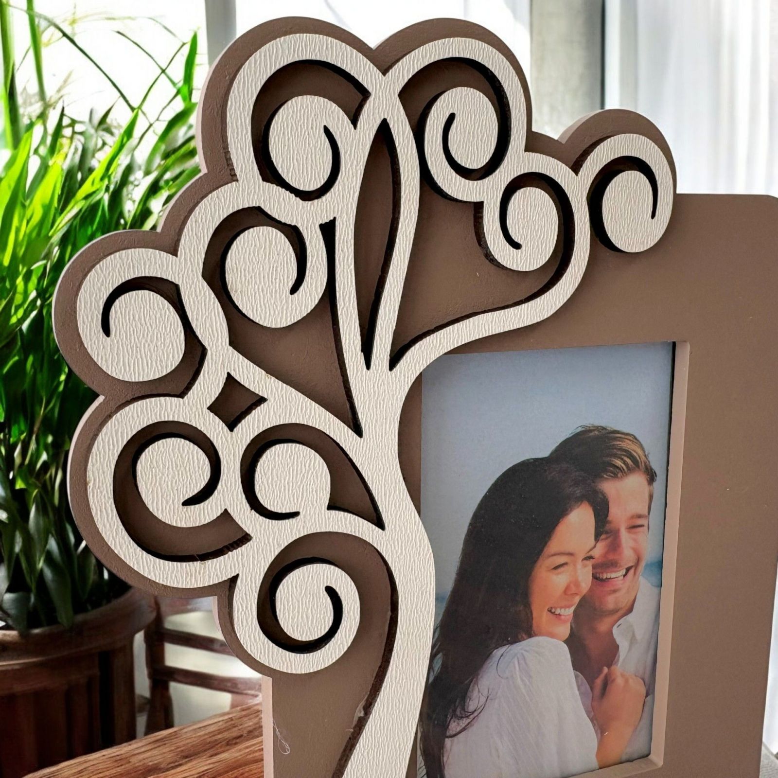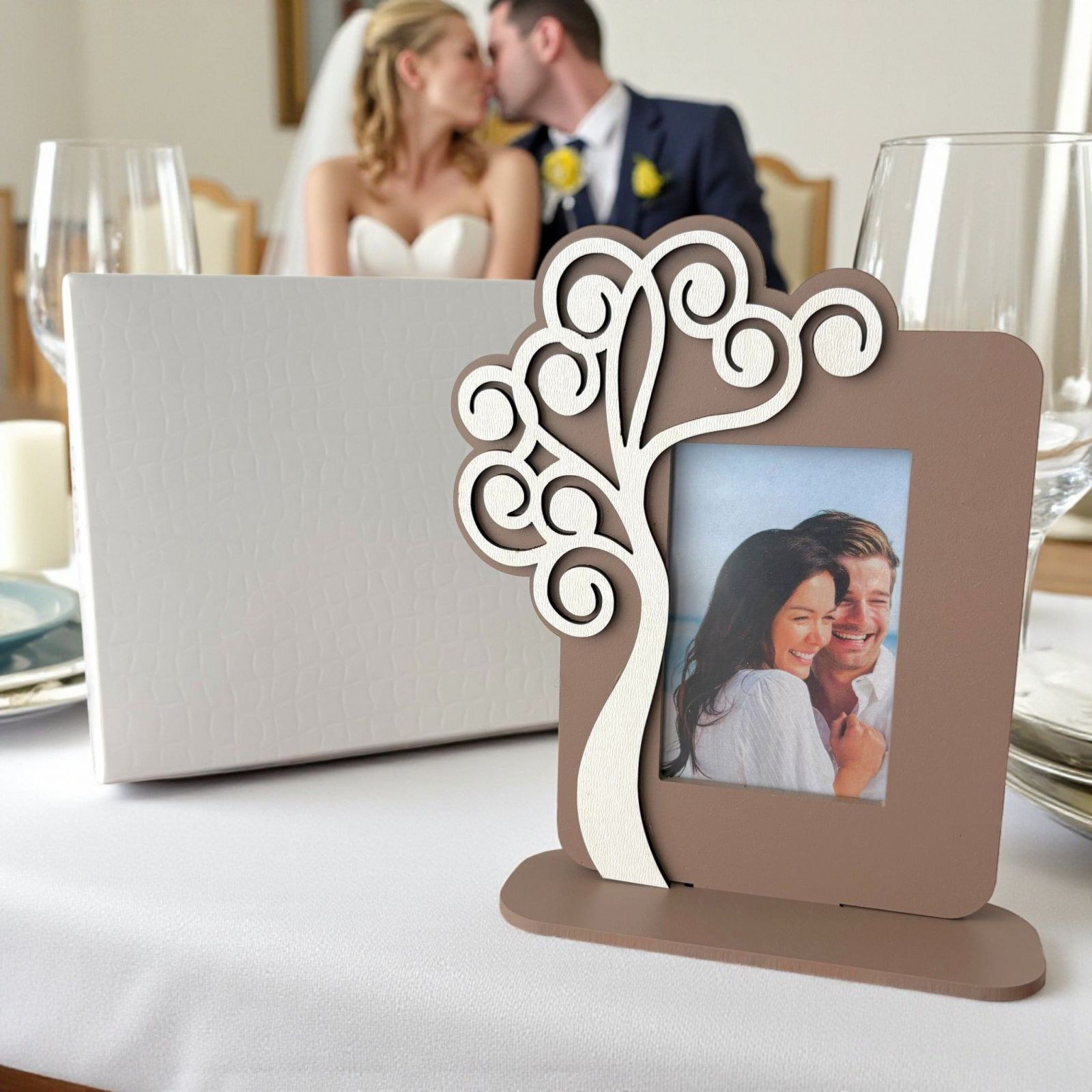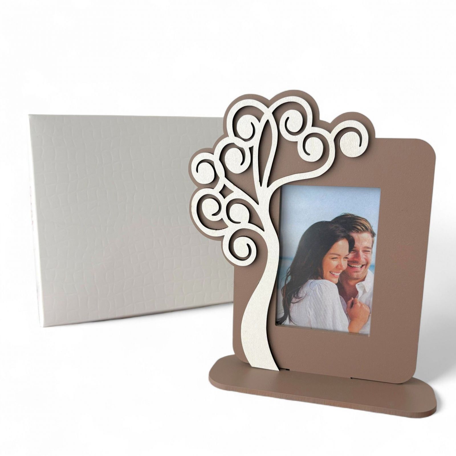 Scopri la nostra cornice portafoto con albero della vita bianco stilizzato, un'idea regalo speciale per i tuoi momenti più preziosi. Questa bomboniera, realizzata in legno di alta qualità e in eleganti tonalità tortora e bianco, simboleggia l'unione e la crescita, rendendola perfetta per celebrare il tuo matrimonio o un anniversario indimenticabile. Ogni volta che la guarderai, sarai avvolto da ricordi felici e dall'amore che vi unisce.