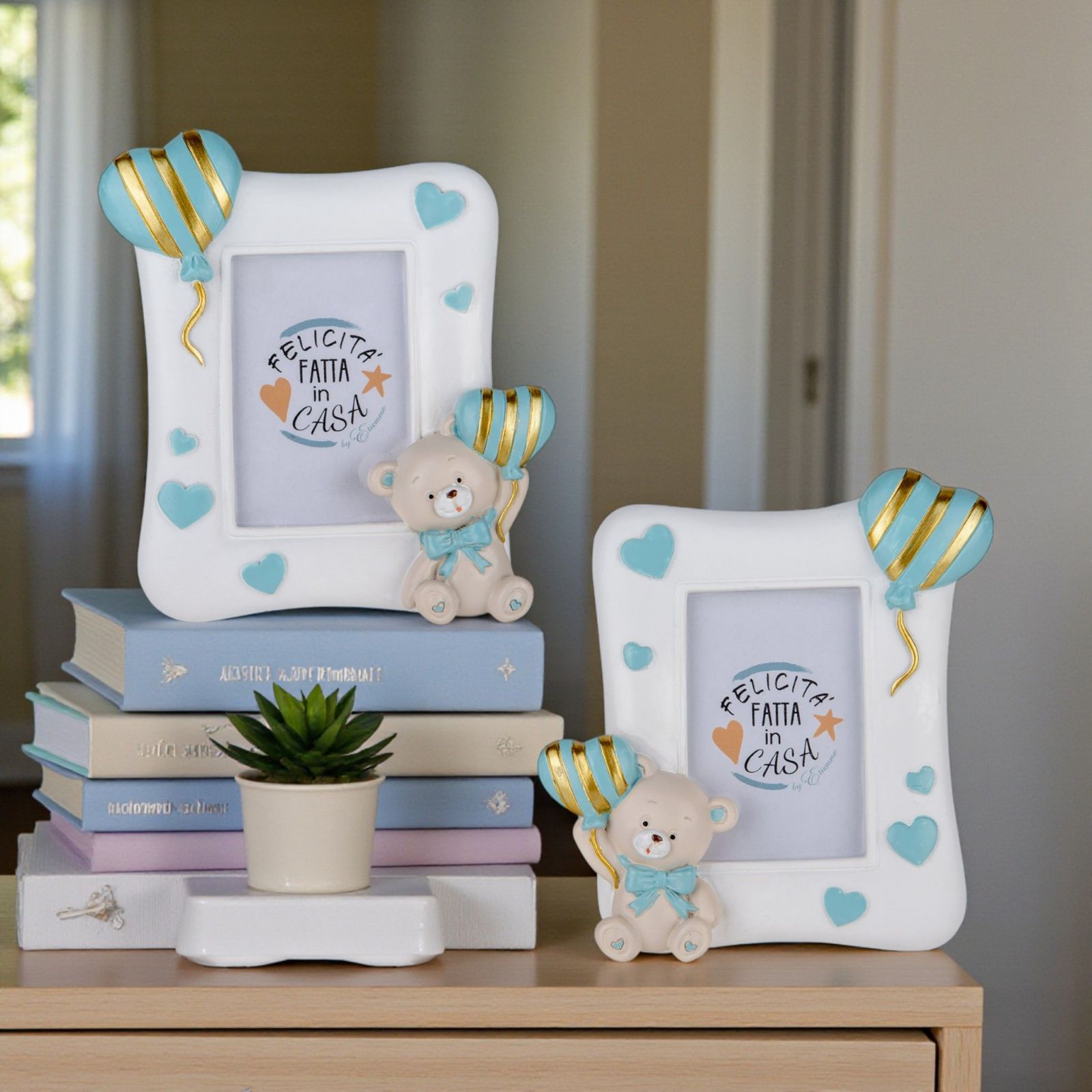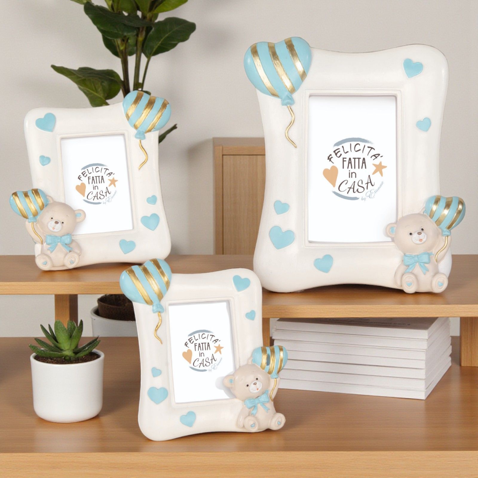 Realizzata in resina, la cornice è dipinta in un elegante grigio con dettagli celesti e oro, arricchita da un dolce fiocco e cuoricini azzurri. Questa bomboniera non è solo originale ed economica, ma rappresenta anche un'idea bomboniera maschietto che farà felici tutti gli invitati, lasciando un segno indelebile nei loro cuori.