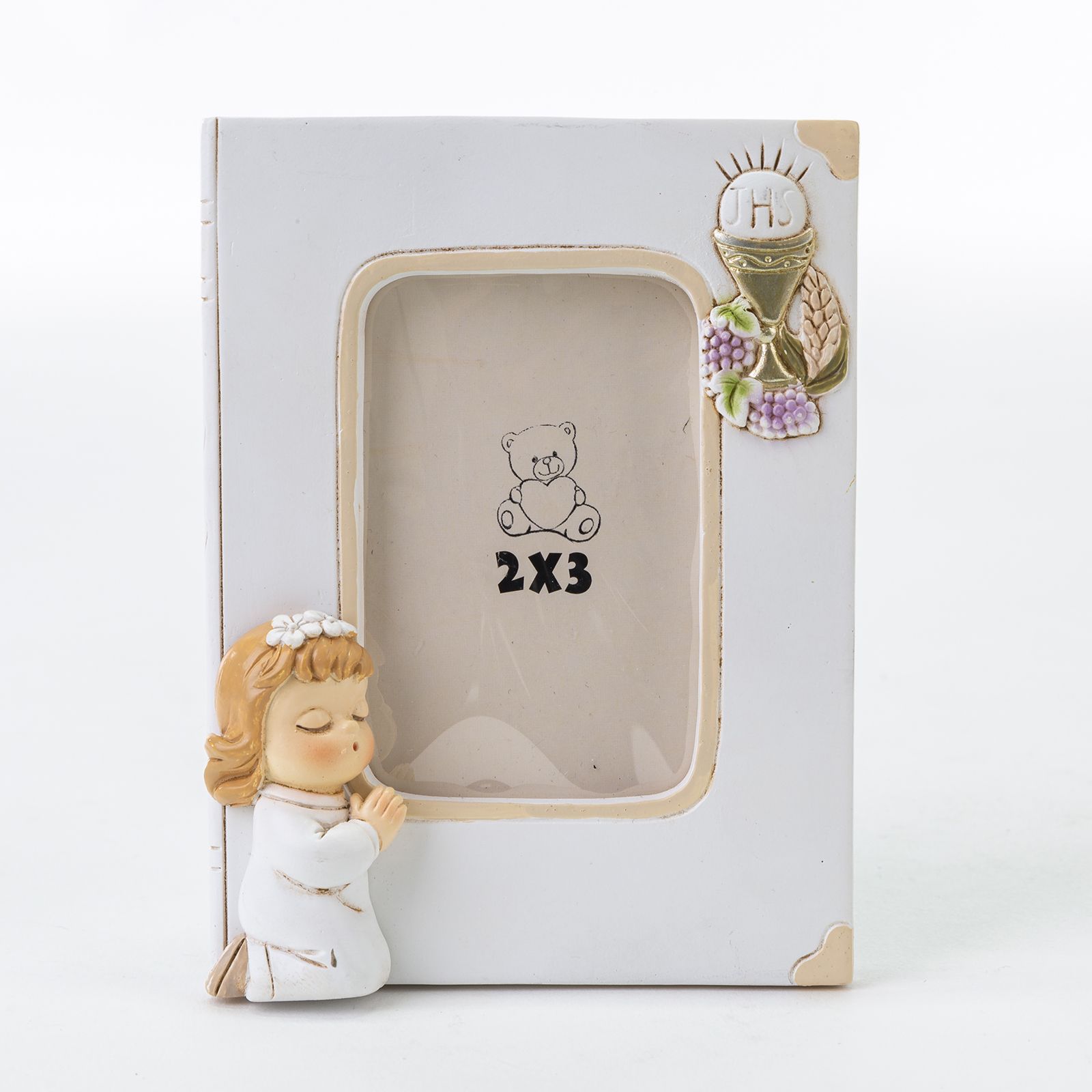 Come le nostre cornici portafoto in resina, di colore bianco con alla base raffigurata una bambina ritratta inginocchiata con le mani giunte nell'atto di pregare con una coroncina di fiori tra i capelli. In alto a destra, invece, è rappresentato il calice con l'Ostia, il grappolo d'uva e la spiga di grano, ovvero i simboli della Comunione.