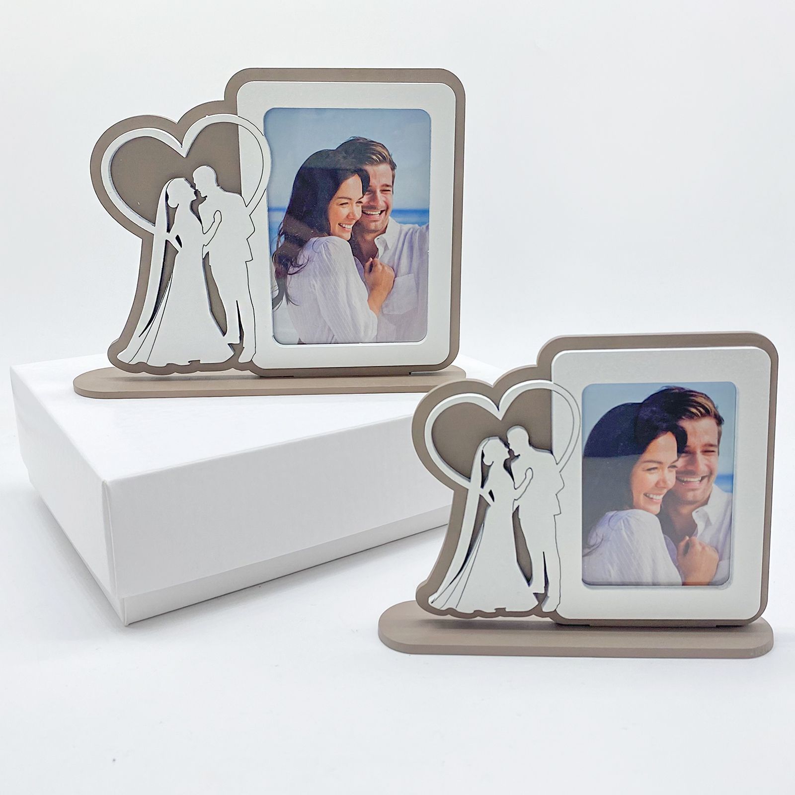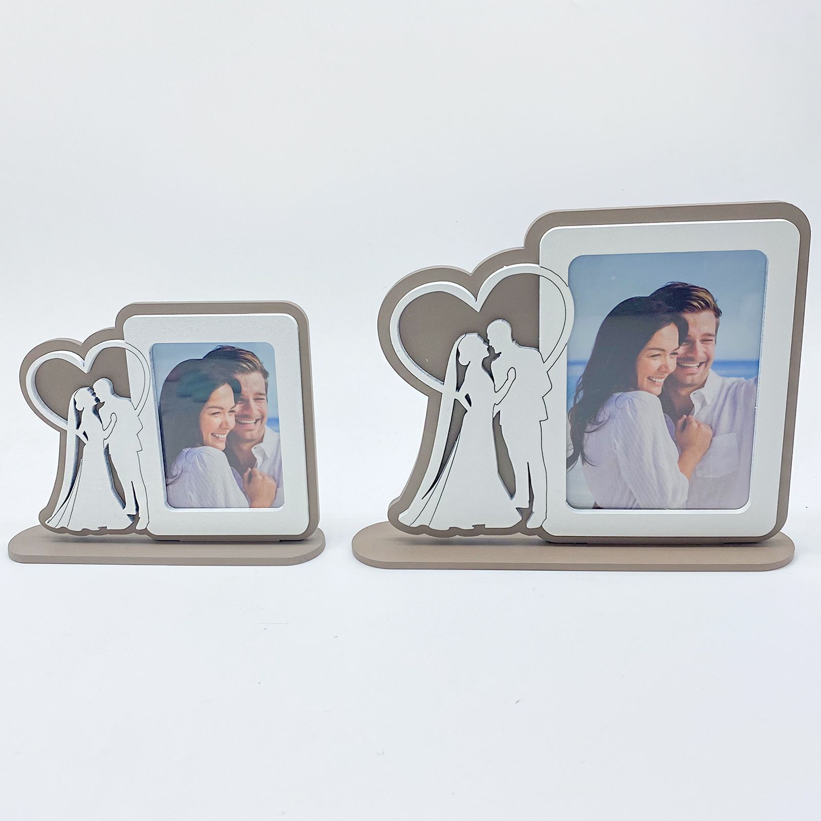 Portafoto da tavolo in legno color tortora con dettagli in bianco, raffigurante accanto alla cornice la sagoma di due sposi circontati da un cuore.