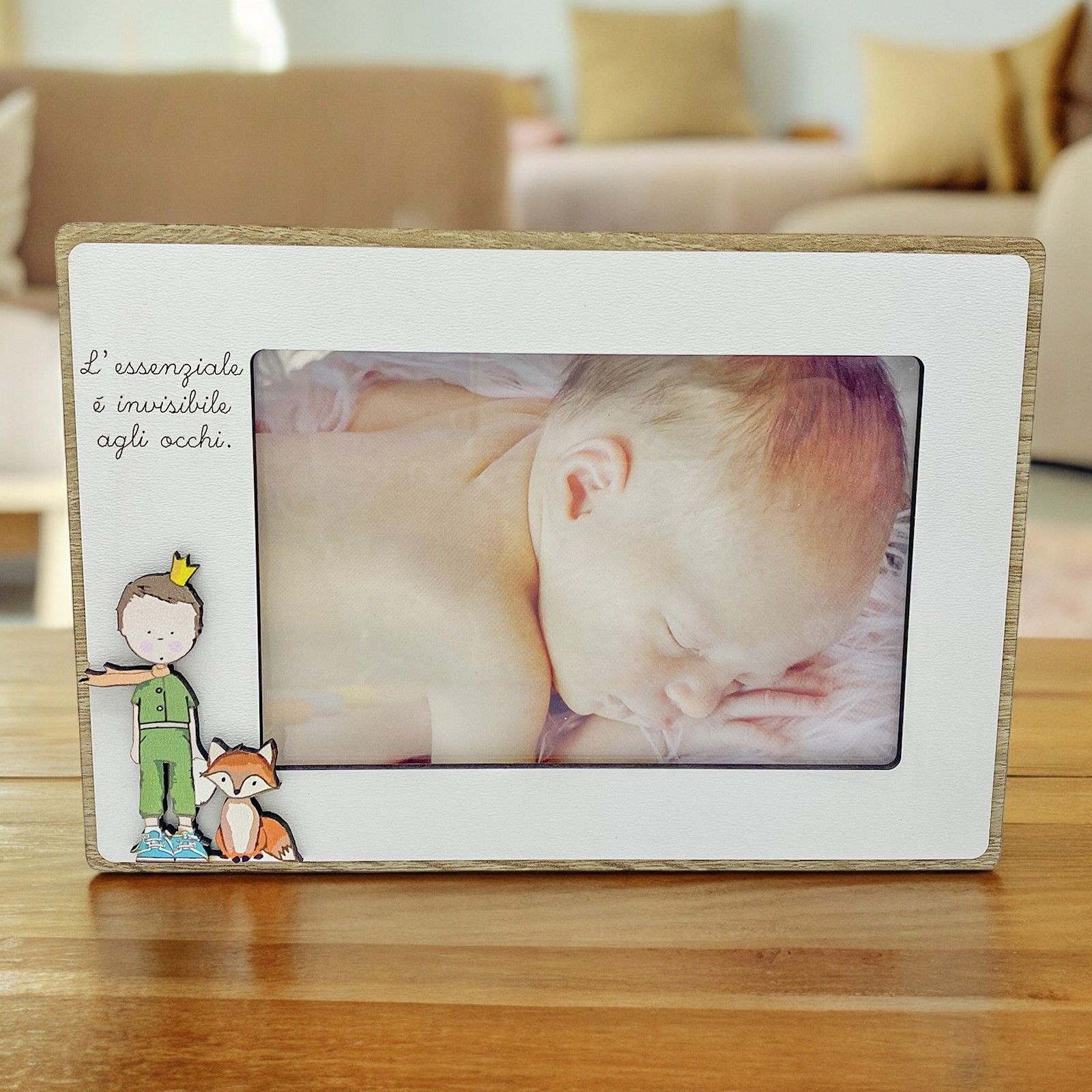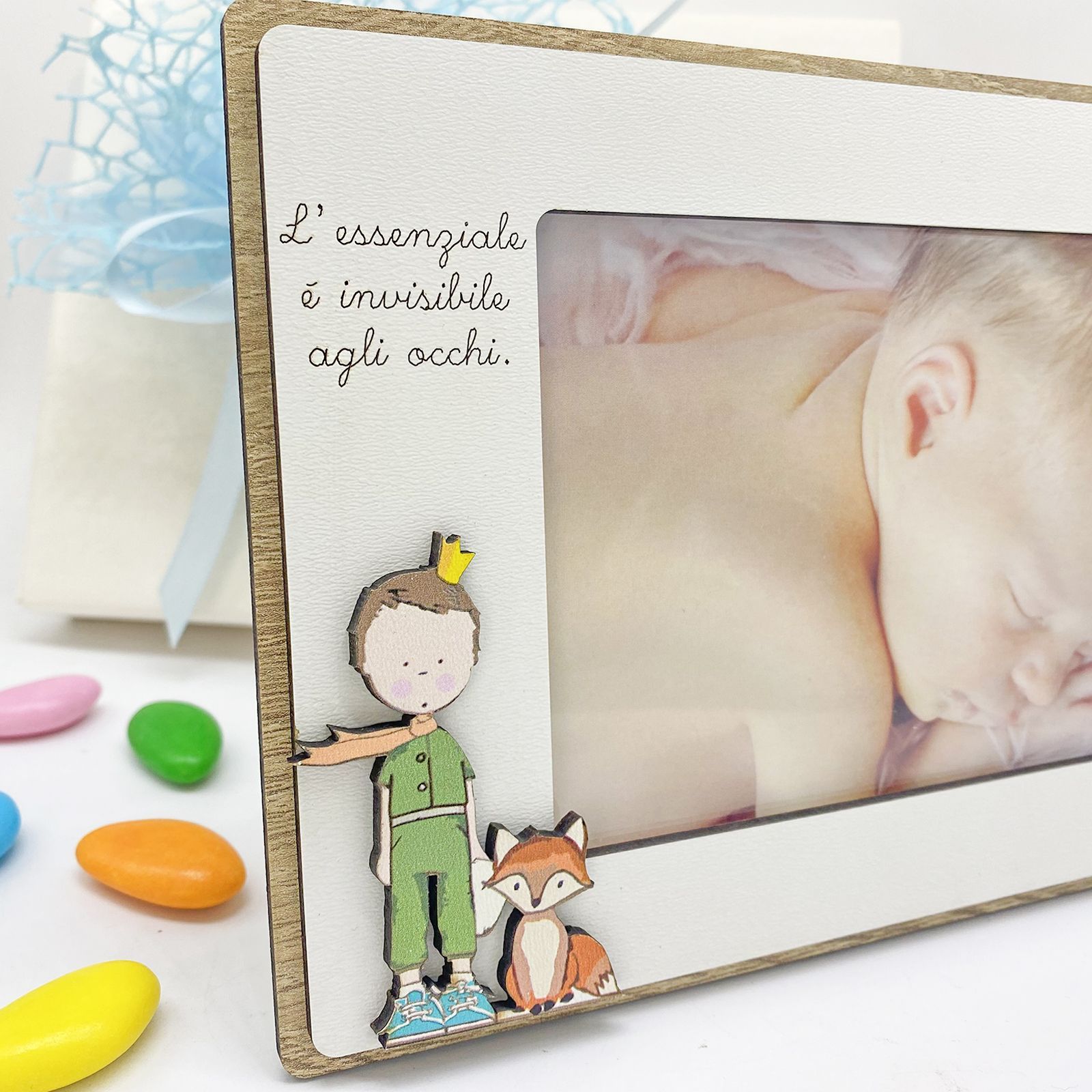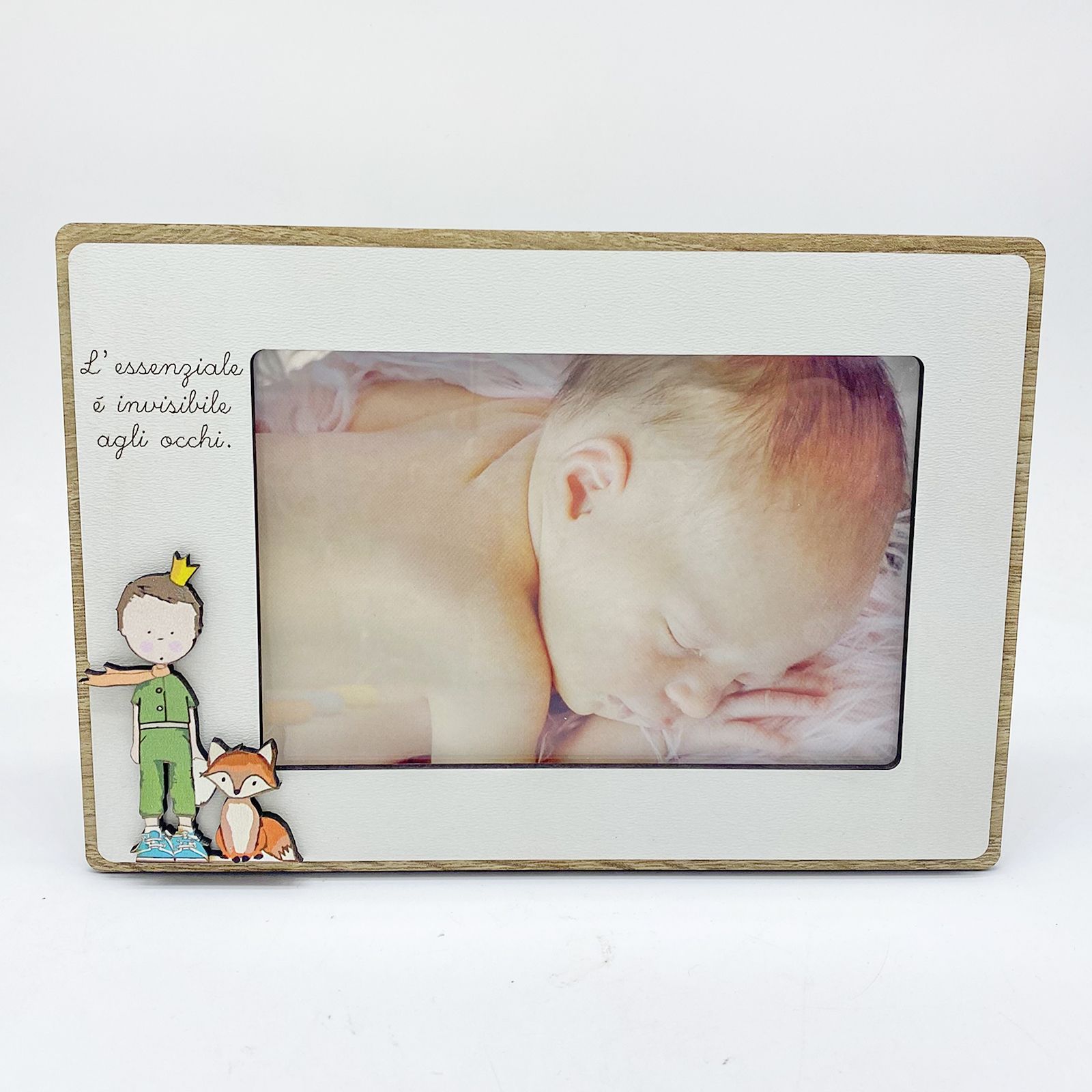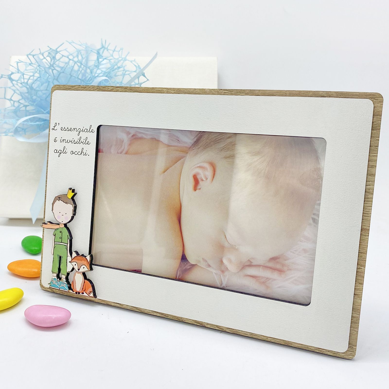 Realizzato in legno nei toni eleganti del bianco e del color legno naturale, il portafoto Piccolo Principe presenta un'incisione con la frase iconica "L'essenziale è invisibile agli occhi", evocando la magia delle storie senza tempo. Ogni dettaglio racconta una storia di gioia e speranza, invitando a celebrare l'innocenza e la bellezza dei momenti speciali.