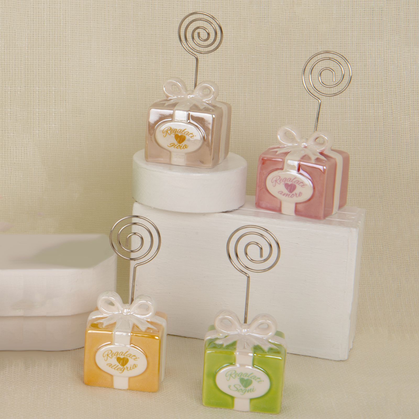 Realizzata in pregiata porcellana e assortita nei colori verde, arancio, rosa e panna, questa bomboniera è un simbolo di gioia, amore, sogni e allegria, ideale per trasmettere messaggi positivi e significativi ai tuoi ospiti.