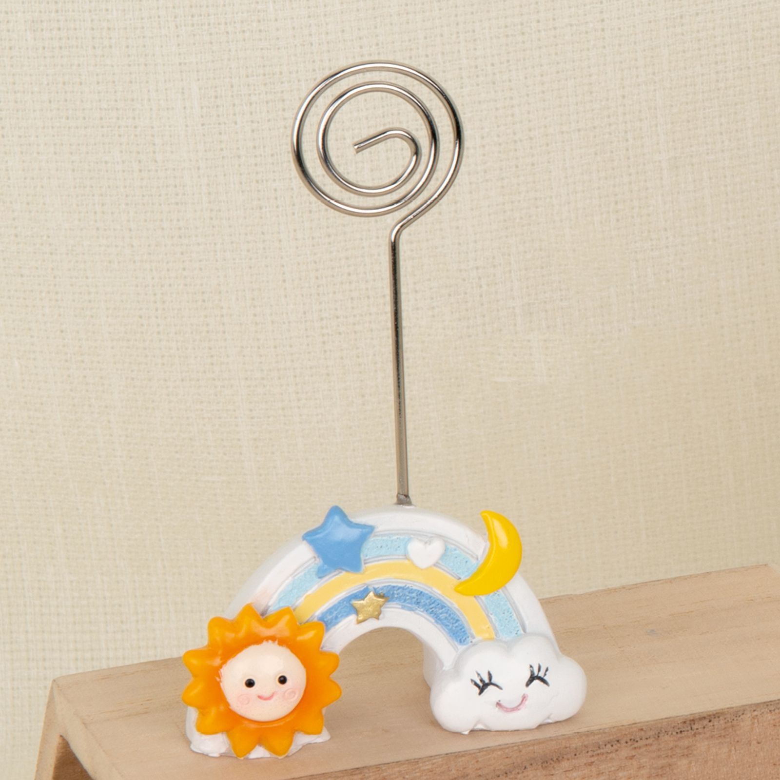 Il Memoclip con asta con arcobaleno con sole e nuvoletta sorridente, decorato con stelline, luna e cuoricino, è un'idea originale e creativa per le tue bomboniere. Questo gadget colorato è perfetto per eventi come la nascita, il battesimo o il babyshower, e sarà sicuramente apprezzato dai tuoi invitati.