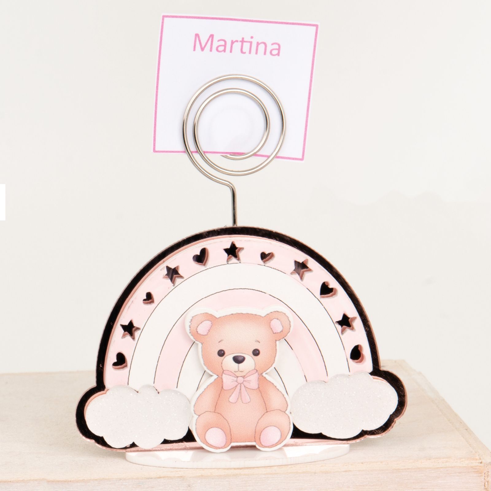 Realizzato in plexiglass e legno, questo Memoclip ha dimensioni di circa 7 cm e presenta un orsetto con un fiocco rosa, alle spalle un arcobaleno decorato da stelline e cuoricini. Il delicato colore rosa e bianco lo rende perfetto per una bambina, aggiungendo un tocco di eleganza e femminilità all'evento.
