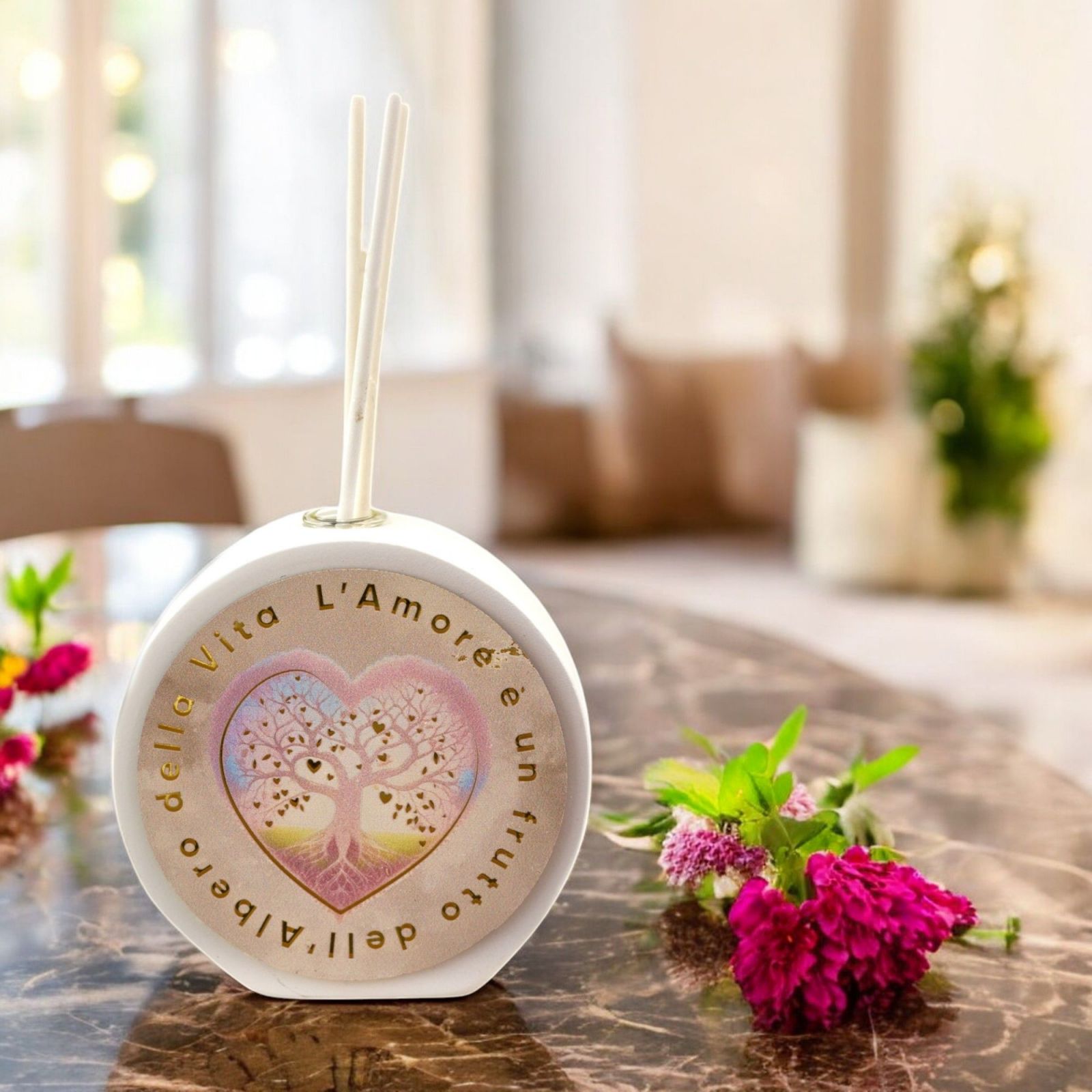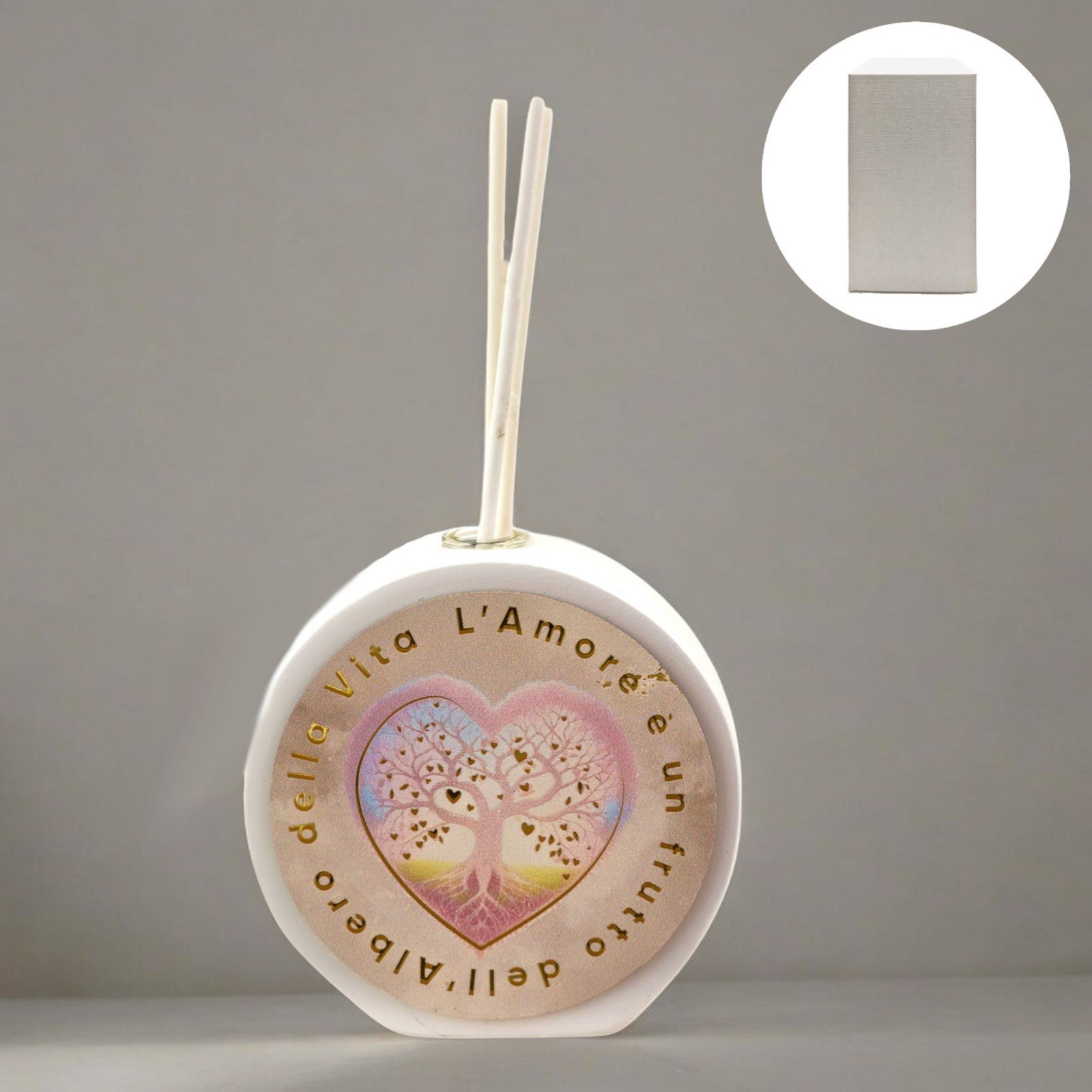 Il profumatore tondo è decorato con un albero della vita e un cuore che porta incisa la frase "L'amore è il frutto dell'albero della vita", simbolo di amore eterno e prosperità. L'albero della vita è un potente simbolo di connessione e rinascita, che rappresenta le radici profonde dell'amore, della crescita e dell'eternità. Questo simbolo universale di interconnessione e abbondanza rende la bomboniera un regalo ancora più speciale. La frase incisa aggiunge un significato profondo, rendendo questo oggetto non solo decorativo, ma anche simbolico, perfetto per celebrare un legame che dura nel tempo.