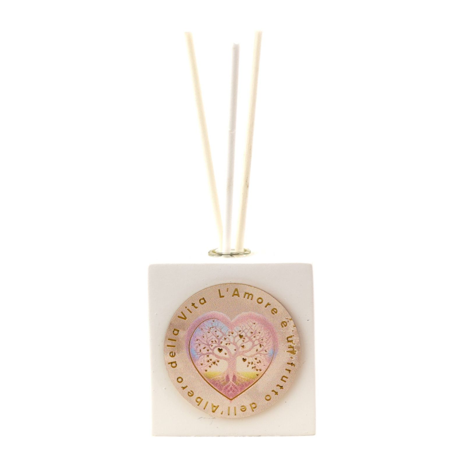 Realizzata in pregiata resina bianca, oro e rosa, questa bomboniera è un simbolo di amore e prosperità. L'albero della vita inciso sul profumatore rappresenta la crescita e la forza della famiglia, mentre il cuore con la frase "L'amore è il frutto dell'albero della vita" aggiunge un tocco romantico e significativo al regalo.