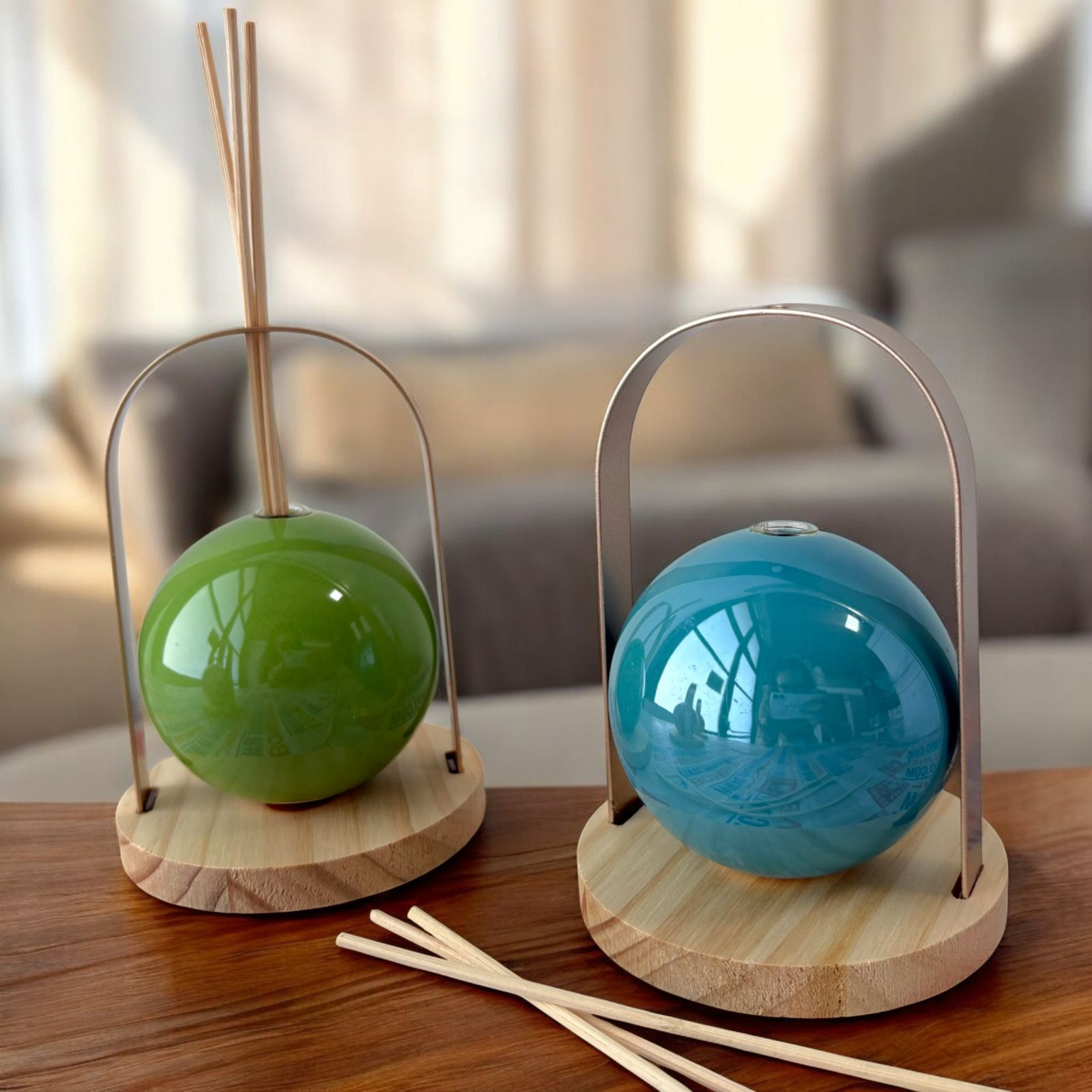 Dimensione: sfera Ø 10 cm circa, altezza 14 cm. Scatola, bastoncini diffusori ed essenza profumata inclusi.
