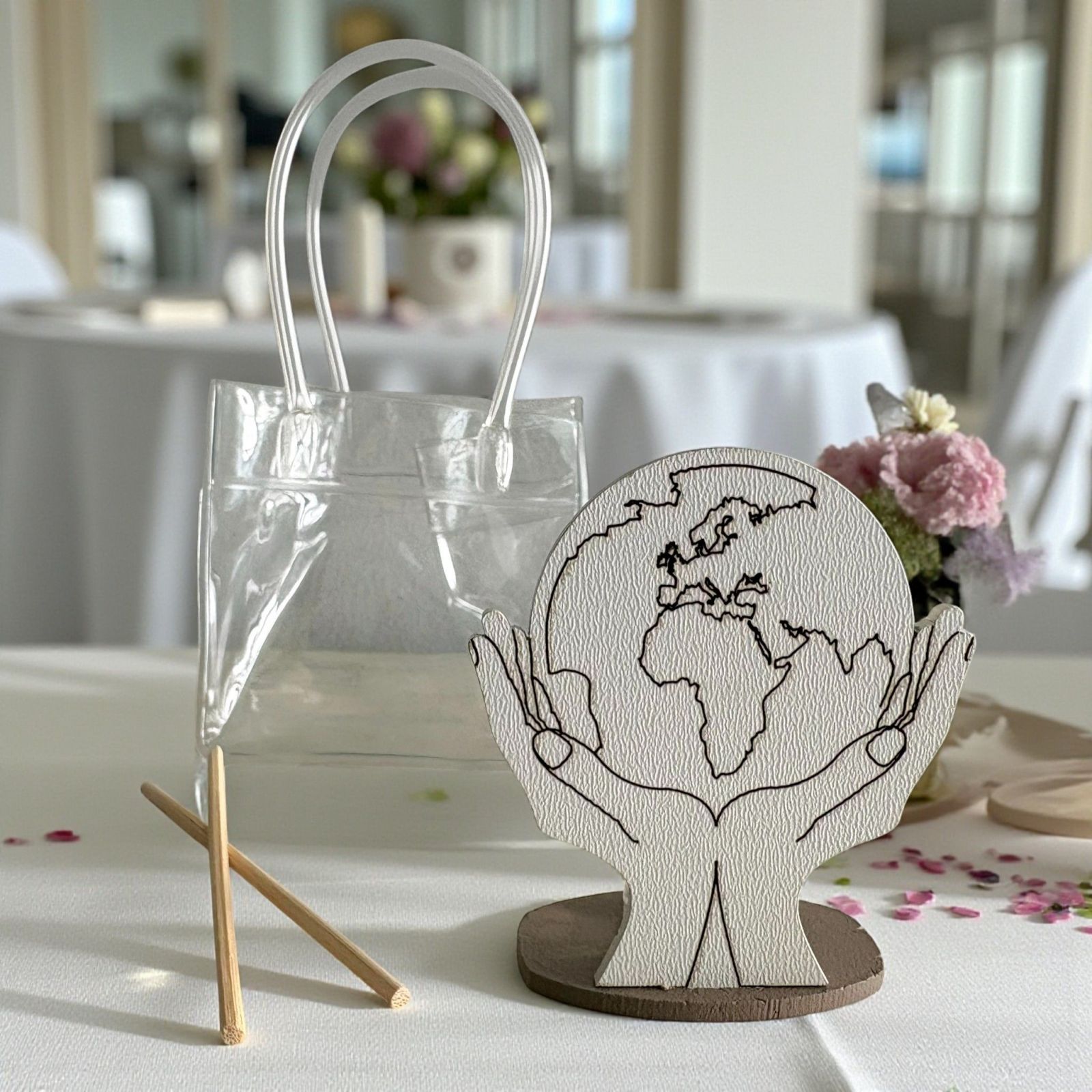 Un originale diffusore essenza a forma di mappamondo sostenuto da mani delicate, perfetto per celebrare l’amore e le avventure condivise. La base rossa con fiore bianco crea un contrasto elegante e simbolico, rendendolo ideale come bomboniera matrimonio o bomboniere anniversario a tema viaggio, capace di emozionare gli invitati con un tocco unico.