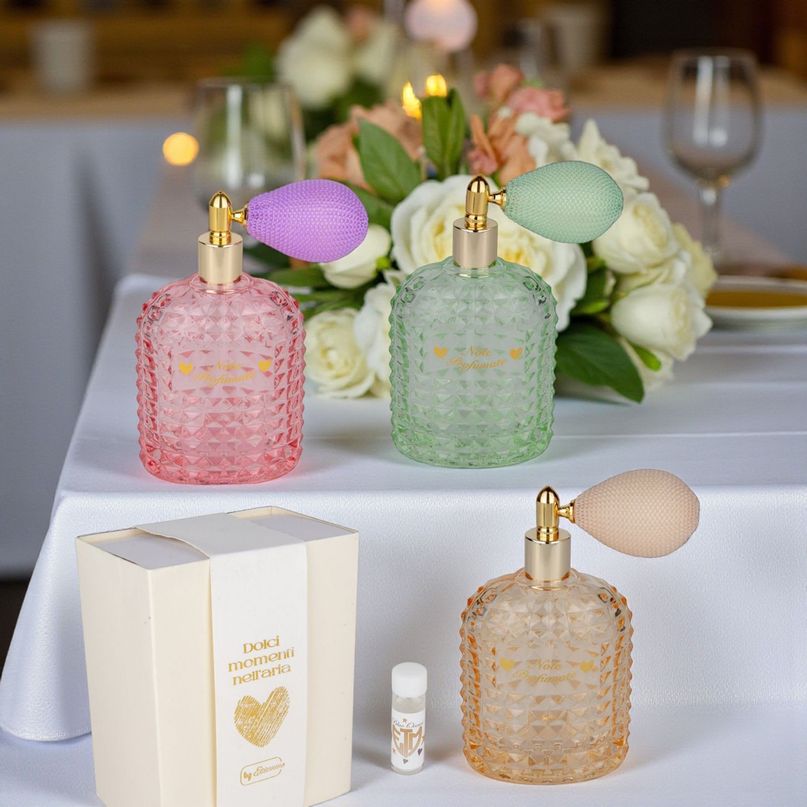 Rendi ogni momento speciale ed indimenticabile con il nostro diffusore spray assortito Iin tre colori e con scritta"Note Profumate". Questo elegante accessorio non è solo una bomboniera, ma un vero e proprio omaggio ai ricordi, pensato per accompagnare le celebrazioni più importanti della tua vita. Perfetto per comunioni, cresime, compleanni e anniversari, rappresenta un gesto affettuoso che porta con sé emozioni e profumi unici.