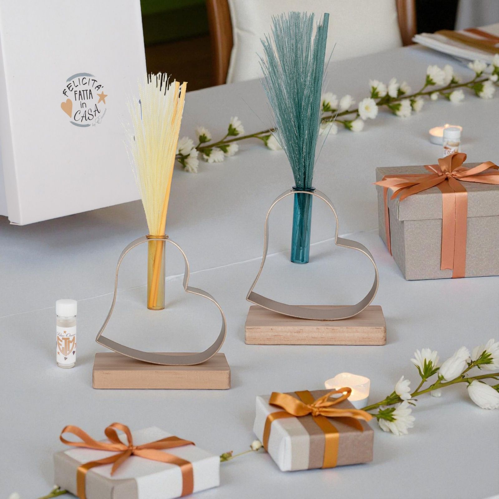 Realizzato in legno e metallo, questo diffusore unisce estetica e praticità. Include scatola regalo ed essenza, rendendolo una bomboniera economica e curata in ogni dettaglio, perfetta per chi cerca idee bomboniere eleganti e sorprendenti.
