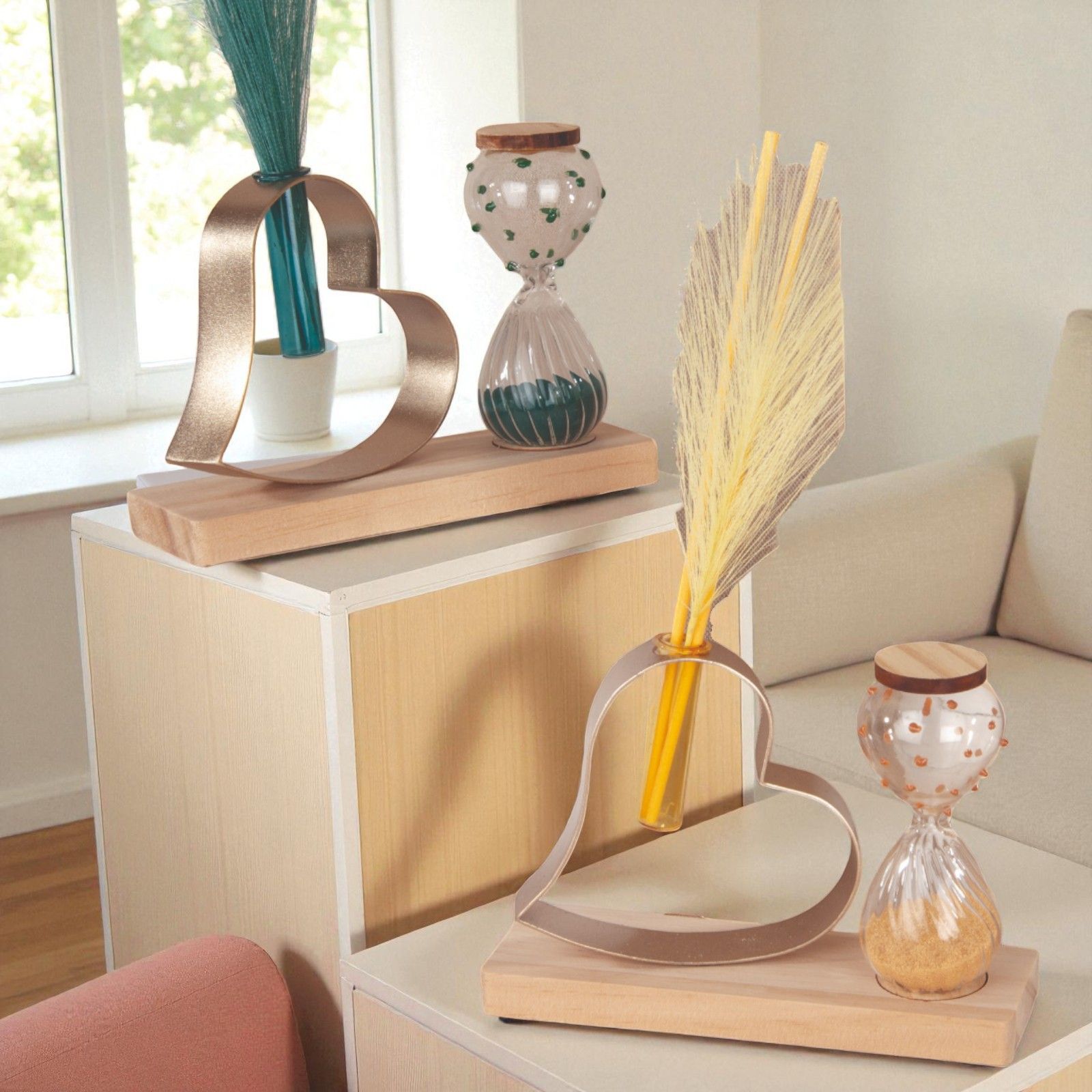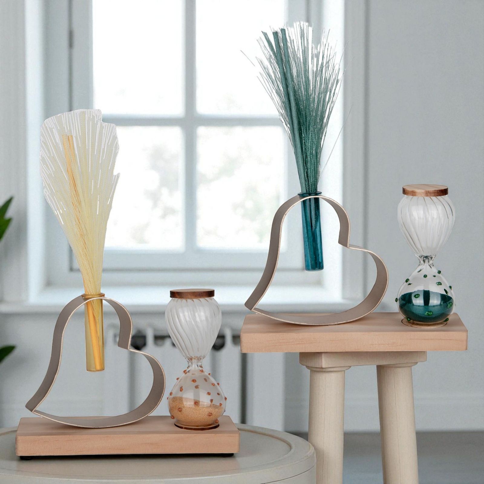 Eleganza e poesia si uniscono in questo profumatore ambiente a forma di cuore, accompagnato da una delicata clessidra con sabbia color ocra o ottanio e dettagli superiori decorativi. Le piume, che fungono da spargiessenza, diffondono la fragranza con leggerezza, trasformando la bomboniera in un oggetto originale e raffinato, perfetto per matrimonio o anniversario.
