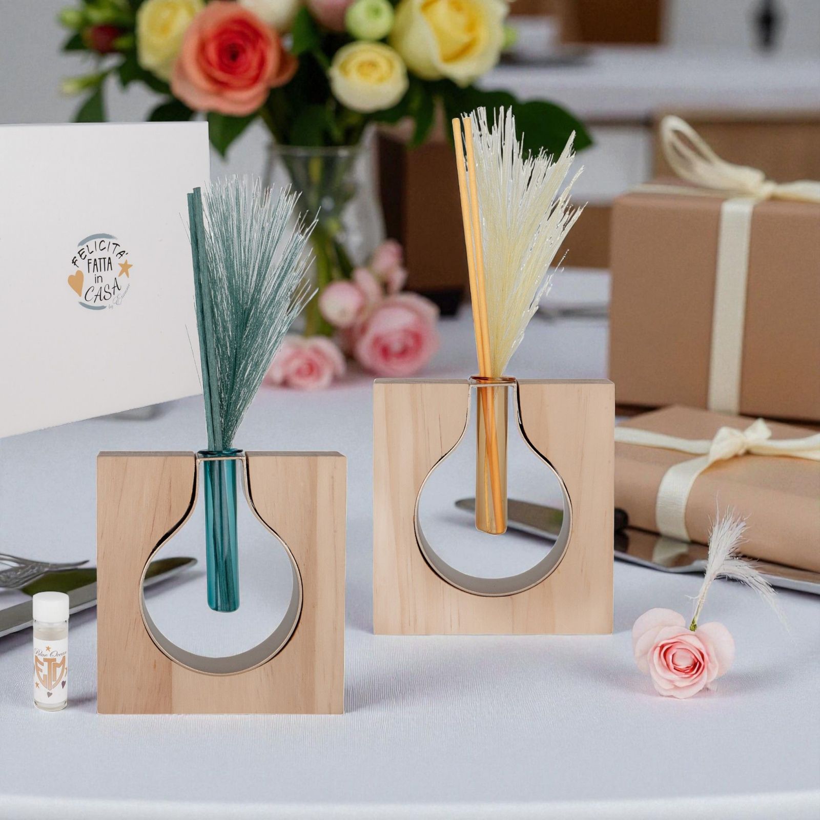 Realizzato in legno di qualità, questo profumatore è elegante e economico. La scatola regalo e la boccetta con essenza inclusa nel prezzo completano la bomboniera, rendendola una proposta curata e preziosa per gli invitati.