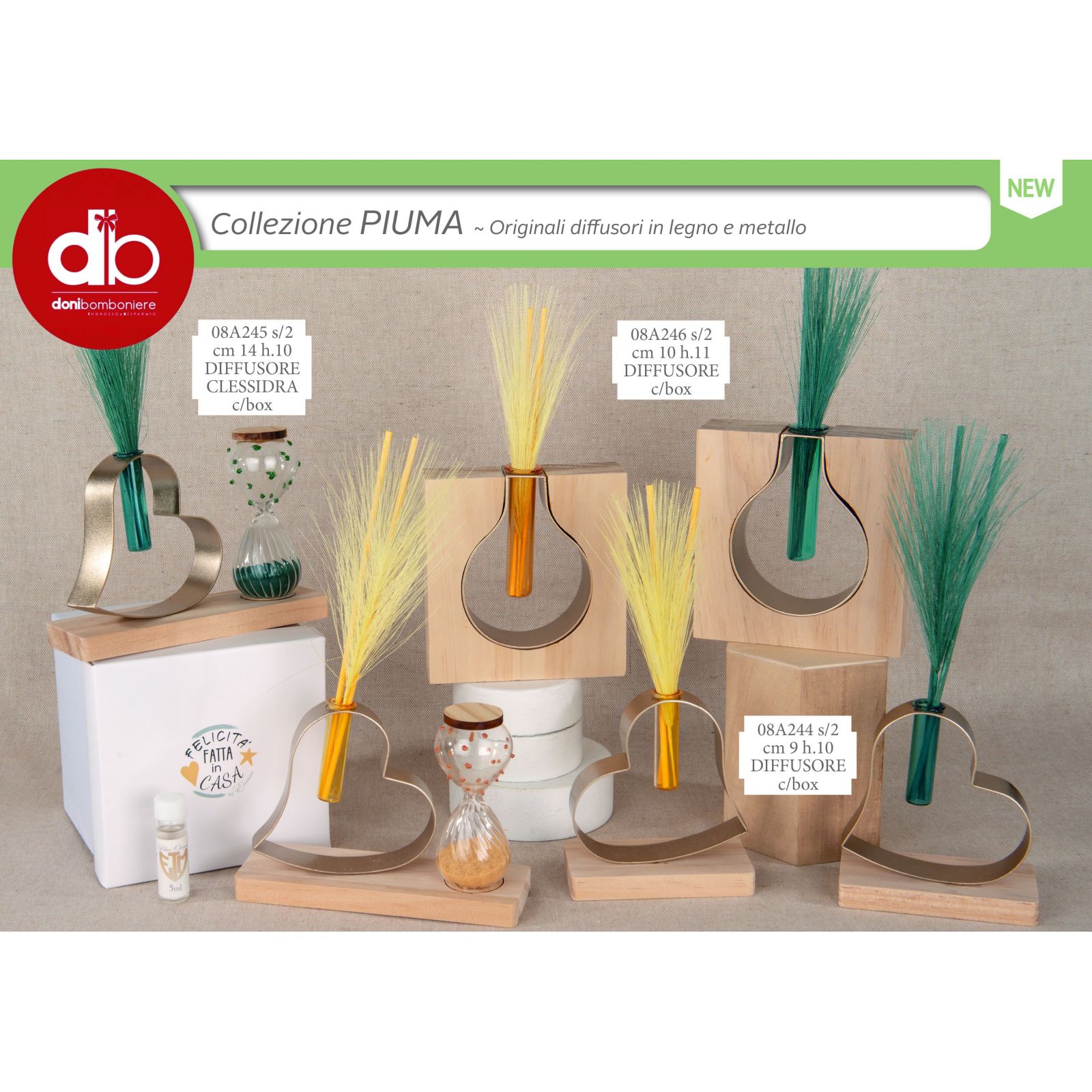 Elegante e delicato, questo profumatore ambiente a forma di goccia unisce stile e funzionalità. La base in legno sostiene piume disponibili in colori assortiti, ocra o ottanio, che diffondono la fragranza in modo armonioso, trasformando la bomboniera in un oggetto originale e raffinato, ideale per matrimonio o anniversario.