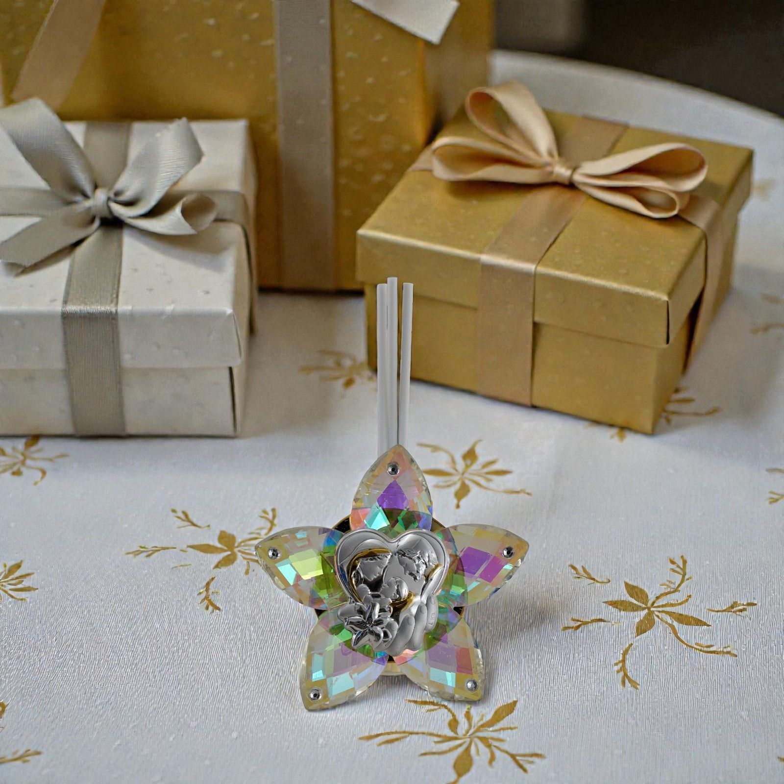 Realizzato in pregiato cristallo, il nostro diffusore si distingue per la sua placchetta argentata decorata con dettagli dorati, rendendolo una delle bomboniere più originali e economiche in circolazione. Confezionato con cura, questo articolo artigianale è non solo un regalo, ma un pezzo d’arte che arricchisce ogni ambiente, evocando emozioni profonde e ricordi preziosi.