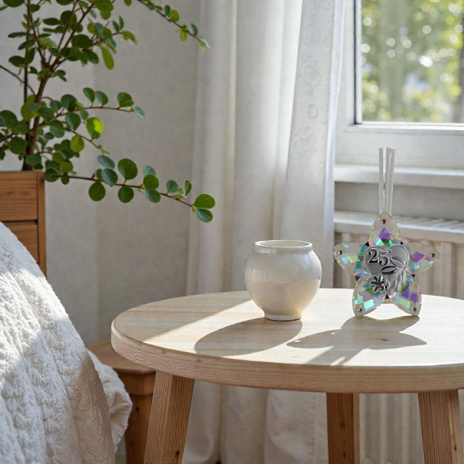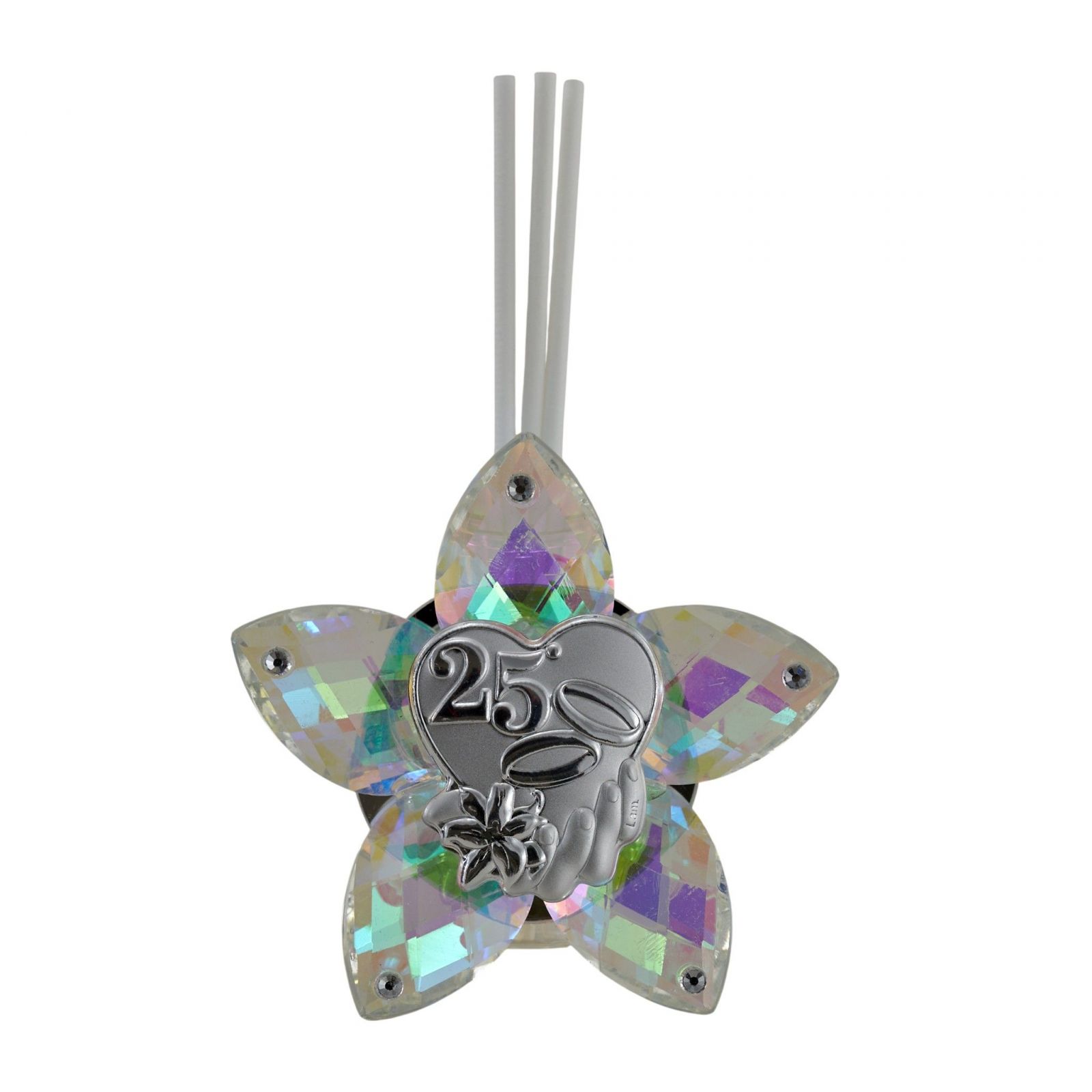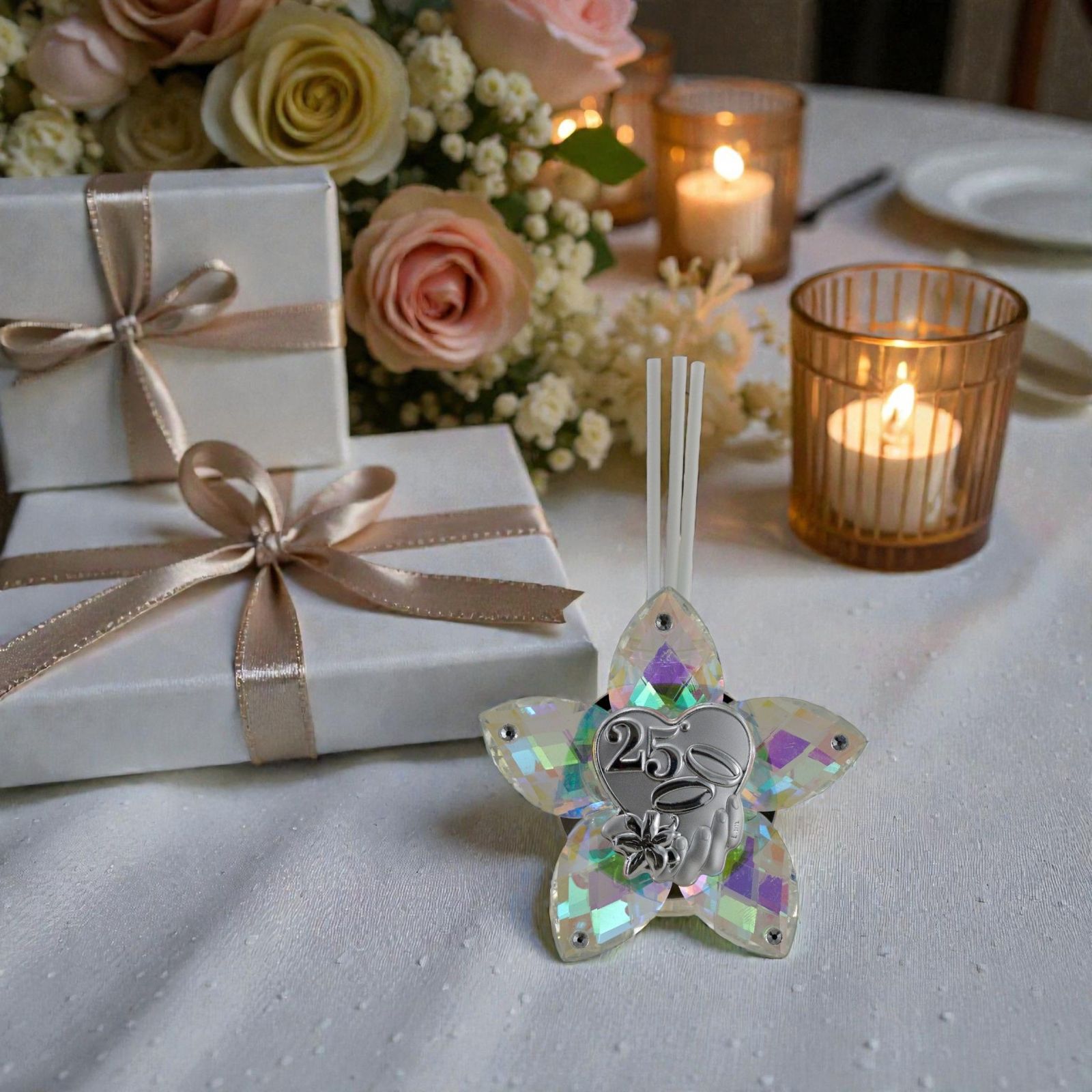 Rendi il tuo anniversario un momento indimenticabile con la nostra bomboniera esclusiva: un diffusore ambiente a forma di fiore, che non solo arreda, ma trasmette anche emozioni profonde. La delicata placchetta a forma di cuore, tenuta da una mano, simboleggia l’unione e l’amore eterno, mentre il numero 25 insieme alle fedi rappresenta un traguardo significativo e prezioso. Questa bomboniera diventa così molto più di un semplice oggetto: è un messaggero di affetto e ricordi da condividere con i tuoi cari.