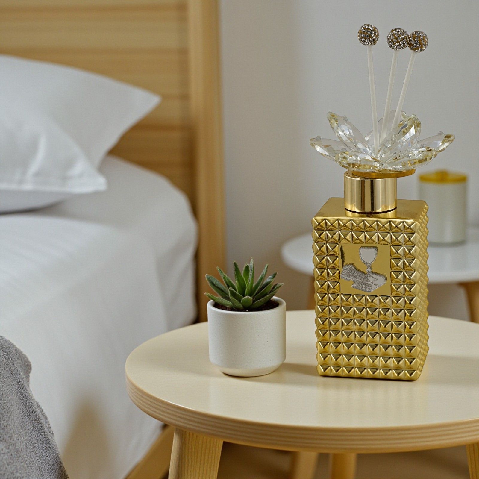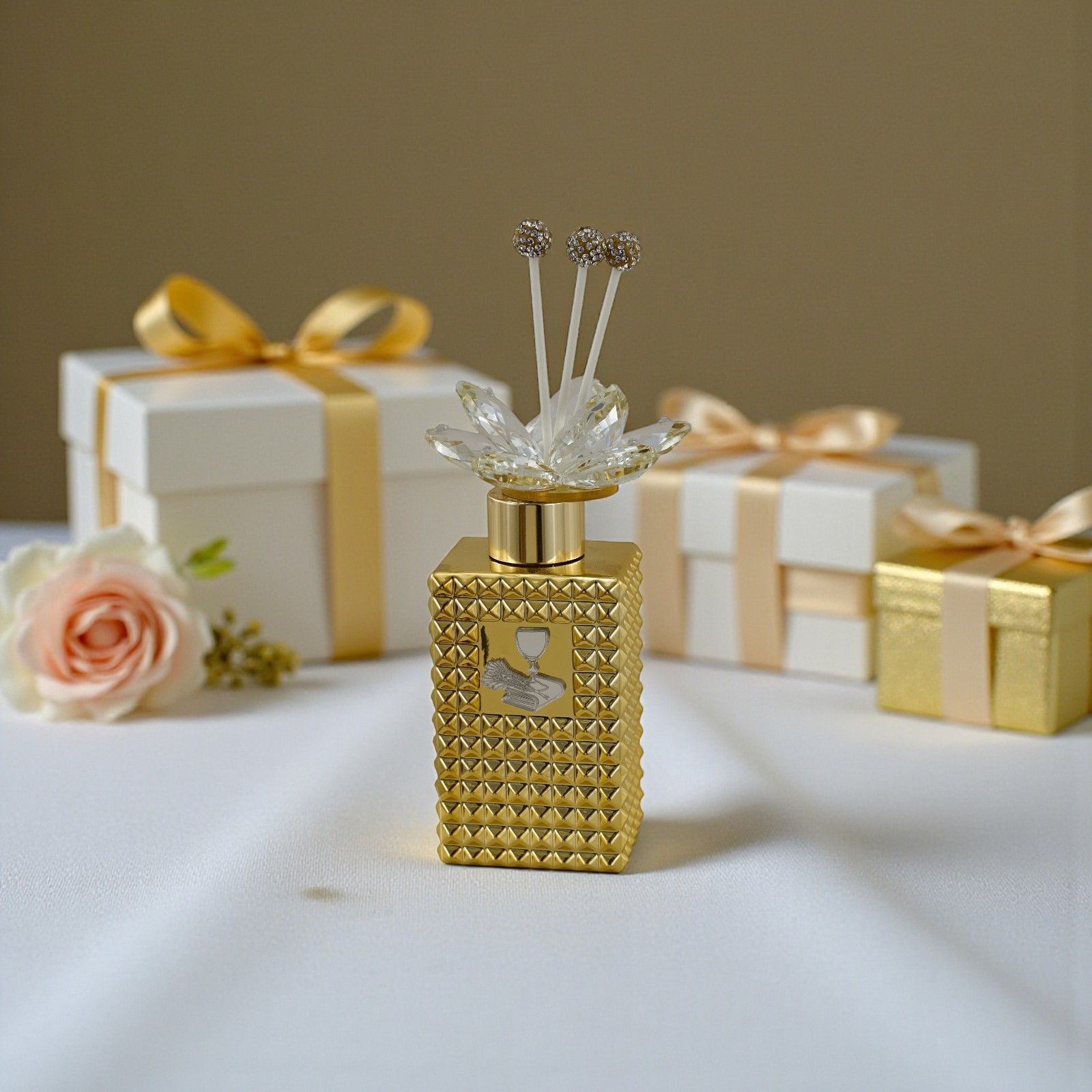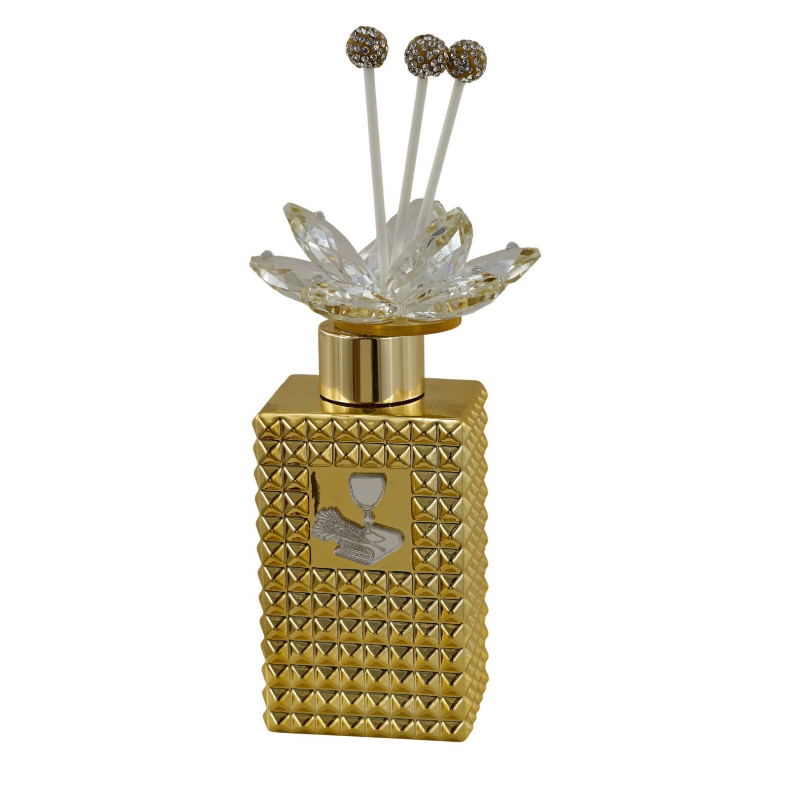 Lasciati avvolgere dalla magia di questo diffusore ambiente con tappo decorato da un delicato fiore in swarovsky. Un'idea unica per rendere indimenticabile il giorno della prima comunione. La raffigurazione di simboli sacri, combinata con l’eleganza del colore oro, trasforma questo oggetto in una vera e propria opera d’arte, perfetta da regalare come bomboniera.
