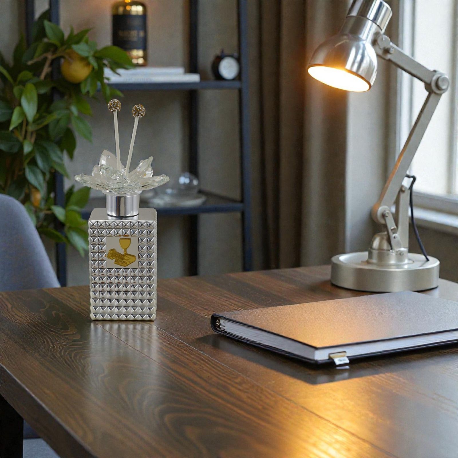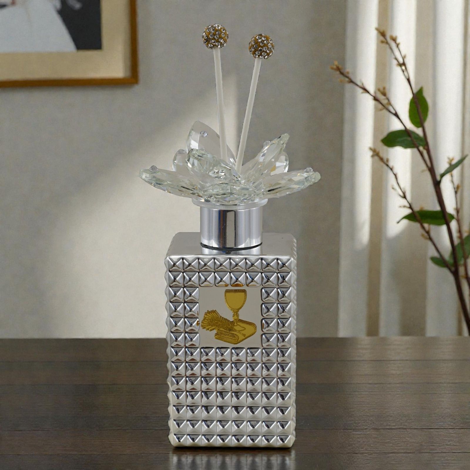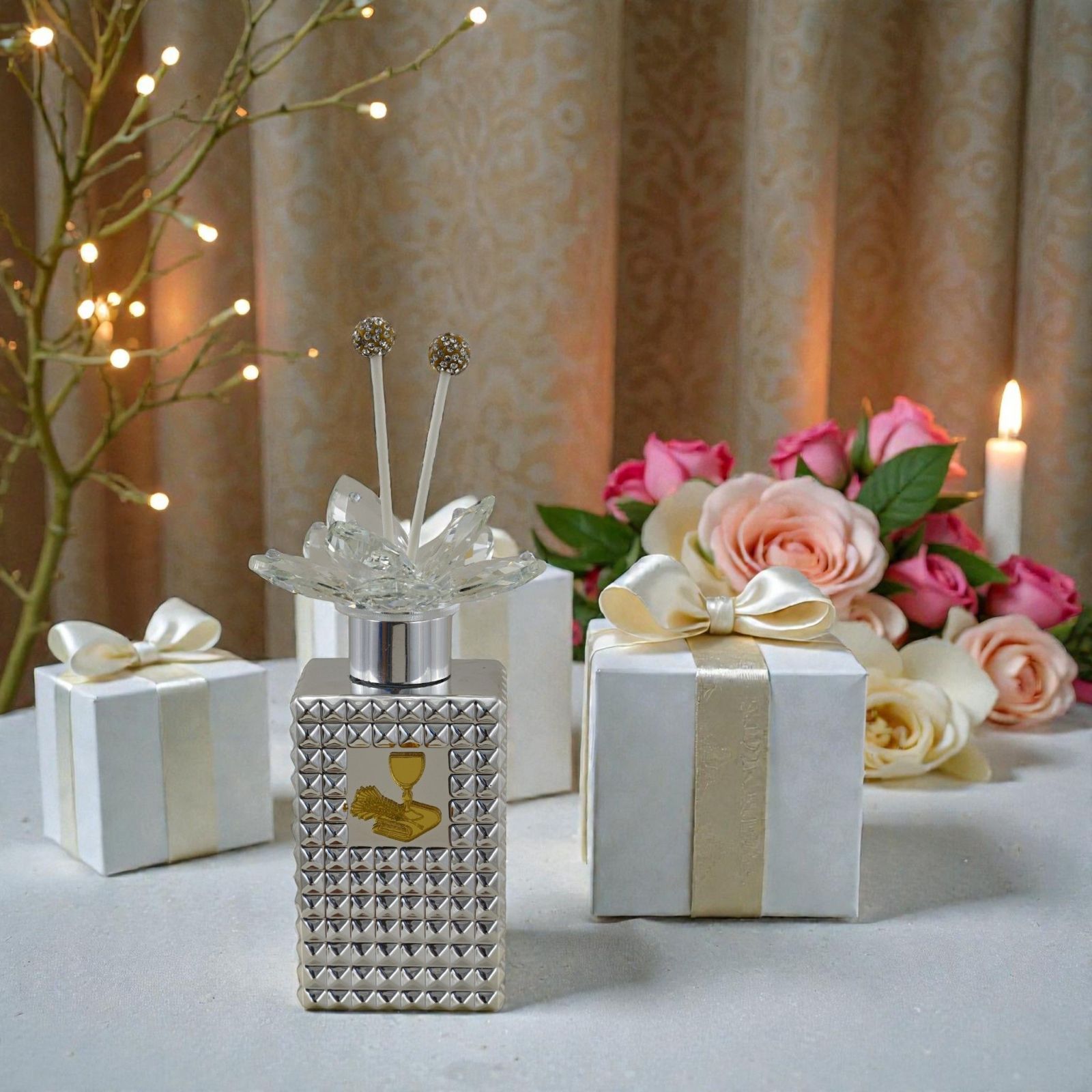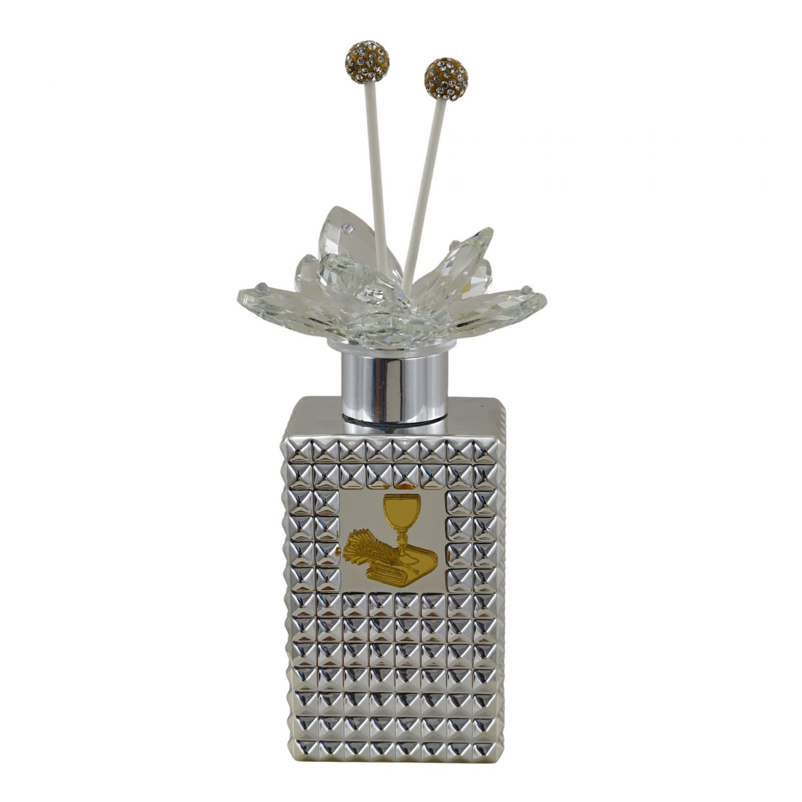 Abbandonati alla magia di un momento che rimarrà nel cuore. Questo diffusore ambiente color argento con tappo finemente decorato da un fiore in swarovsky è molto più di un semplice ornamento: è un simbolo di affetto e devozione, perfetto per celebrare la prima comunione del tuo bambino. Ogni volta che il profumo si diffonde nell'aria, ricorderà a tutti la sacralità di questo giorno speciale.