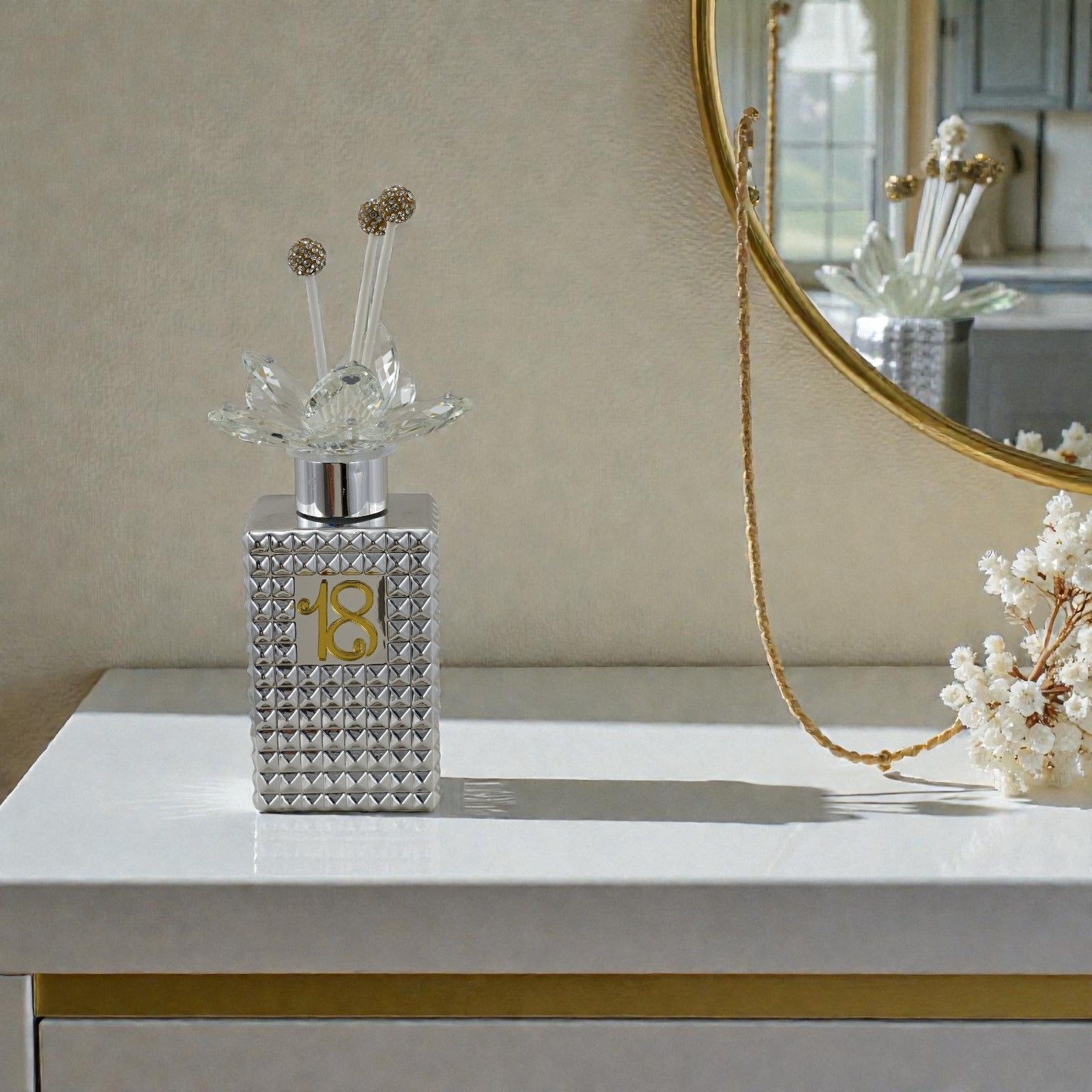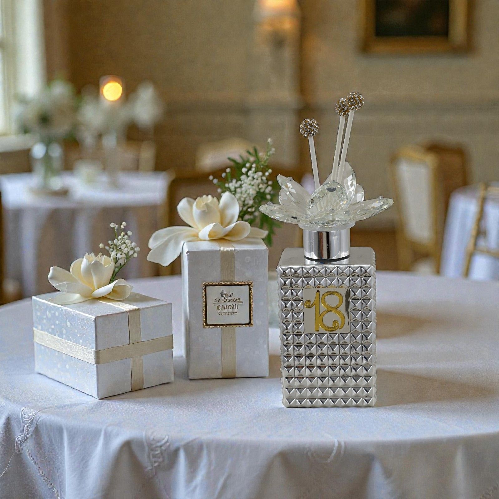 Lasciati conquistare dall'eleganza del nostro profumatore ambiente con numero 18, un’idea bomboniera unica per celebrare il diciottesimo compleanno in modo indimenticabile. Questo raffinato oggetto non è solo un elemento decorativo, ma un simbolo di un traguardo importante, capace di trasmettere emozioni e ricordi speciali.