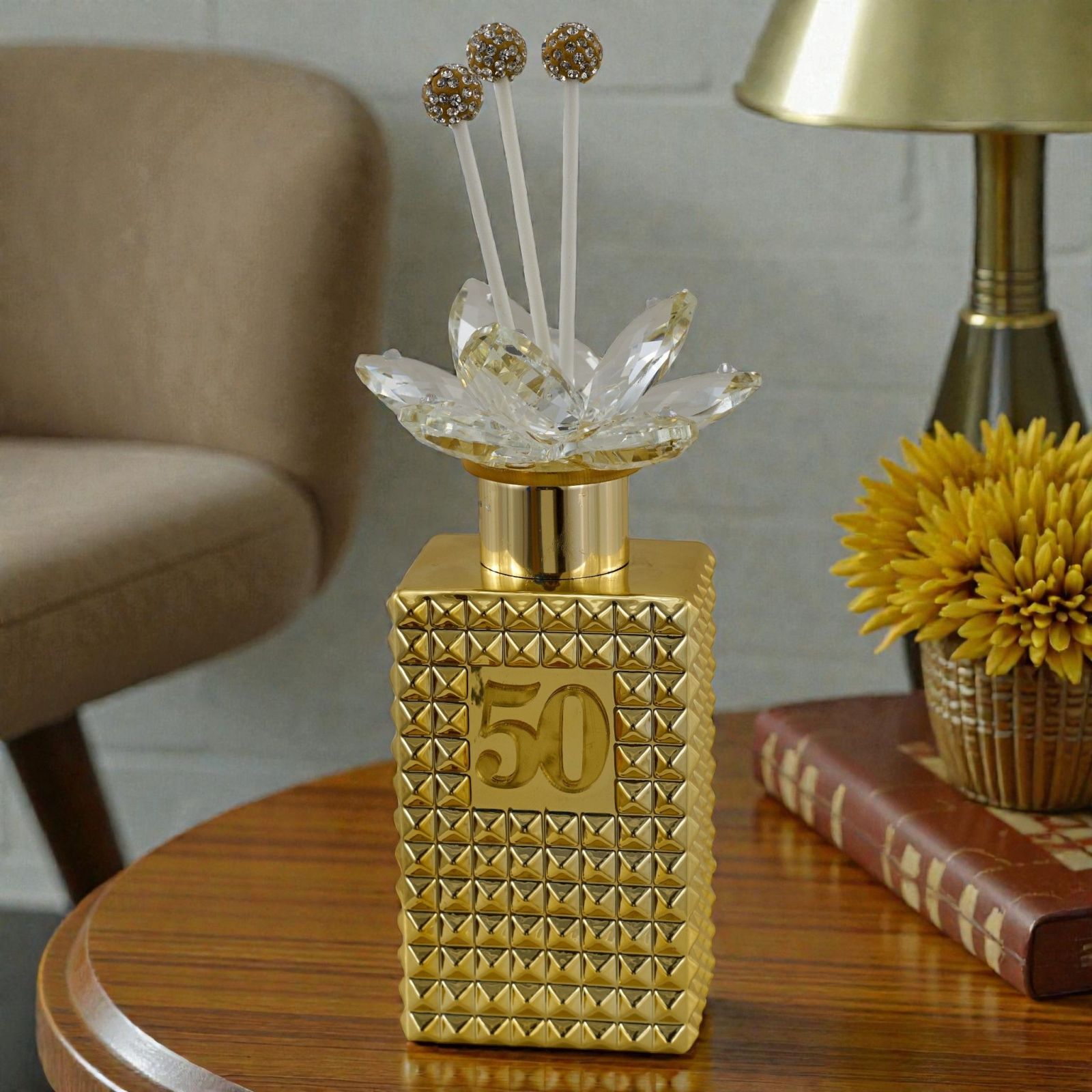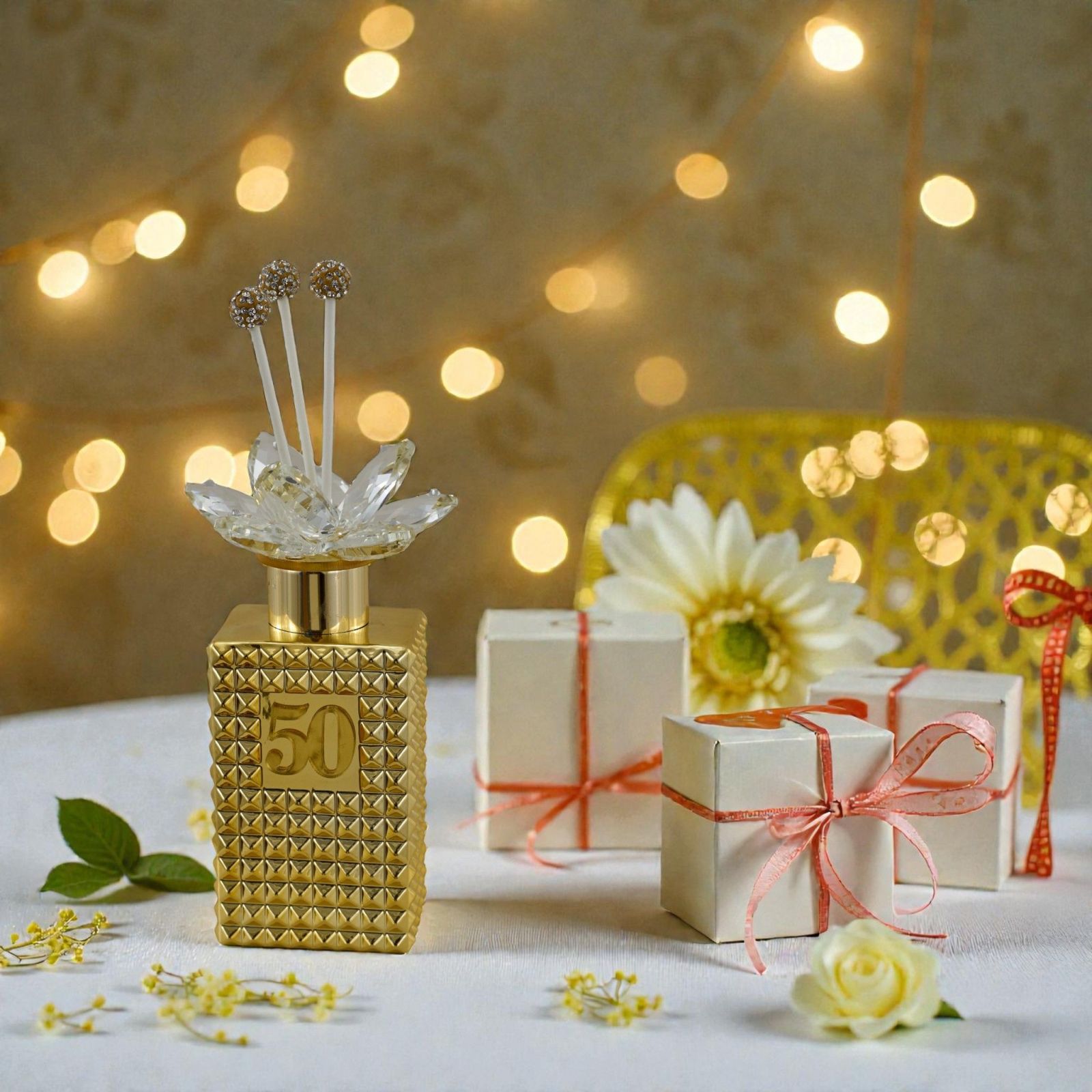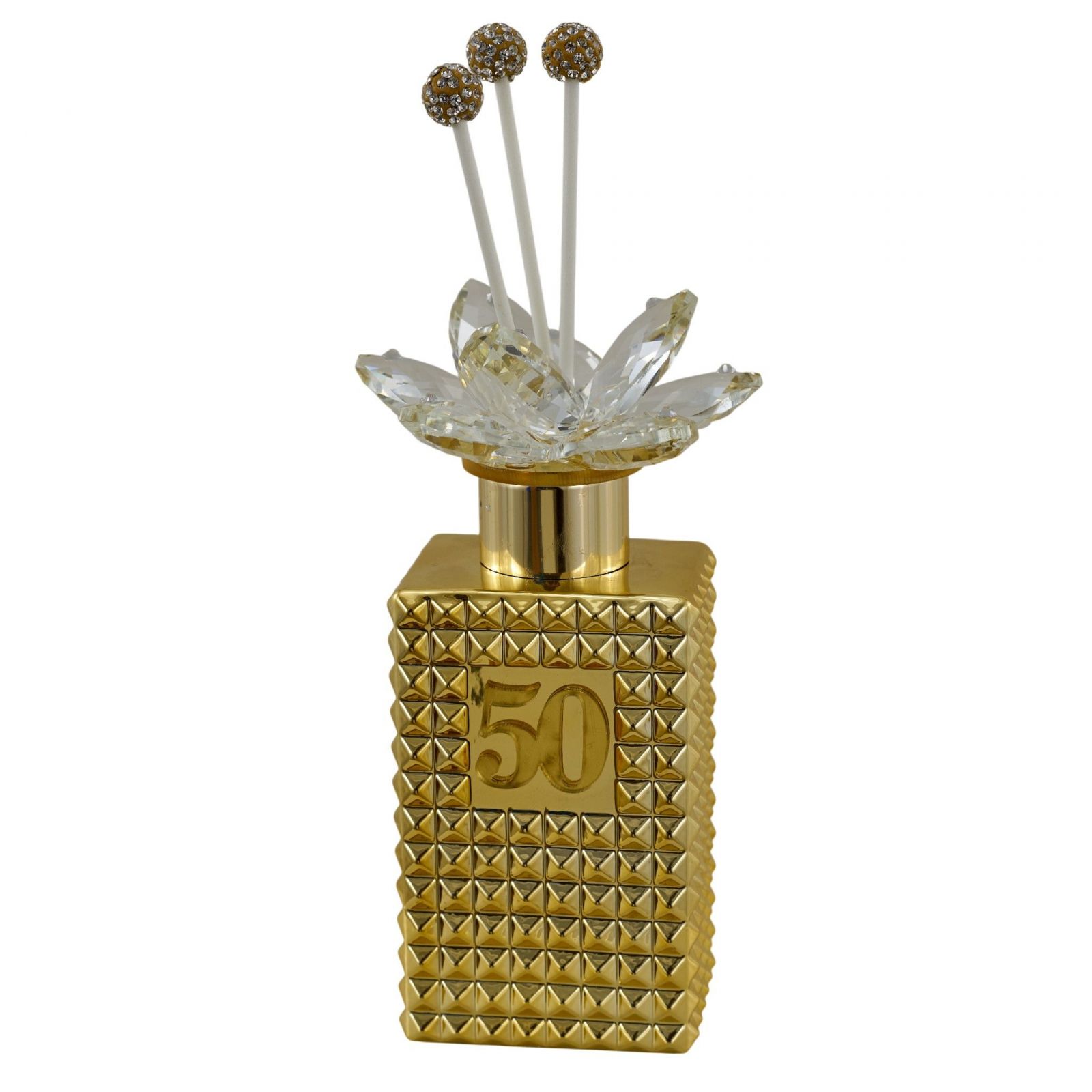 Lascia che il tuo anniversario sia un momento indimenticabile con la nostra bomboniera profumatore ambiente numero 50. Questo raffinato regalo non è solo un oggetto, ma un simbolo di affetto e di ricordi preziosi da condividere con le persone a te più care. La sua eleganza in oro e il delicato fiore in swarovsky cattureranno l'attenzione di tutti, rendendolo un elemento distintivo per celebrare l'amore eterno.